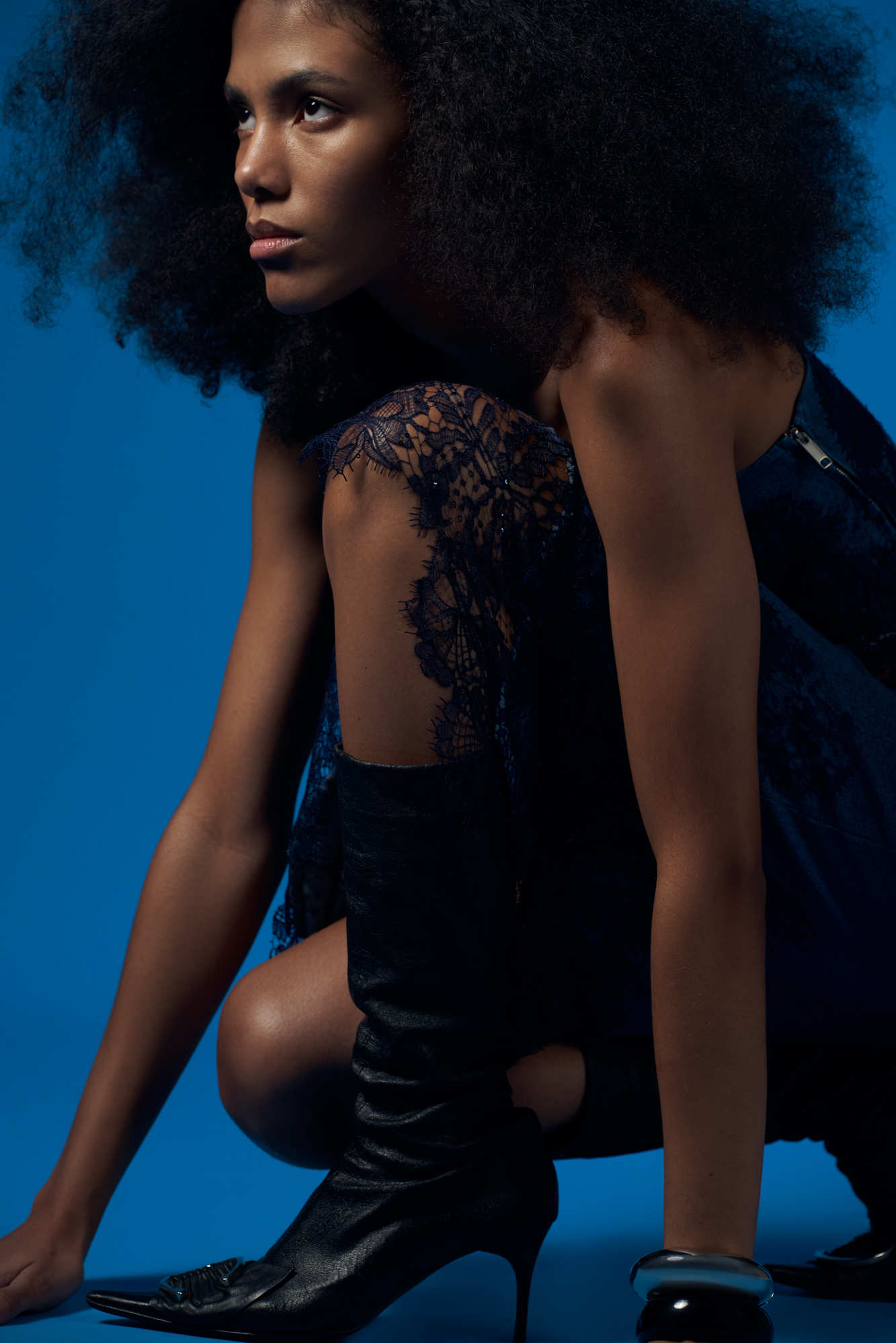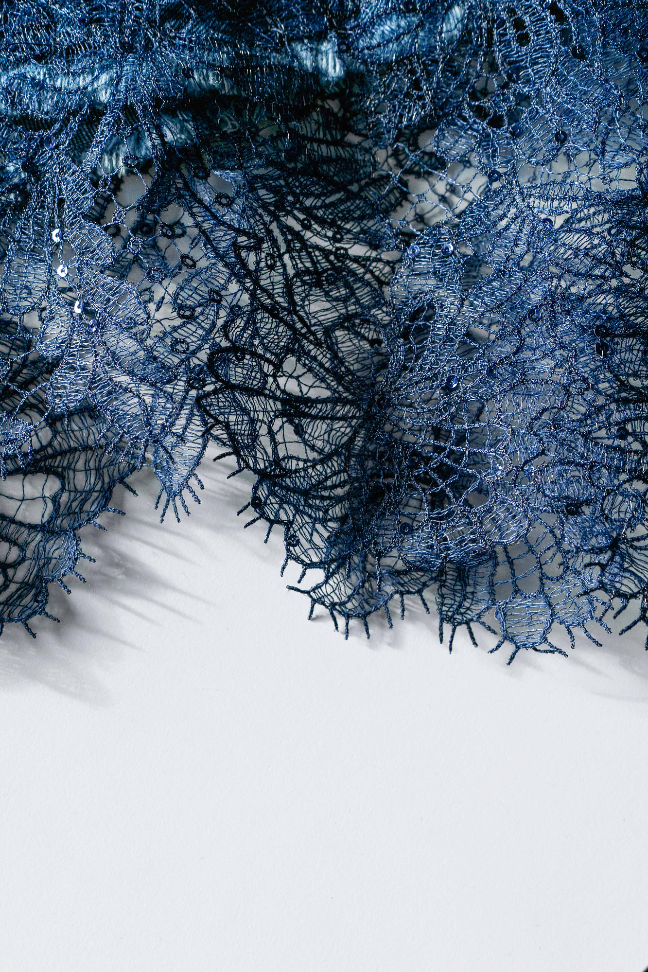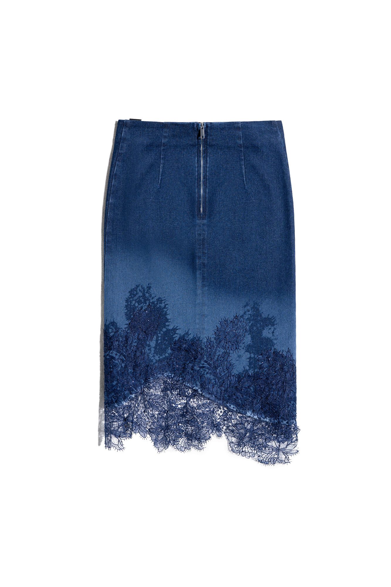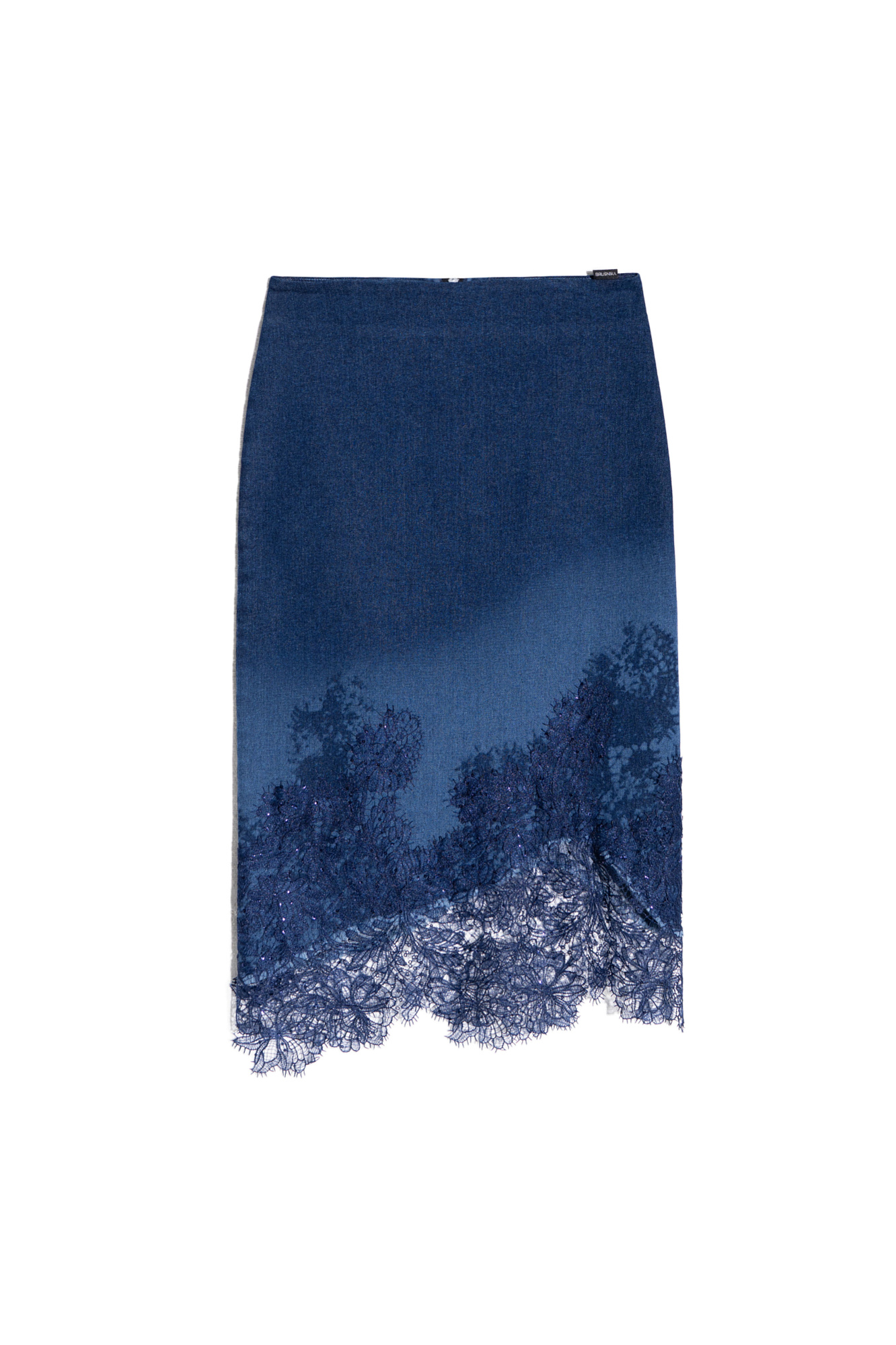 Джинсовая юбка длины миди с градиентным принтом. Модель приталенного силуэта с асимметричным низом, декорированным кружевом и пайетками. Застежка на молнию.