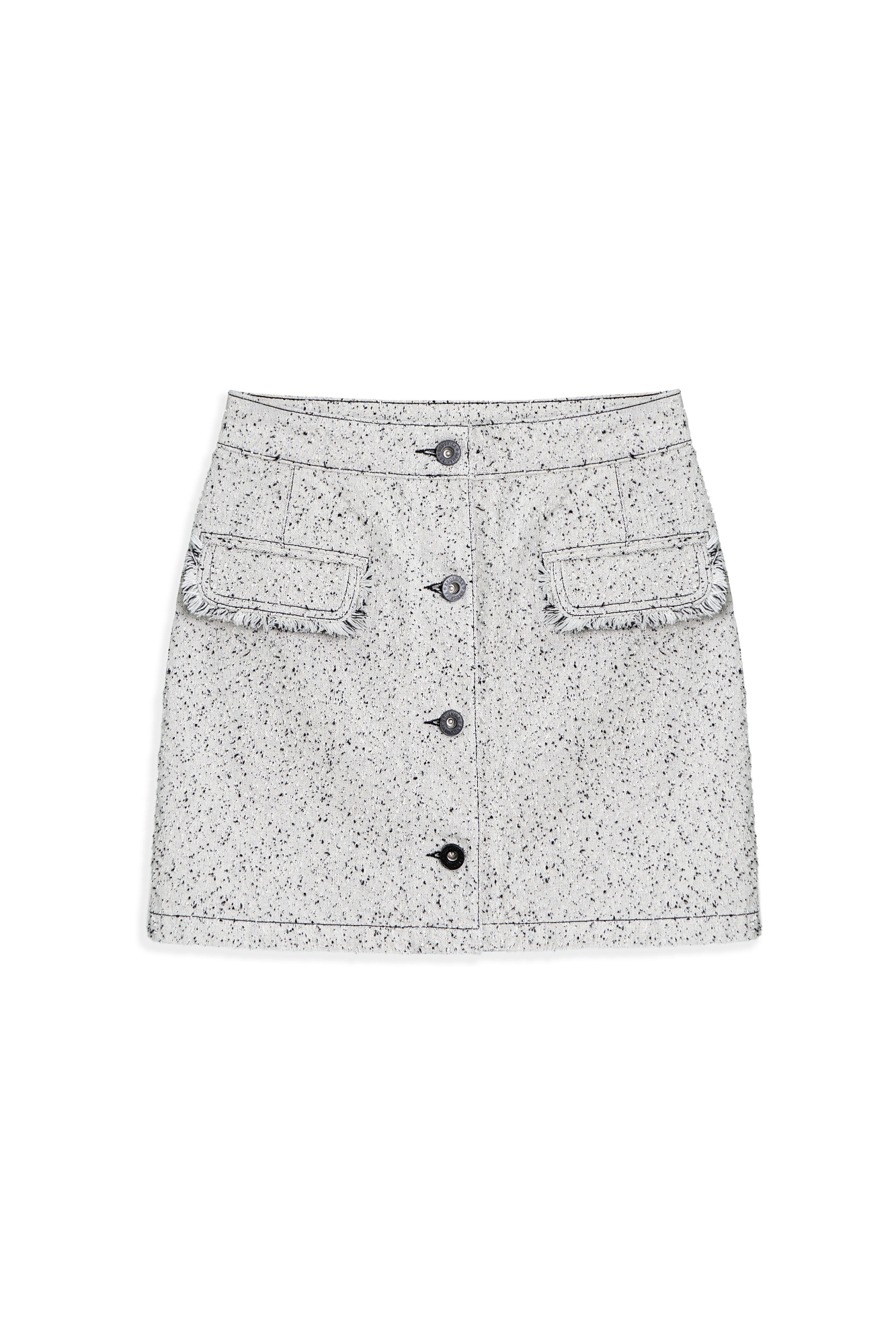 Джинсовая юбка длины мини из 100% хлопка. Изделие декорировано бахромой на карманах. Застежка на металлические пуговицы. Дополнить образ можно жакетом в таком же стиле.