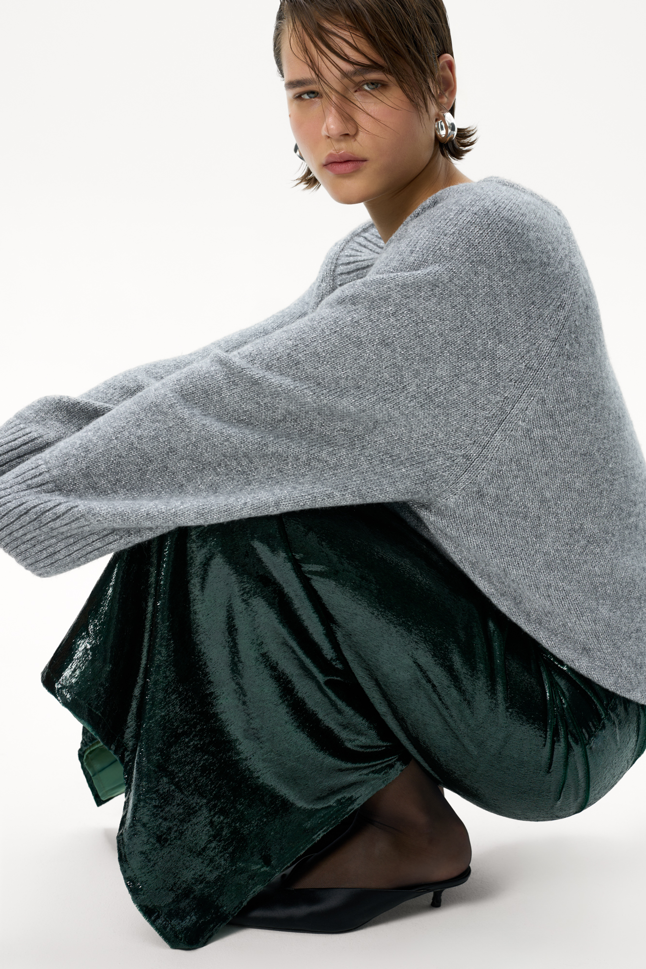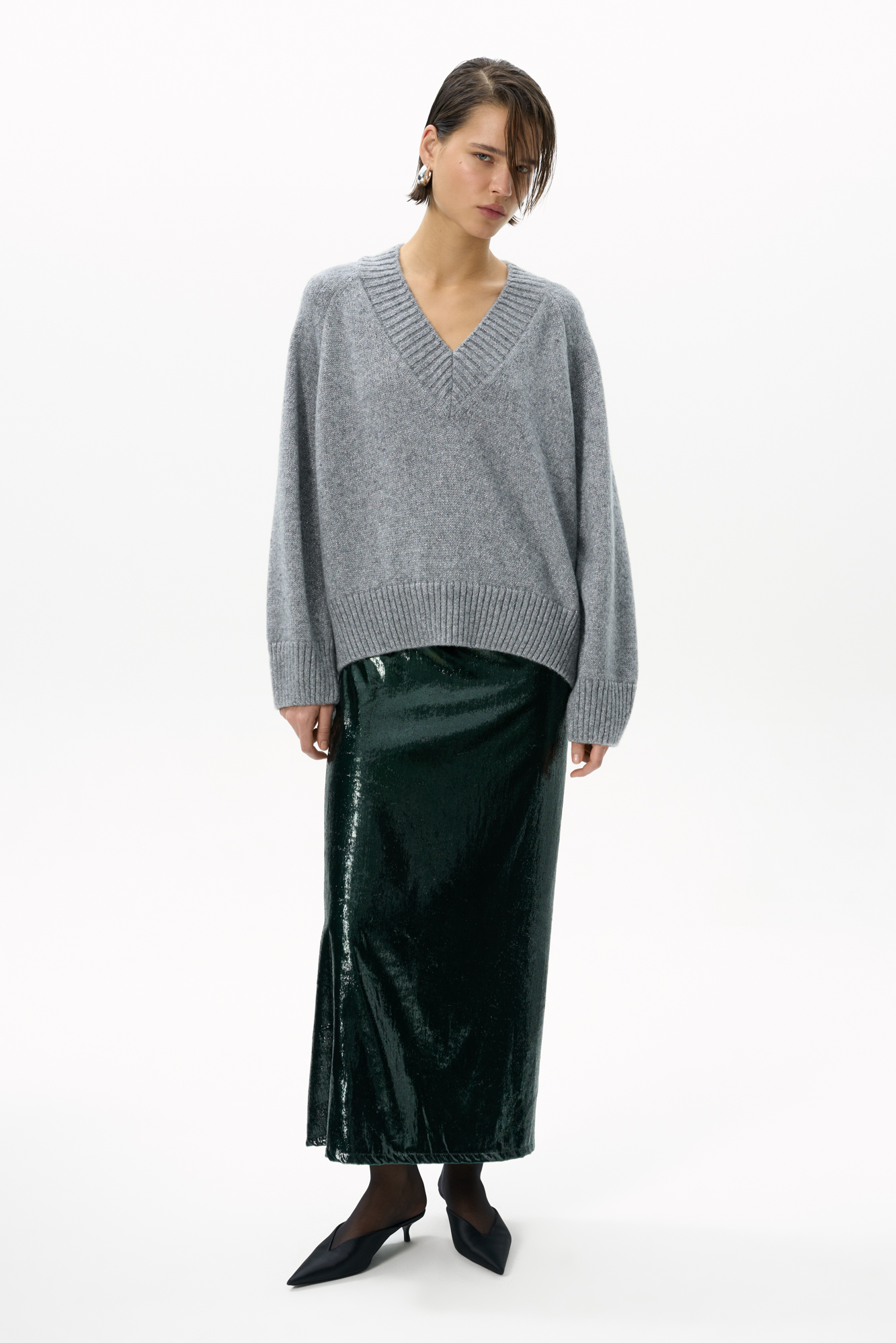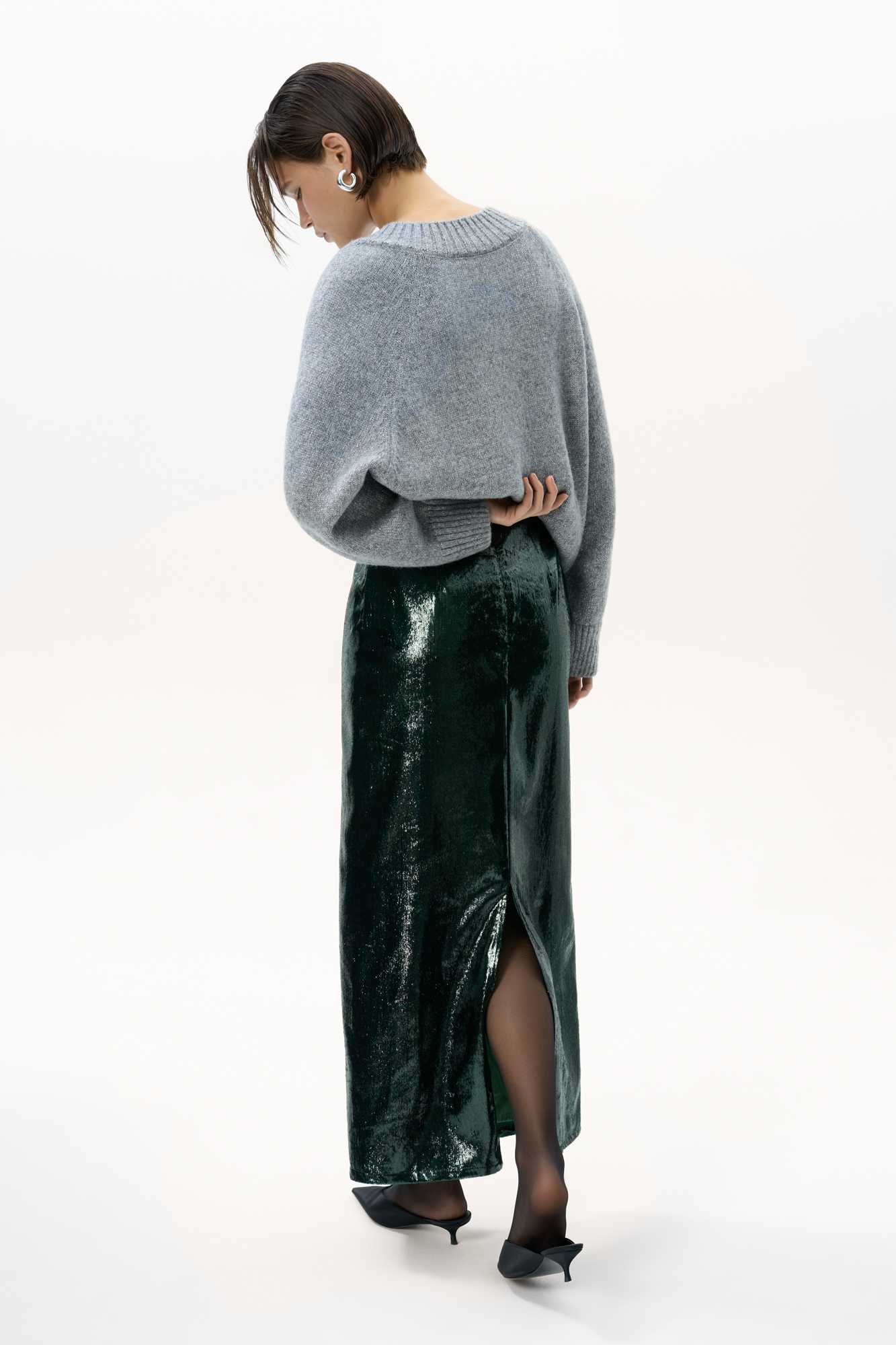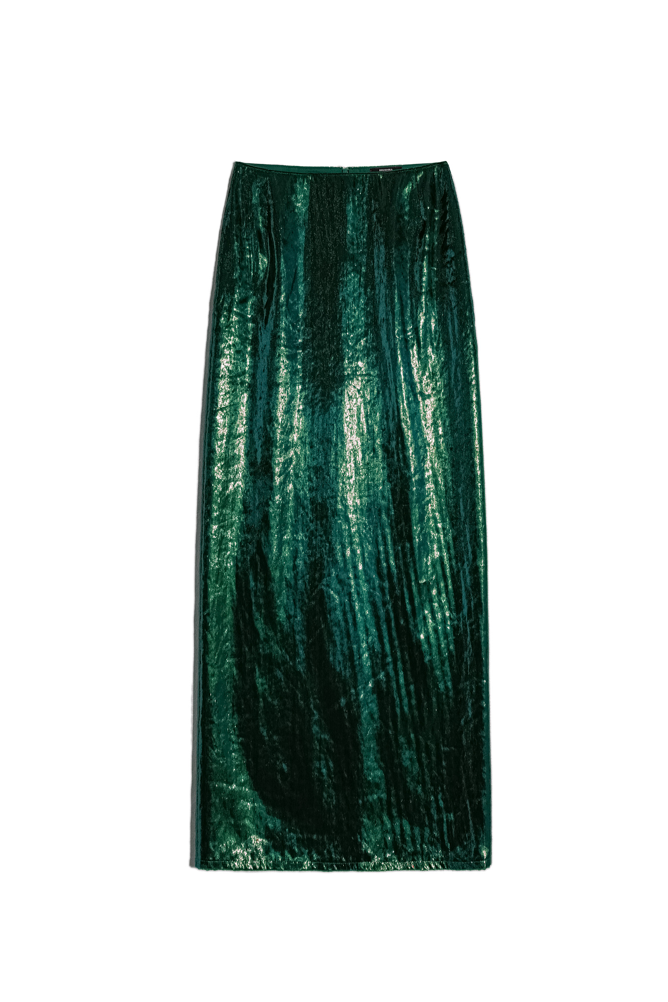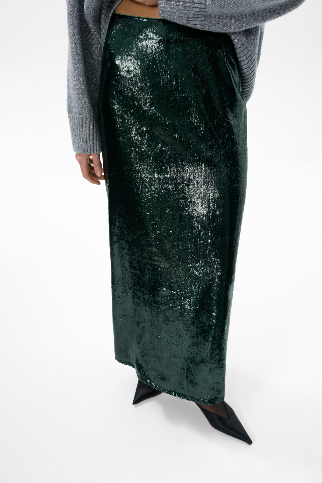 Блестящая юбка длины миди. Модель прямого силуэта, с разрезом и застежкой на молнию сзади. Изделие выполнено на подкладке.