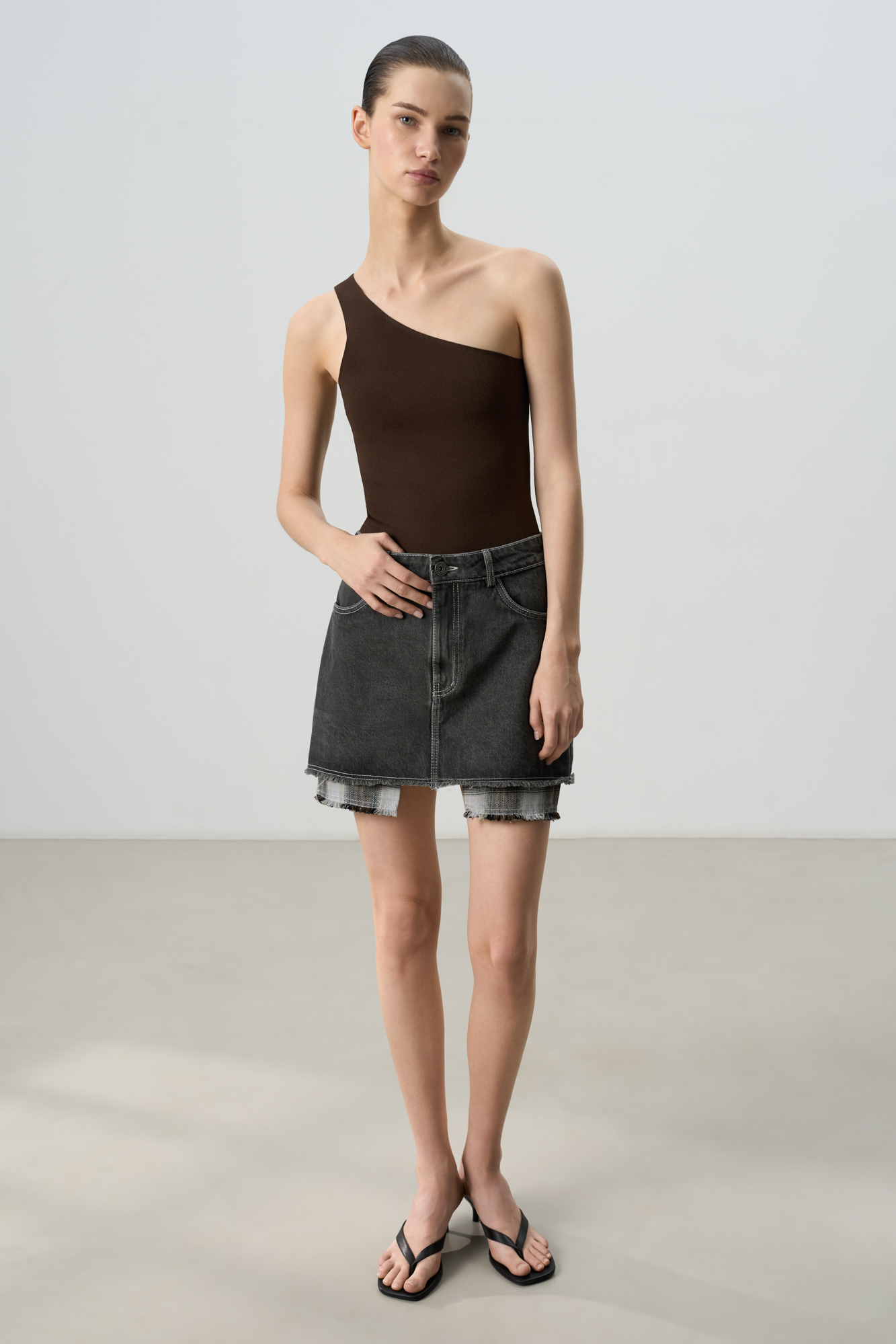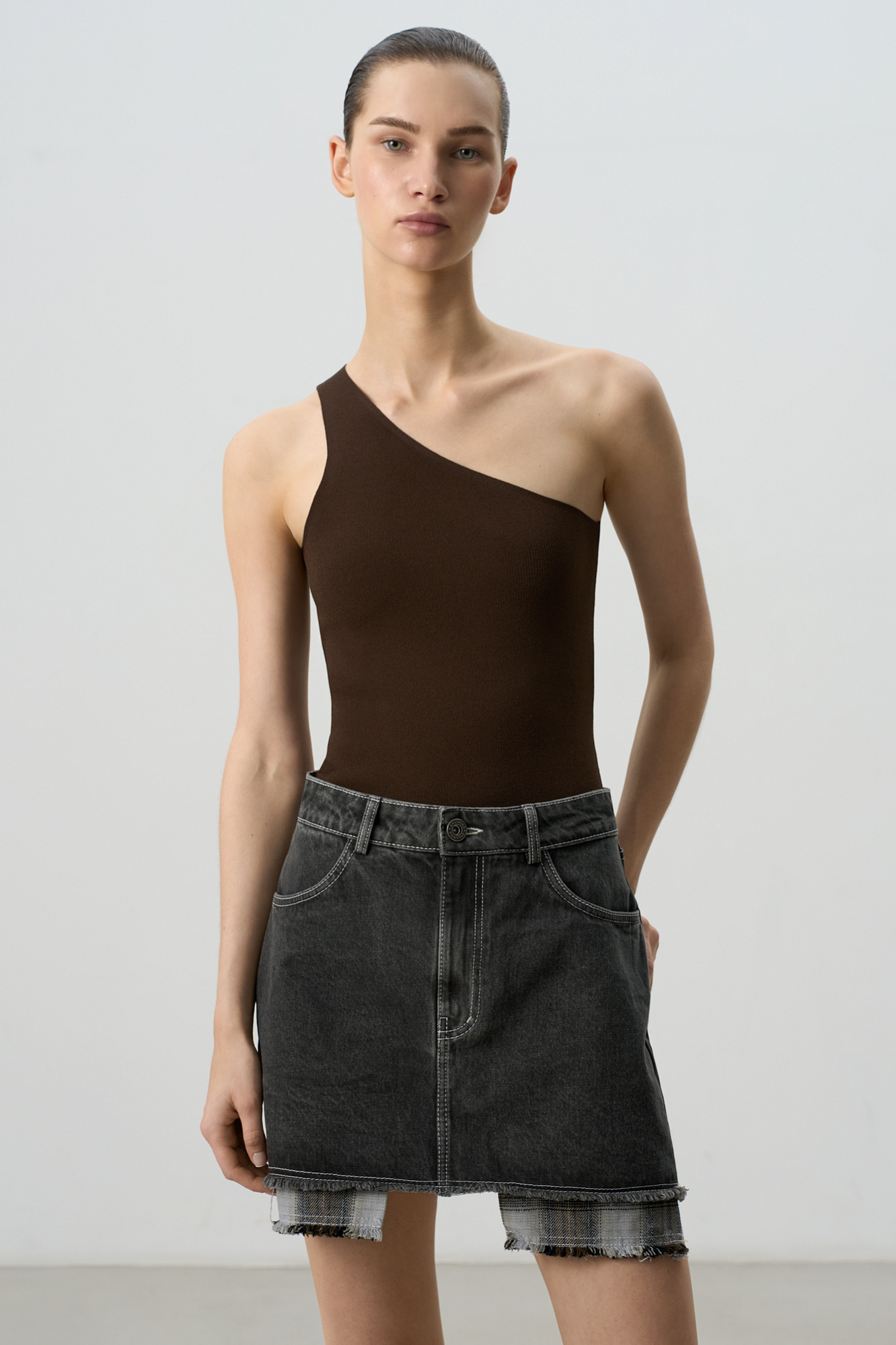Джинсовая юбка длины мини из 100% хлопка. Модель декорирована бахромой по нижнему краю и имитацией подкладки из клетчатой ткани. Шлевки на поясе для ремня и застежка на молнию и пуговицу. 4 кармана.