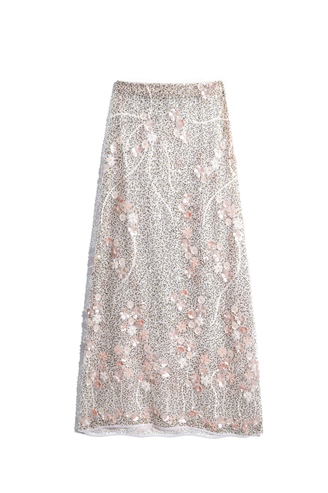 Юбка длины макси с цветочным орнаментом, вышитым пайетками и бисером. Застежка на потайную молнию. Изделие без подкладки.