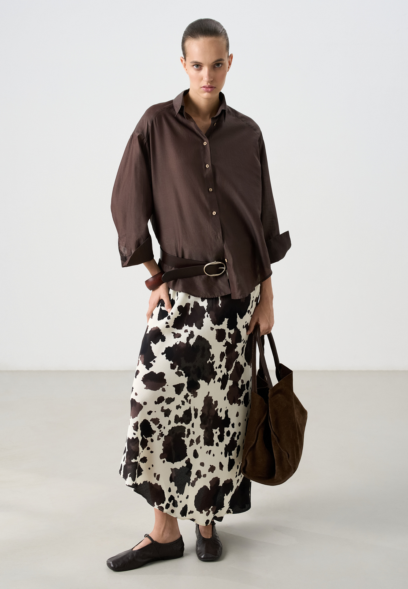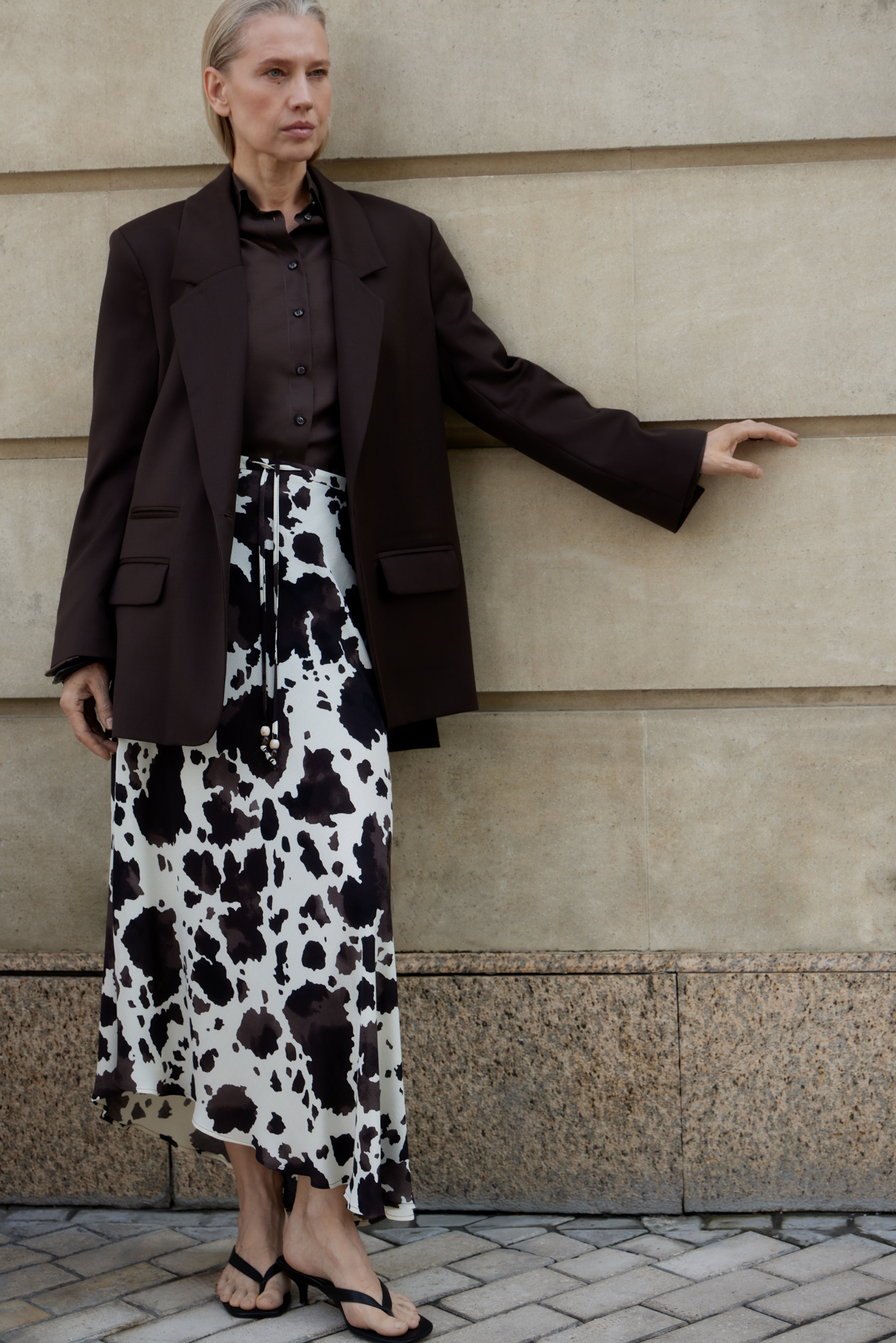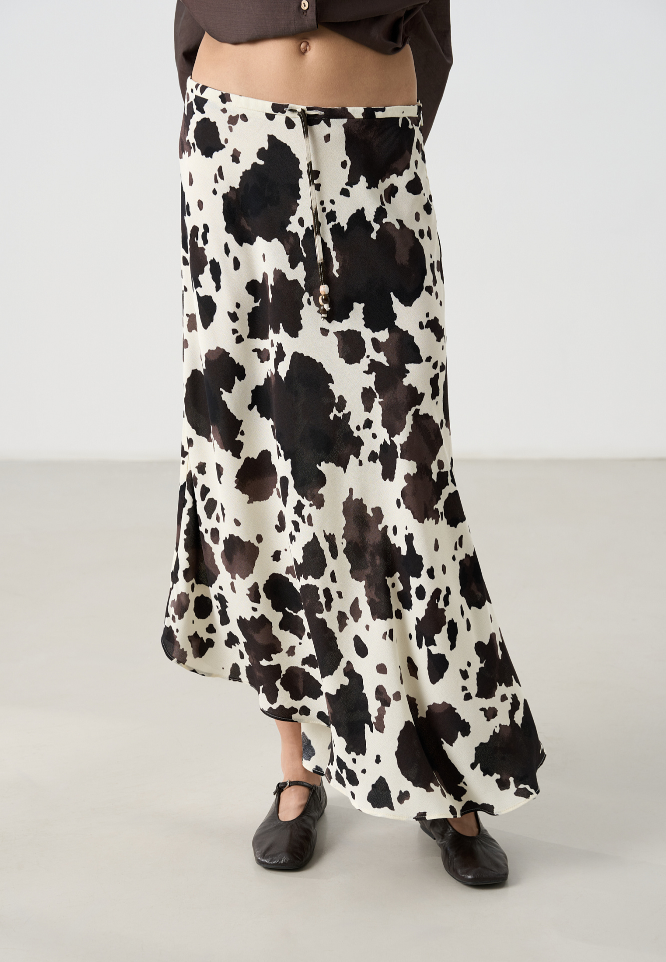 Принтованная юбка длины миди из 100% вискозы. Модель приталенного силуэта, со струящейся расклешенной юбкой и поясом на кулиске. Застежка на потайную молнию.
