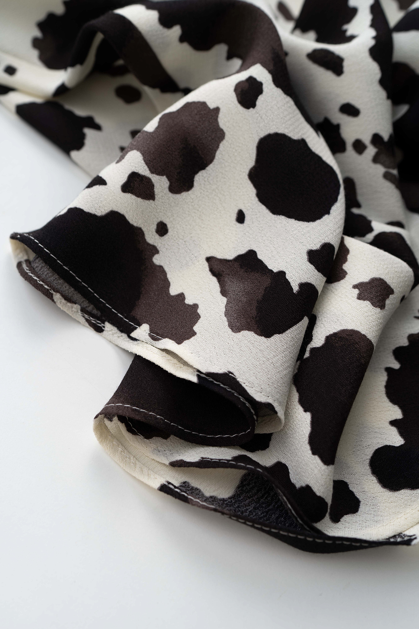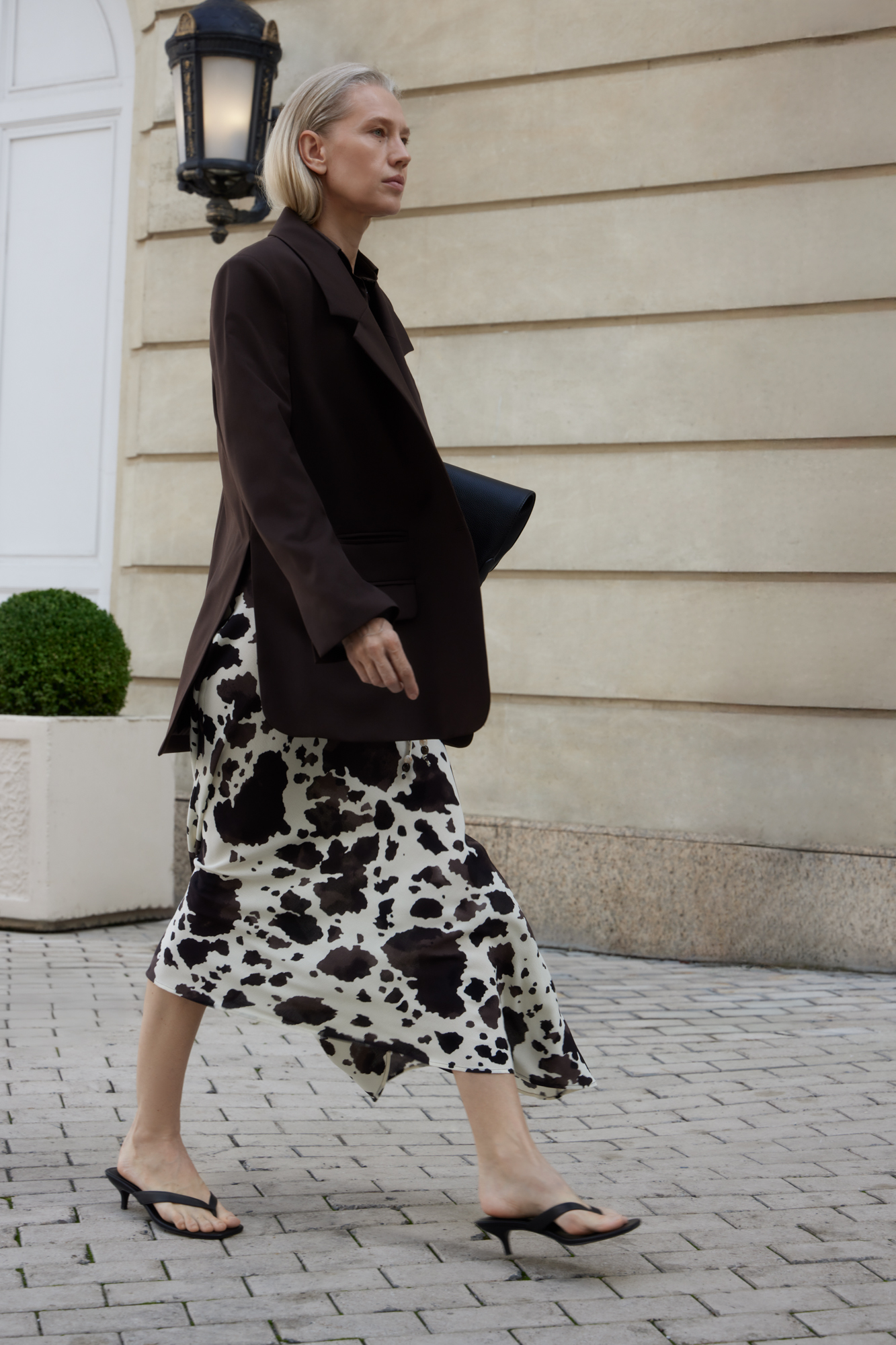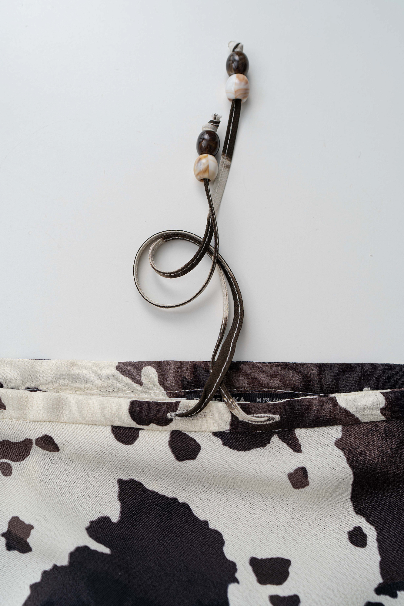 Принтованная юбка длины миди из 100% вискозы. Модель приталенного силуэта, со струящейся расклешенной юбкой и поясом на кулиске. Застежка на потайную молнию.