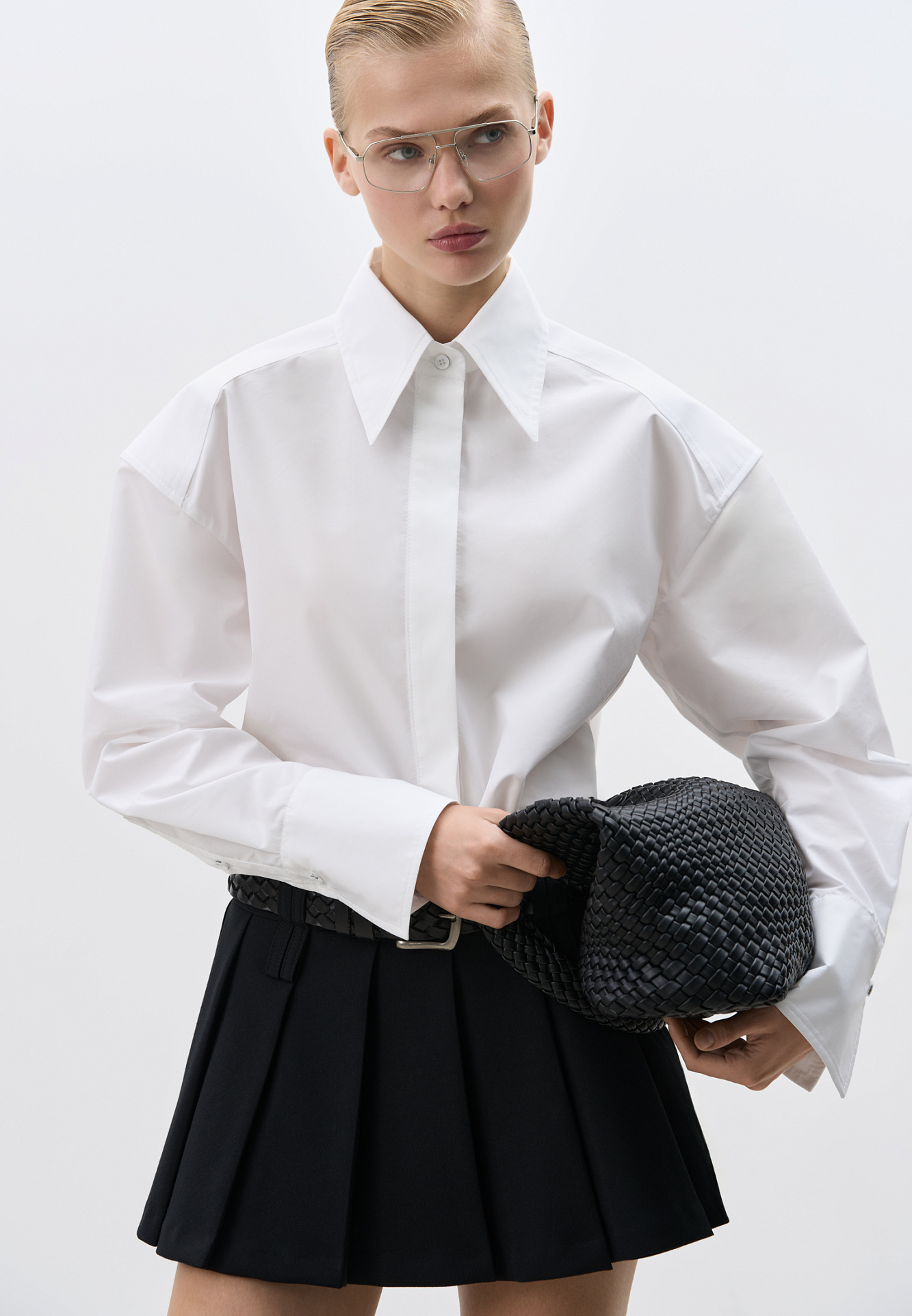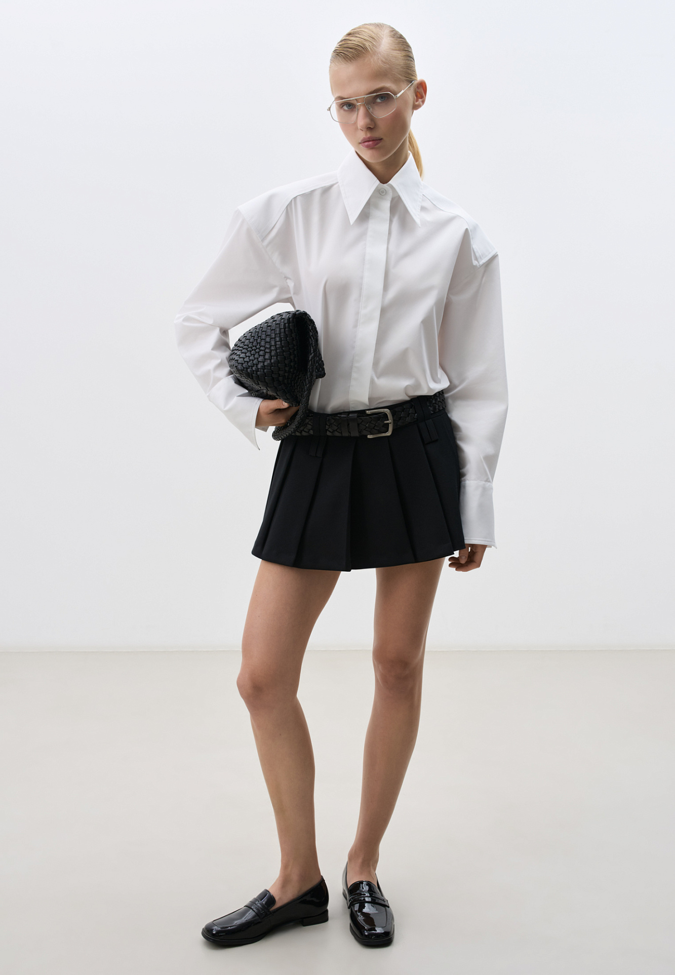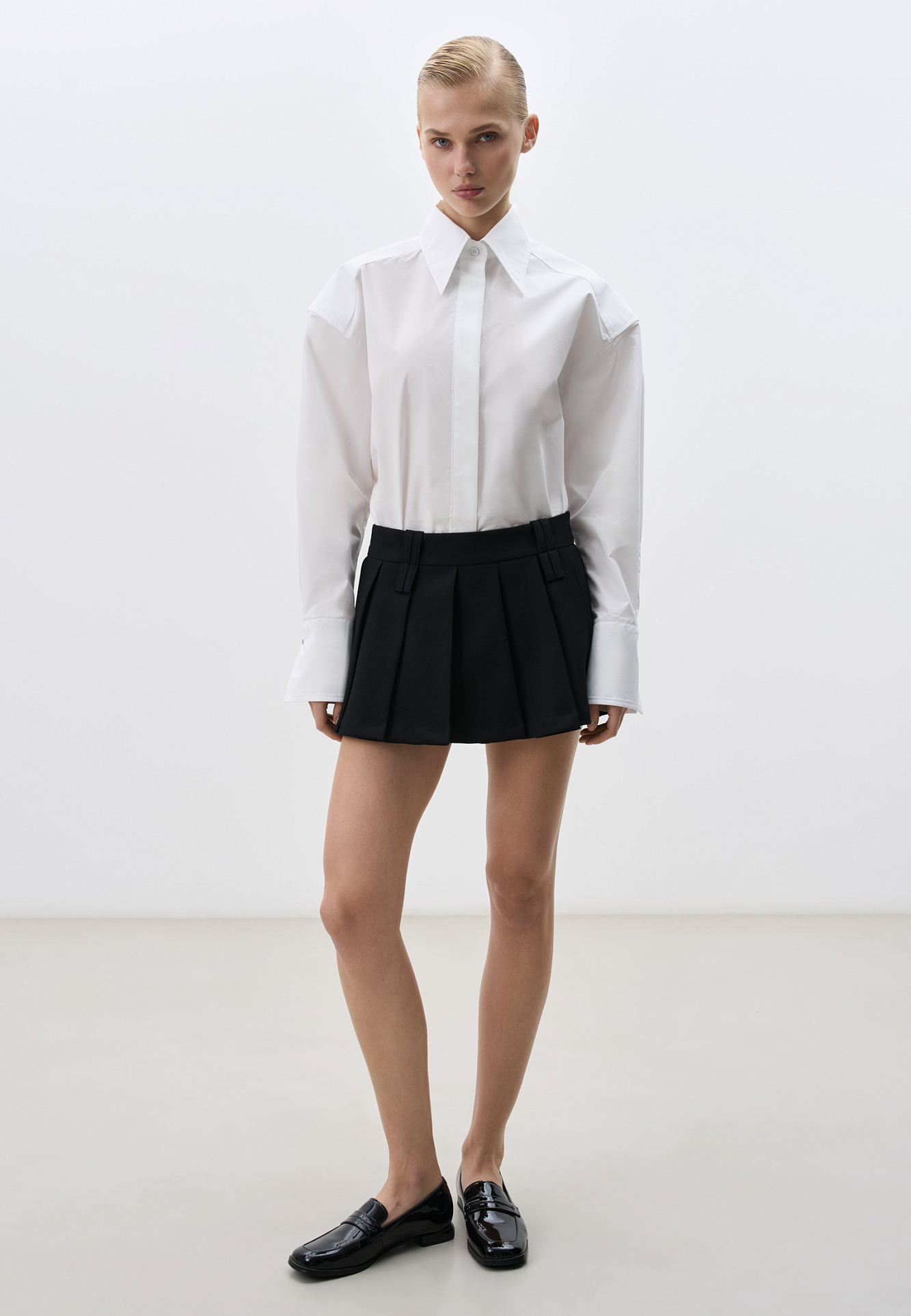 Юбка длины мини в складку из поливискозы. Модель с широким поясом и двойными шлевками для ремня. Застежка на потайную молнию. Изделие выполнено на подкладке из вискозы в виде шортиков.