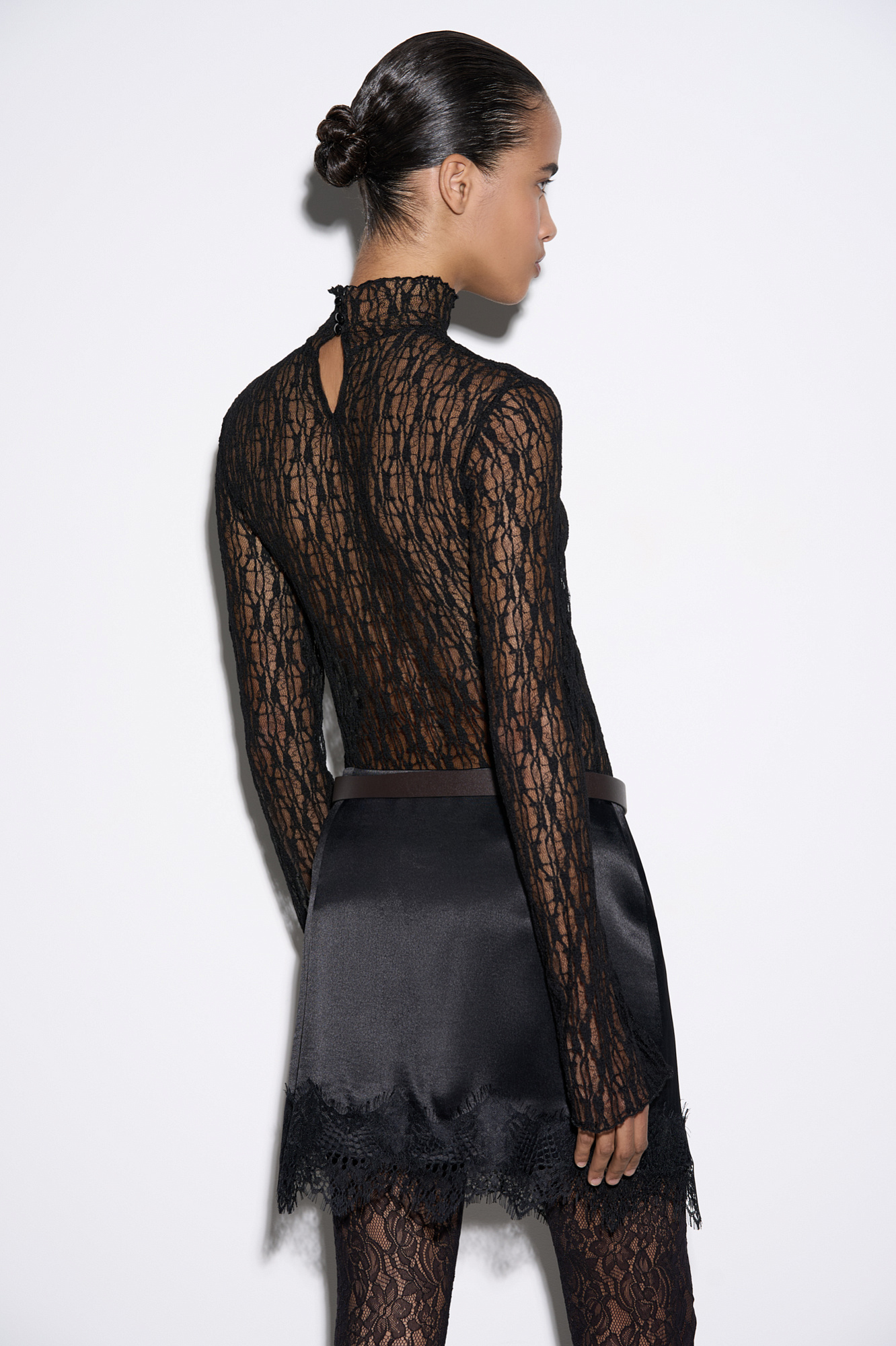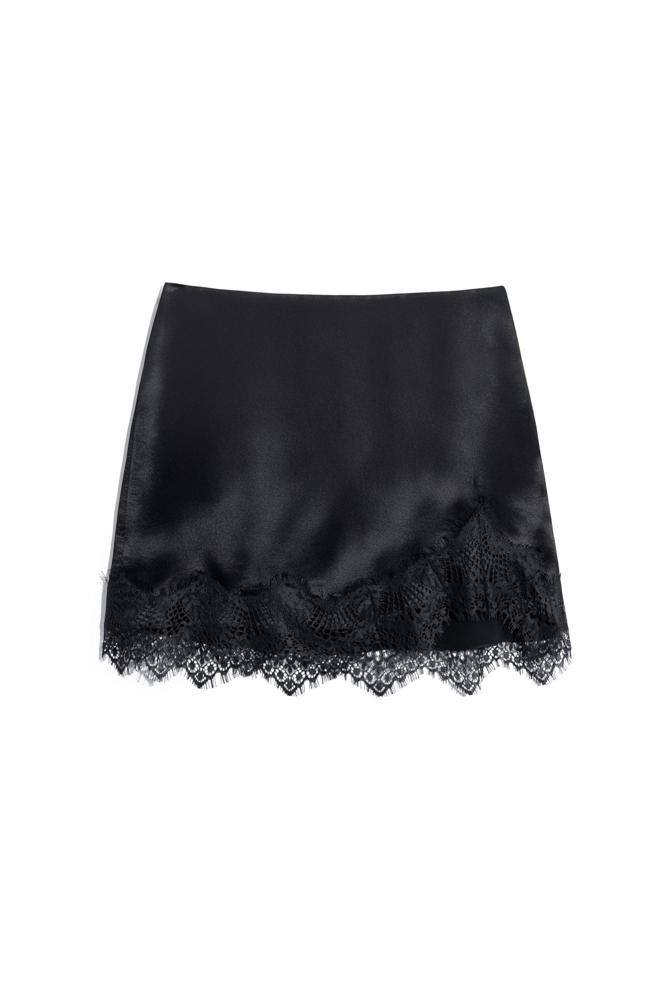 Атласная юбка длины мини. Модель с асимметричным низом, декорированным кружевом. Застежка на потайную молнию.