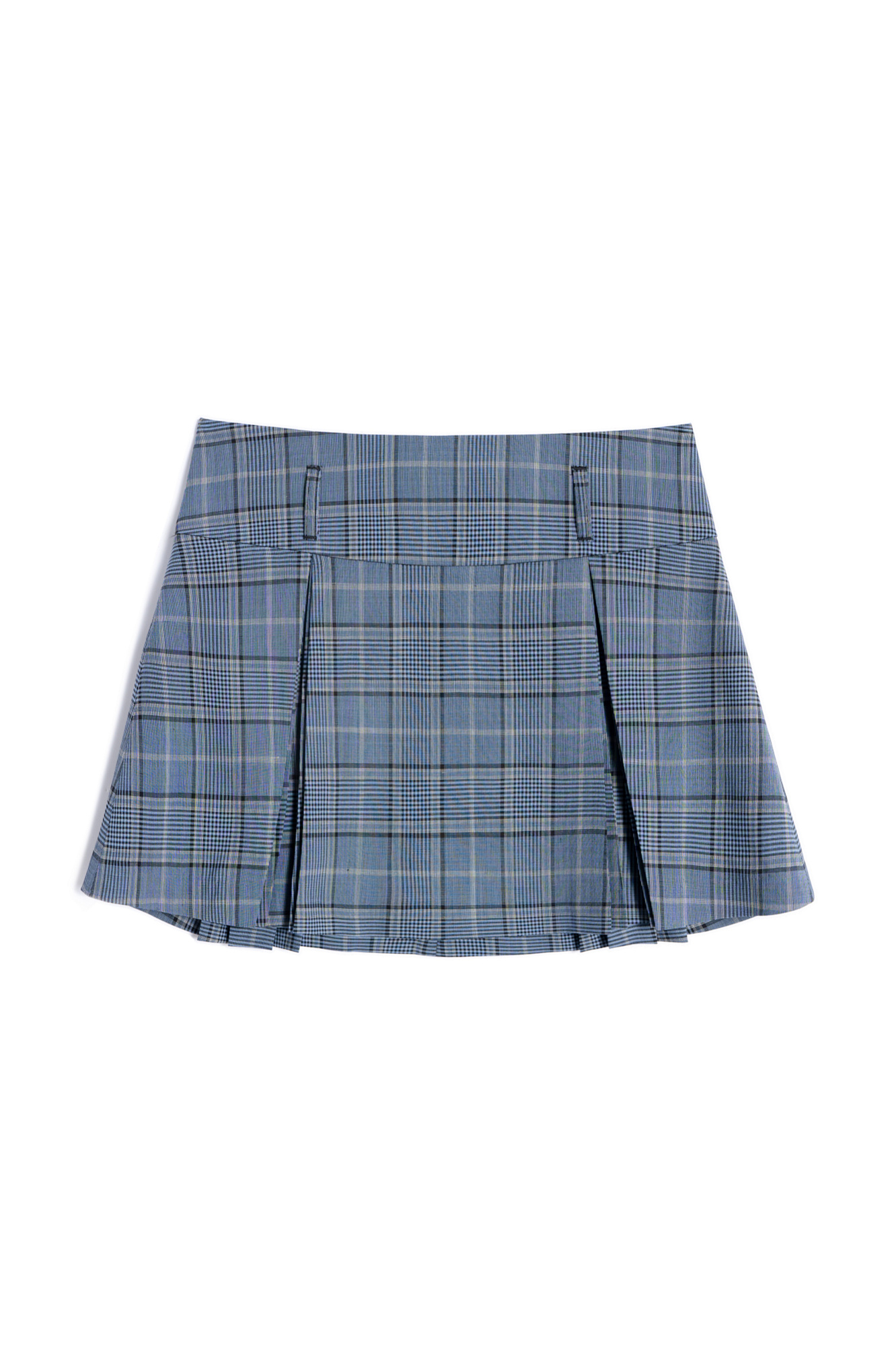 Юбка длины мини из шерсти в клетку. Модель с высоким поясом, дополненым шлевками для ремня. Изделие декорировано закрытыми веерными складками. Застежка на молнию.