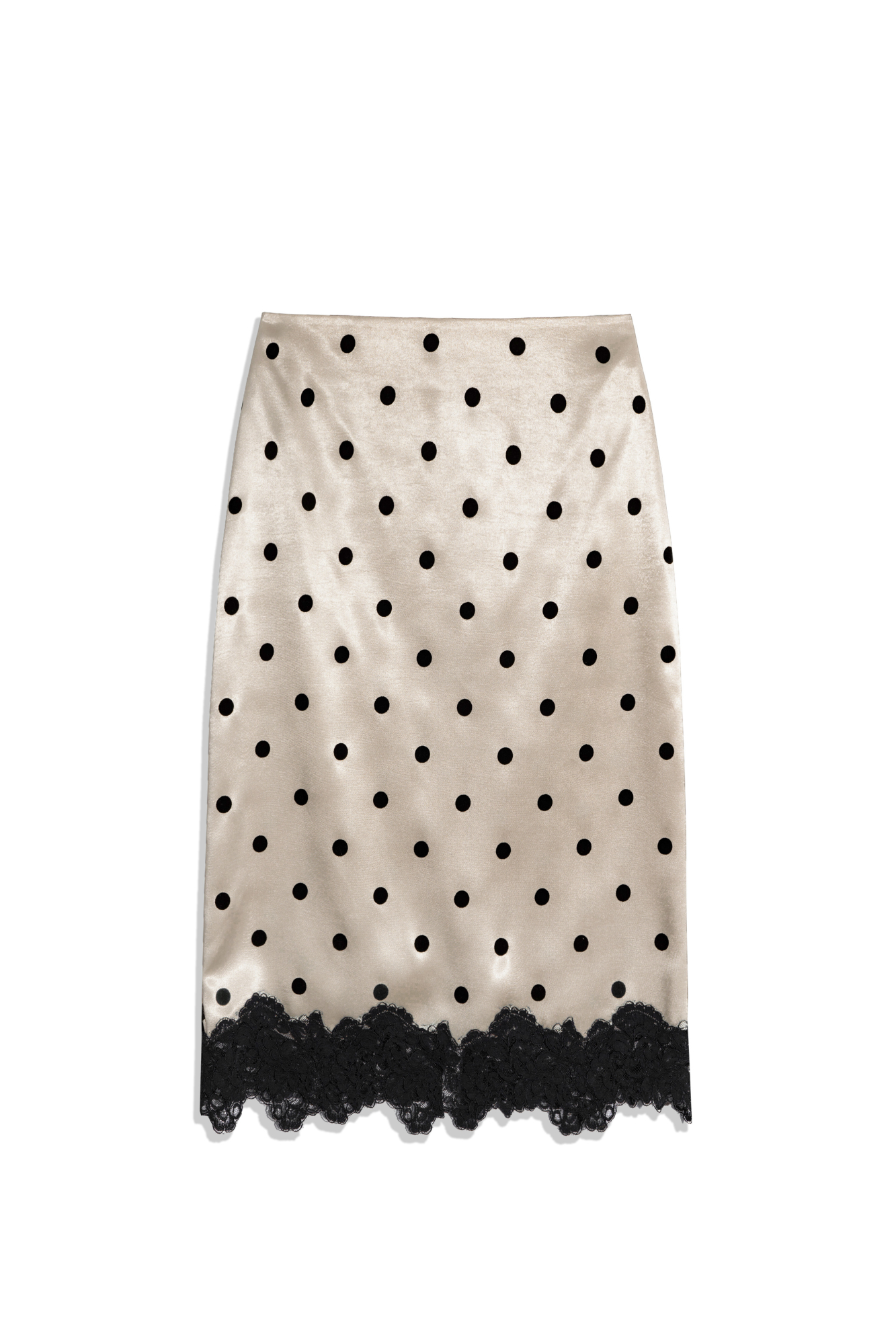 Атласная юбка в горох длины миди. Модель по фигуре с застежкой на потайную молнию. Подол изделия декорирован кружевом.