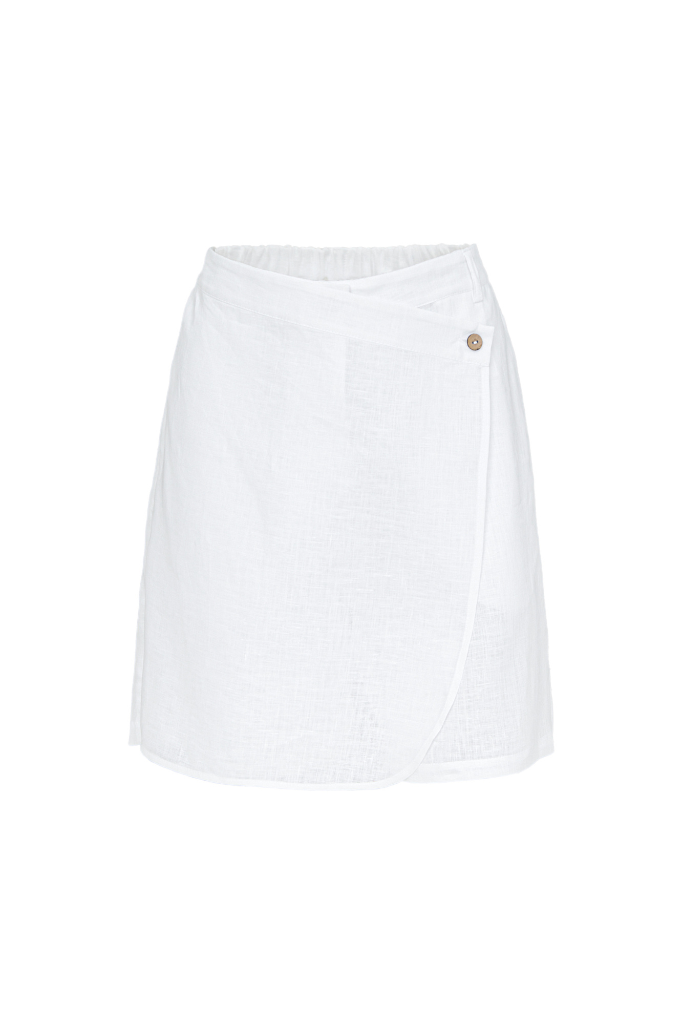 Юбка-шорты из 100% льна с застежкой на запах. Дополнить образ можно рубашкой.