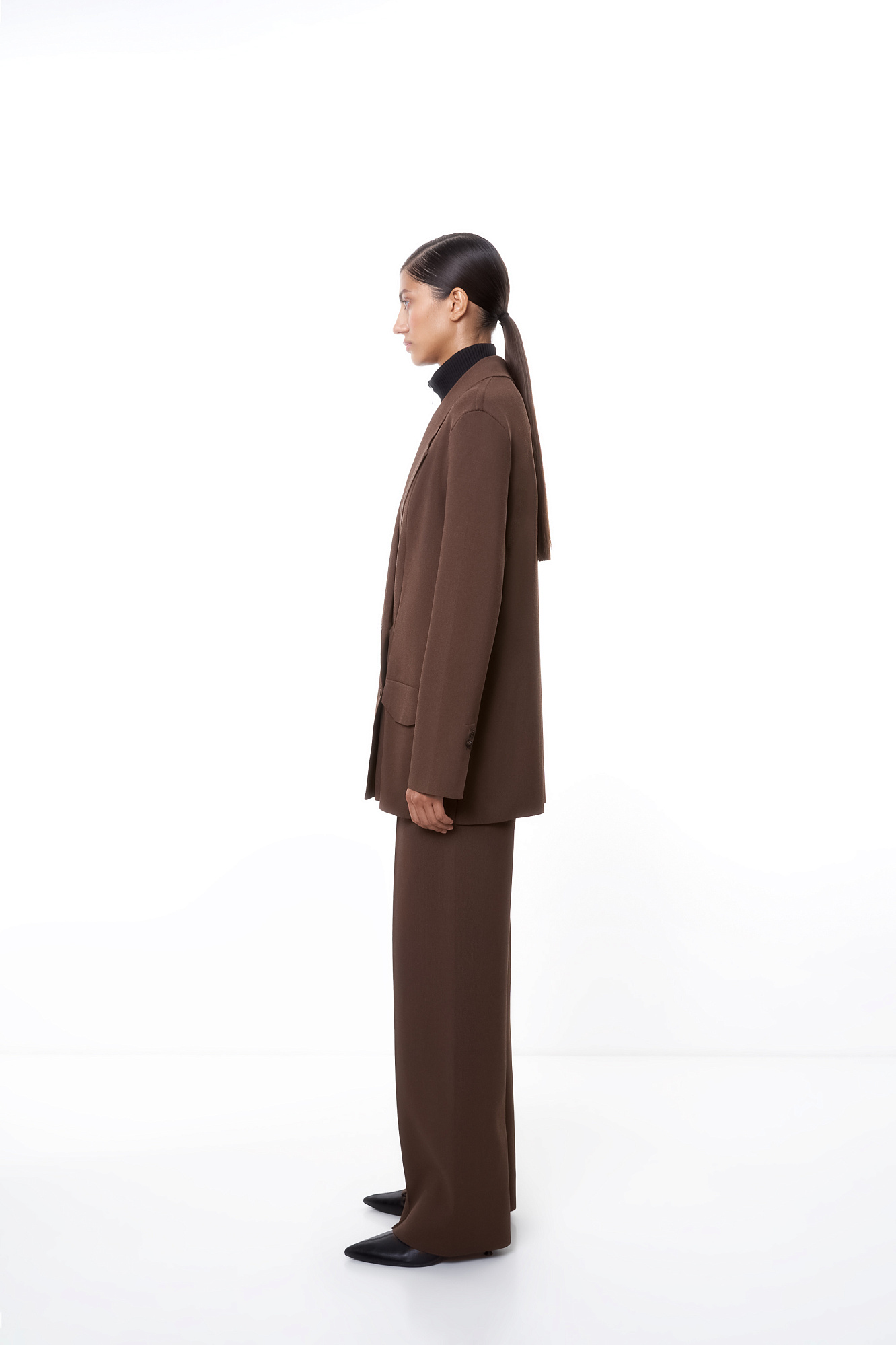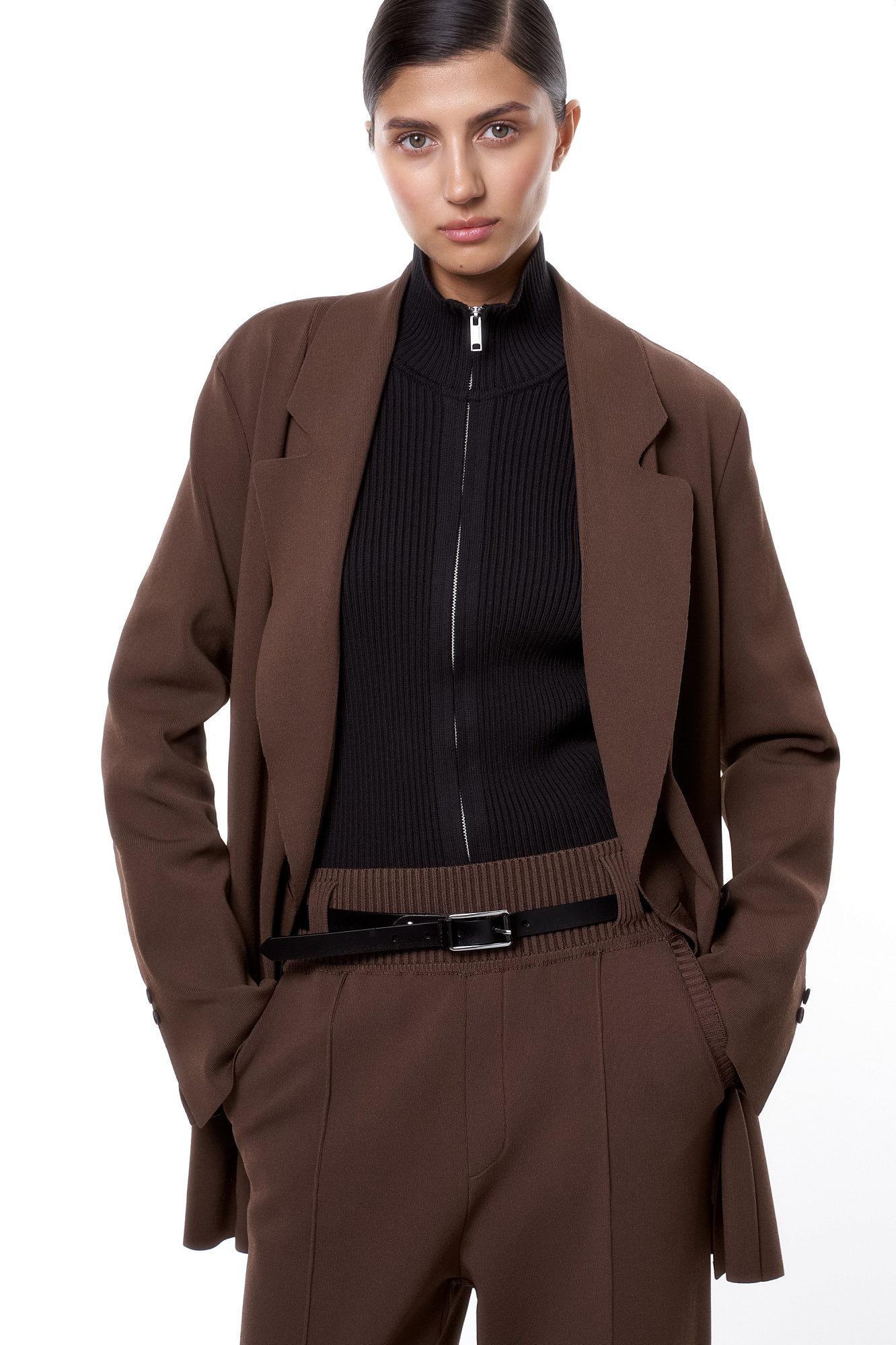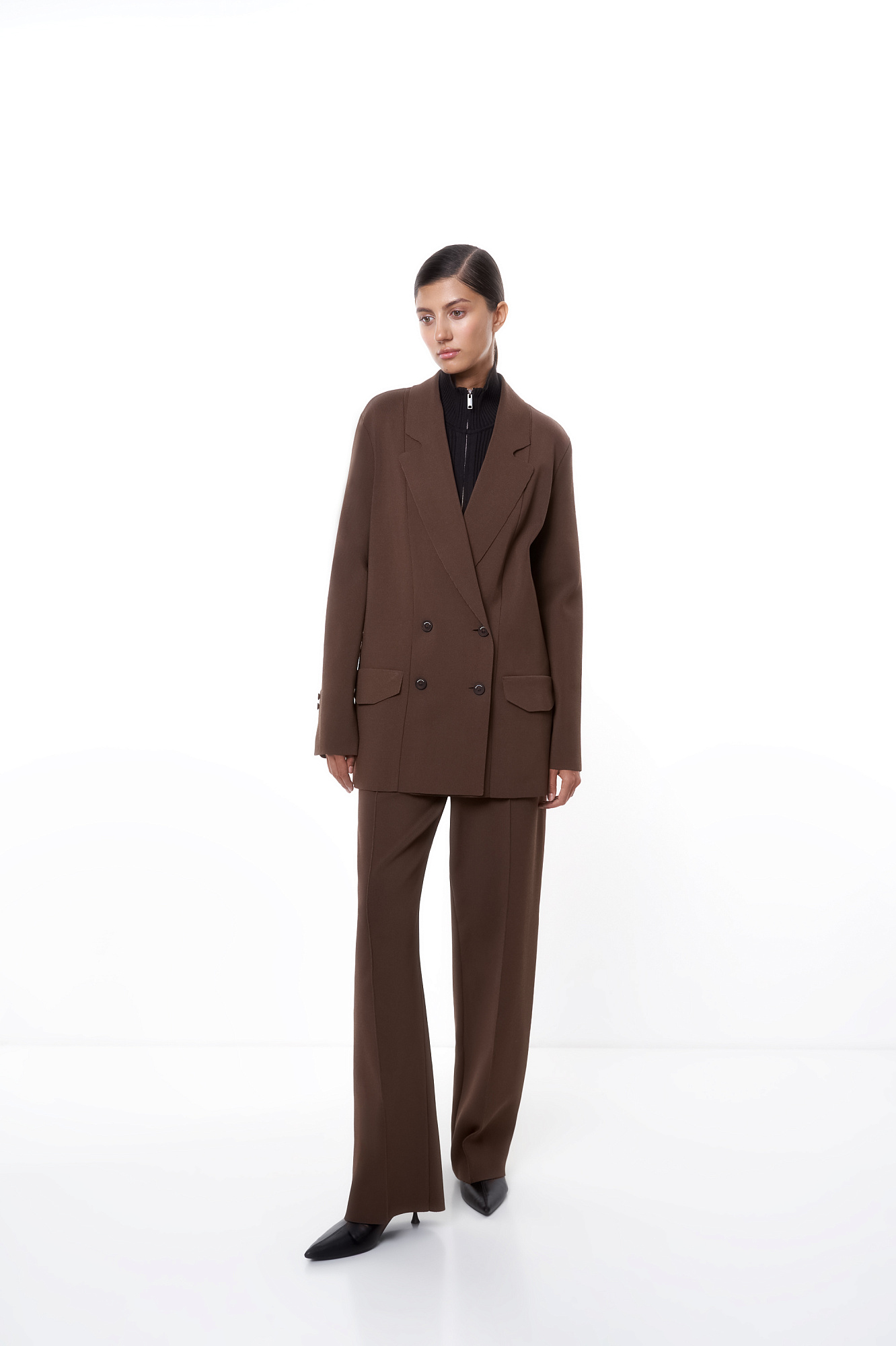 Трикотажный двубортный жакет свободного кроя с длинными лацканами, вывязанными карманами и застежкой на пуговицы. Дополнить образ можно брюками.