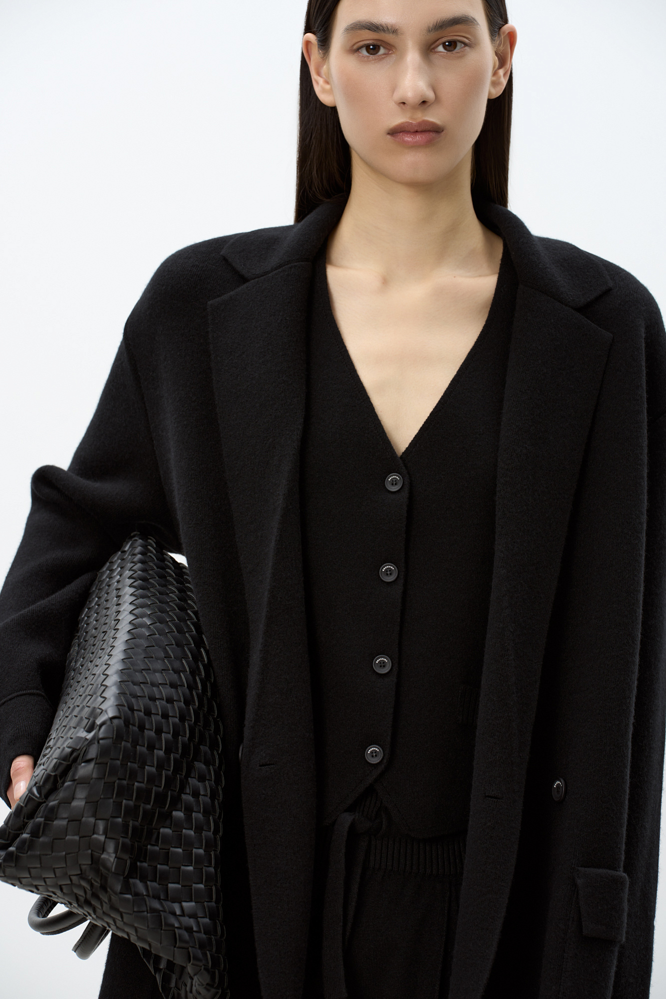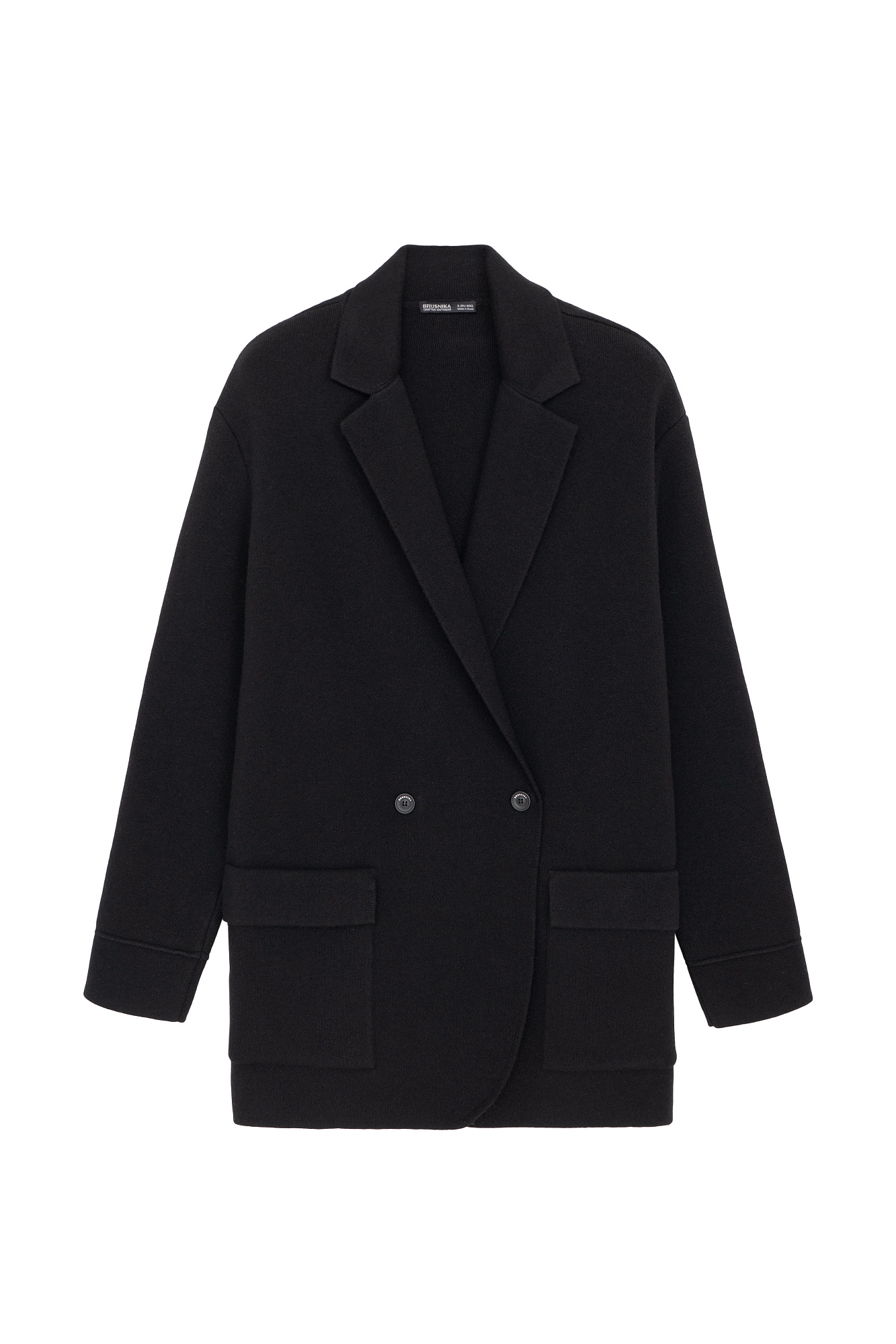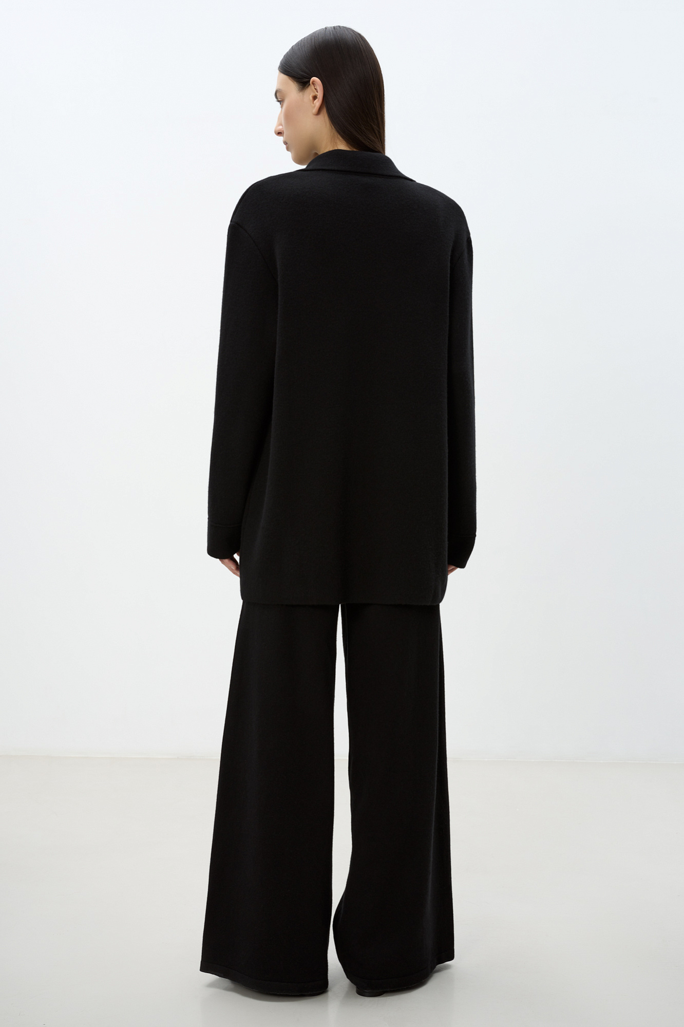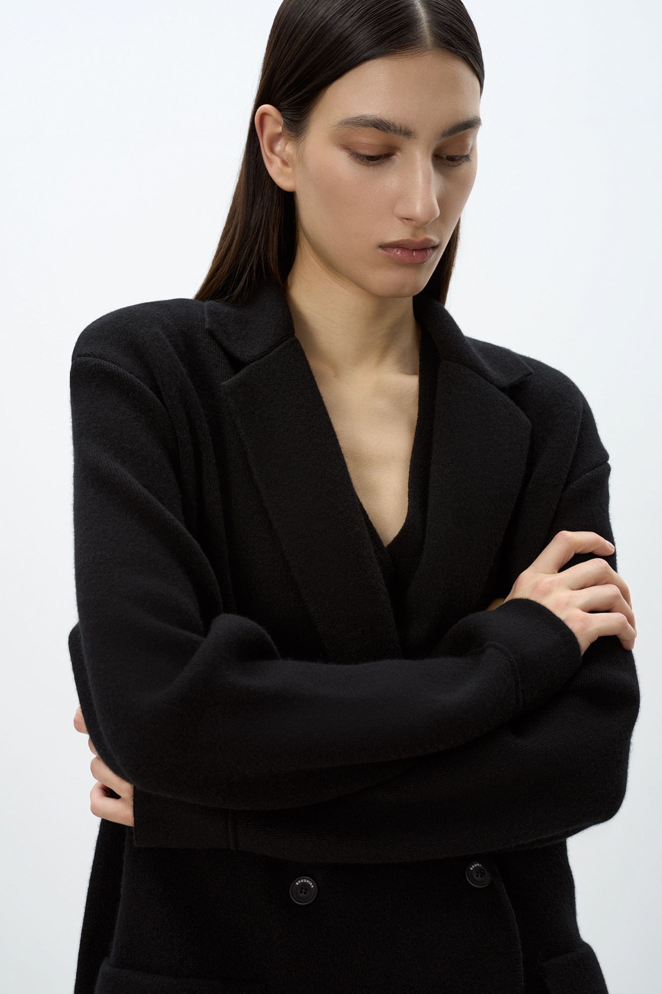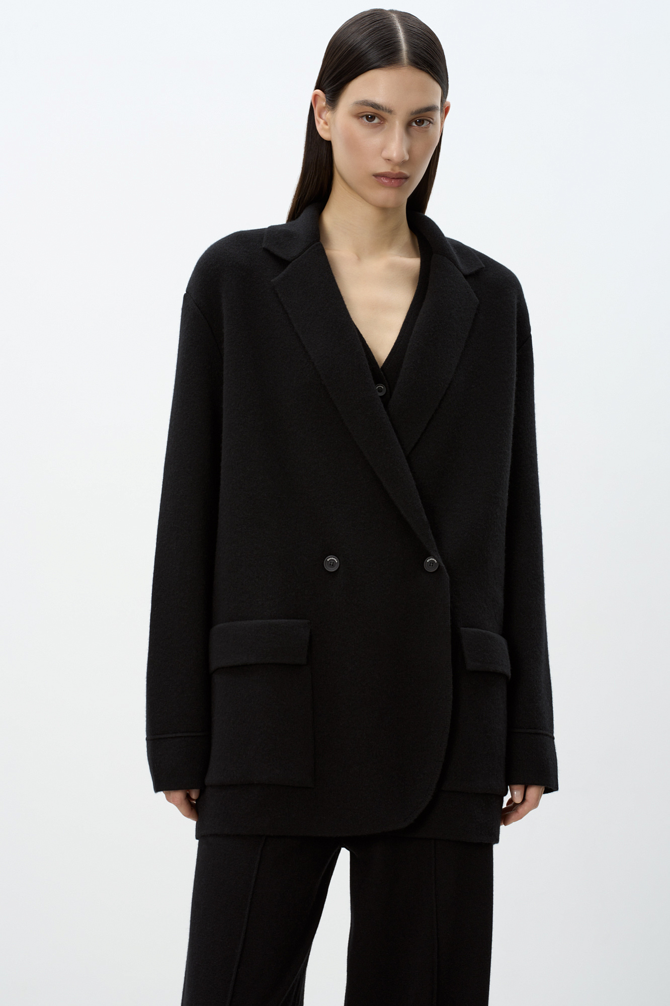 Трикотажный двубортный жакет из смесовой шерсти с добавлением кашемира. Модель прямого кроя, с прямоугольными лацканами и накладными карманами с клапанами спереди. Изделие без подкладки.