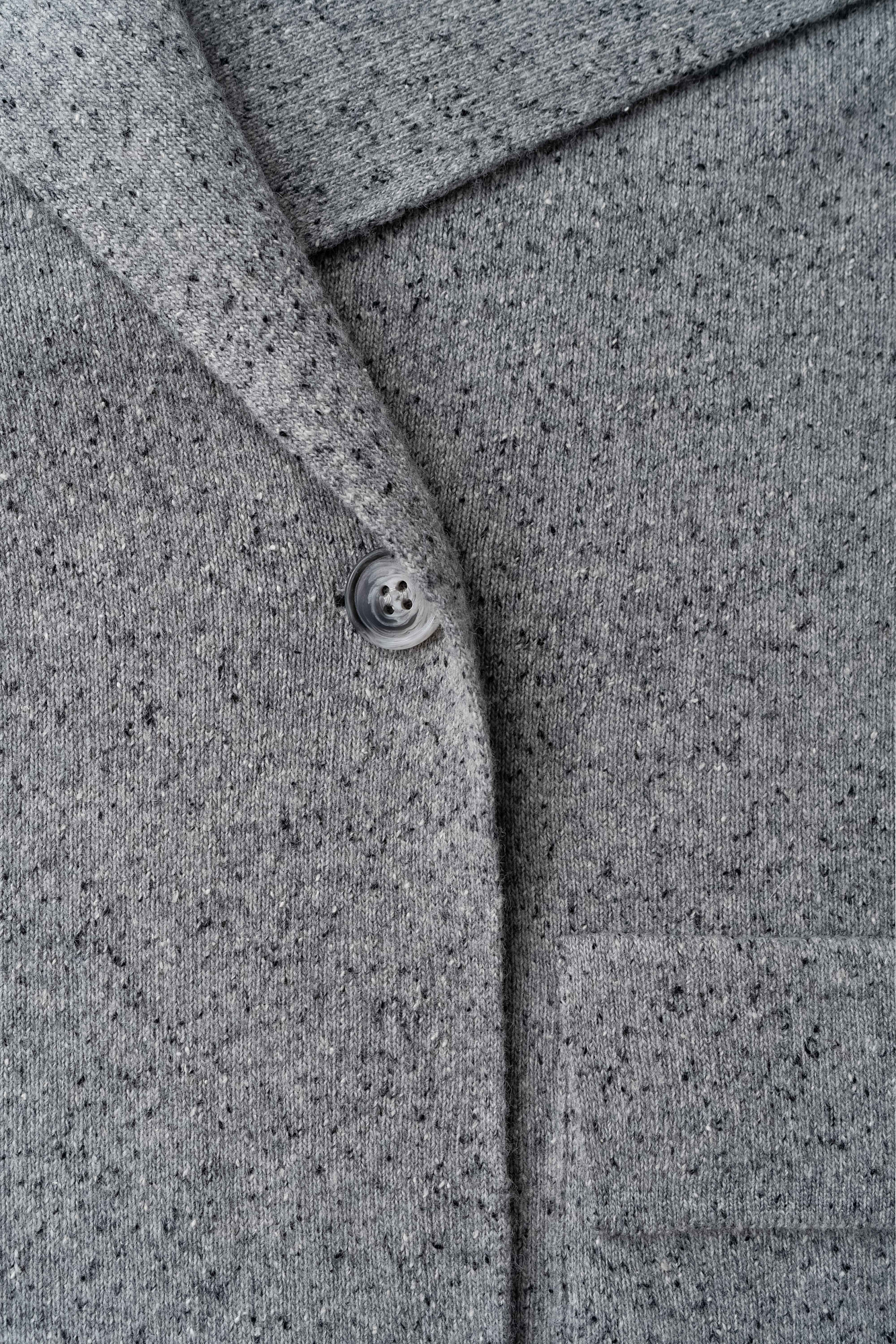 Трикотажный двубортный жакет из шерсти с добавлением вискозы и шелка. Модель прямого кроя, с лацканами, двумя накладными карманами и валиками на манжетах. Застежка на пуговицы. Без подкладки.