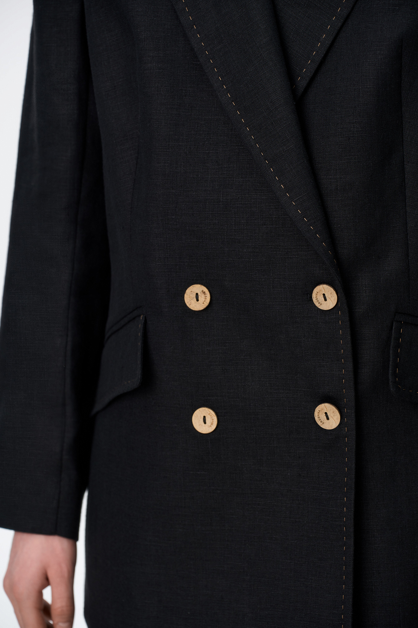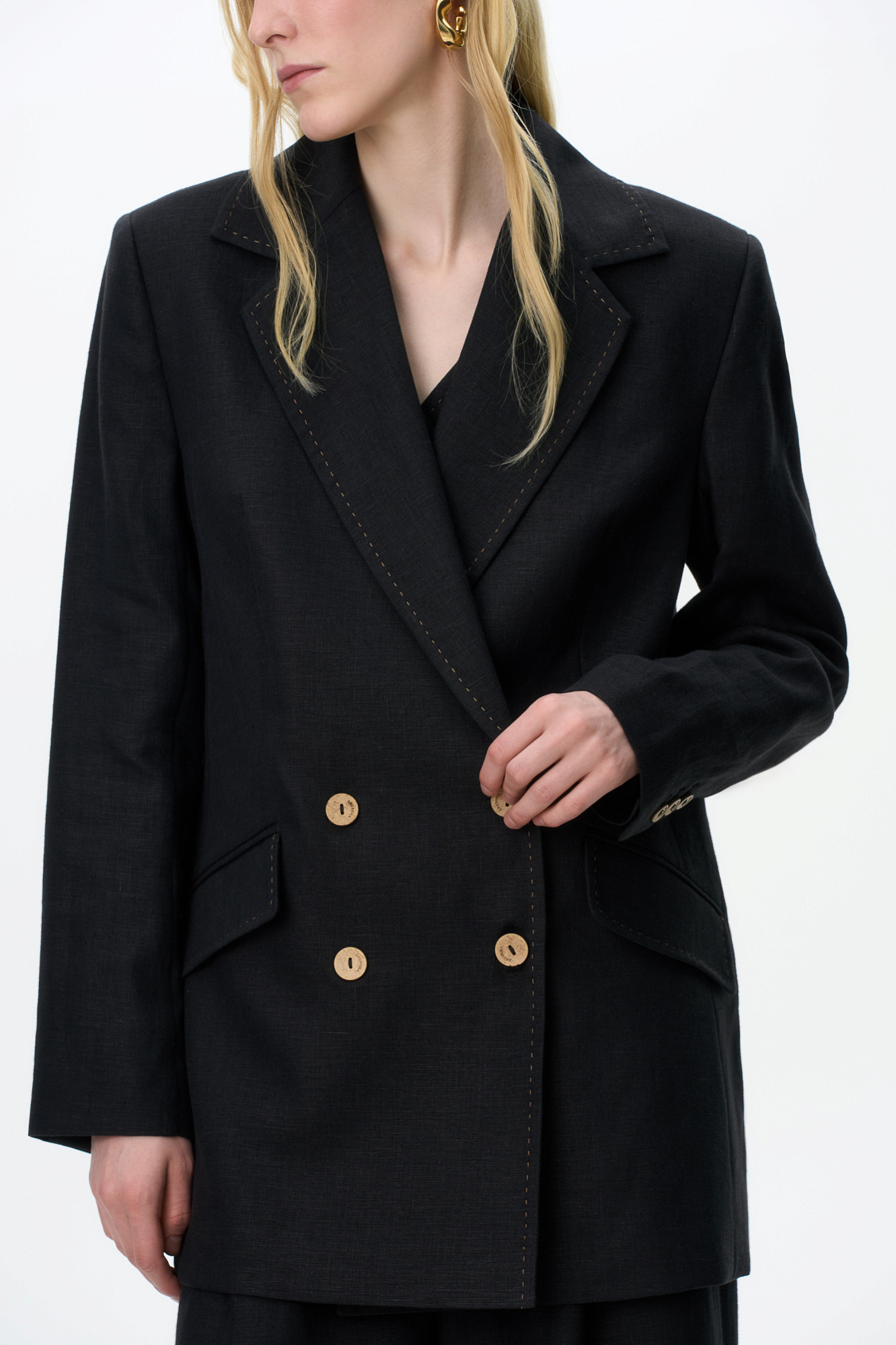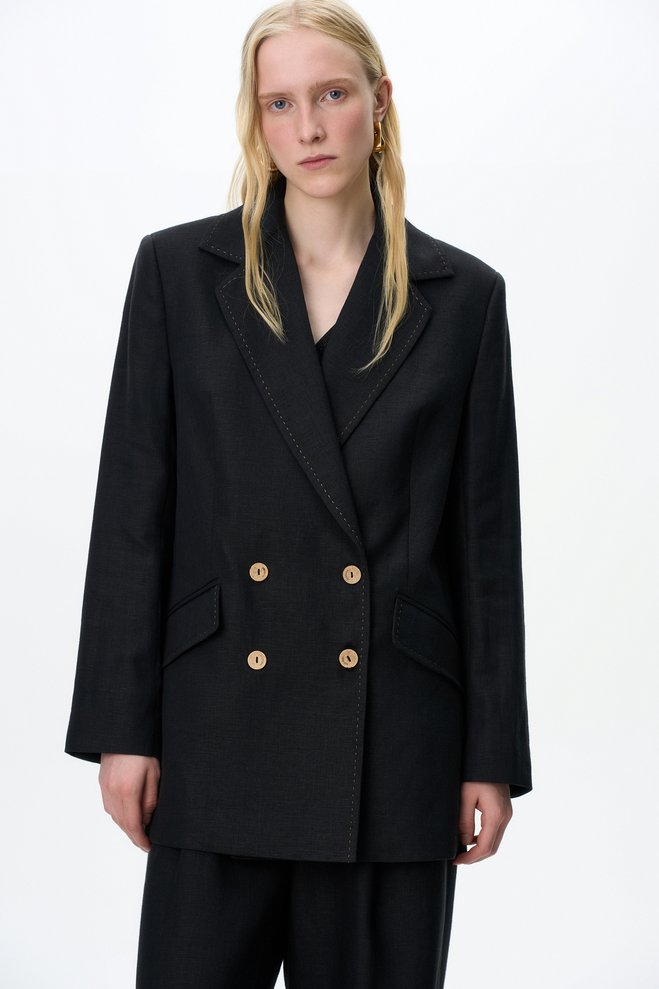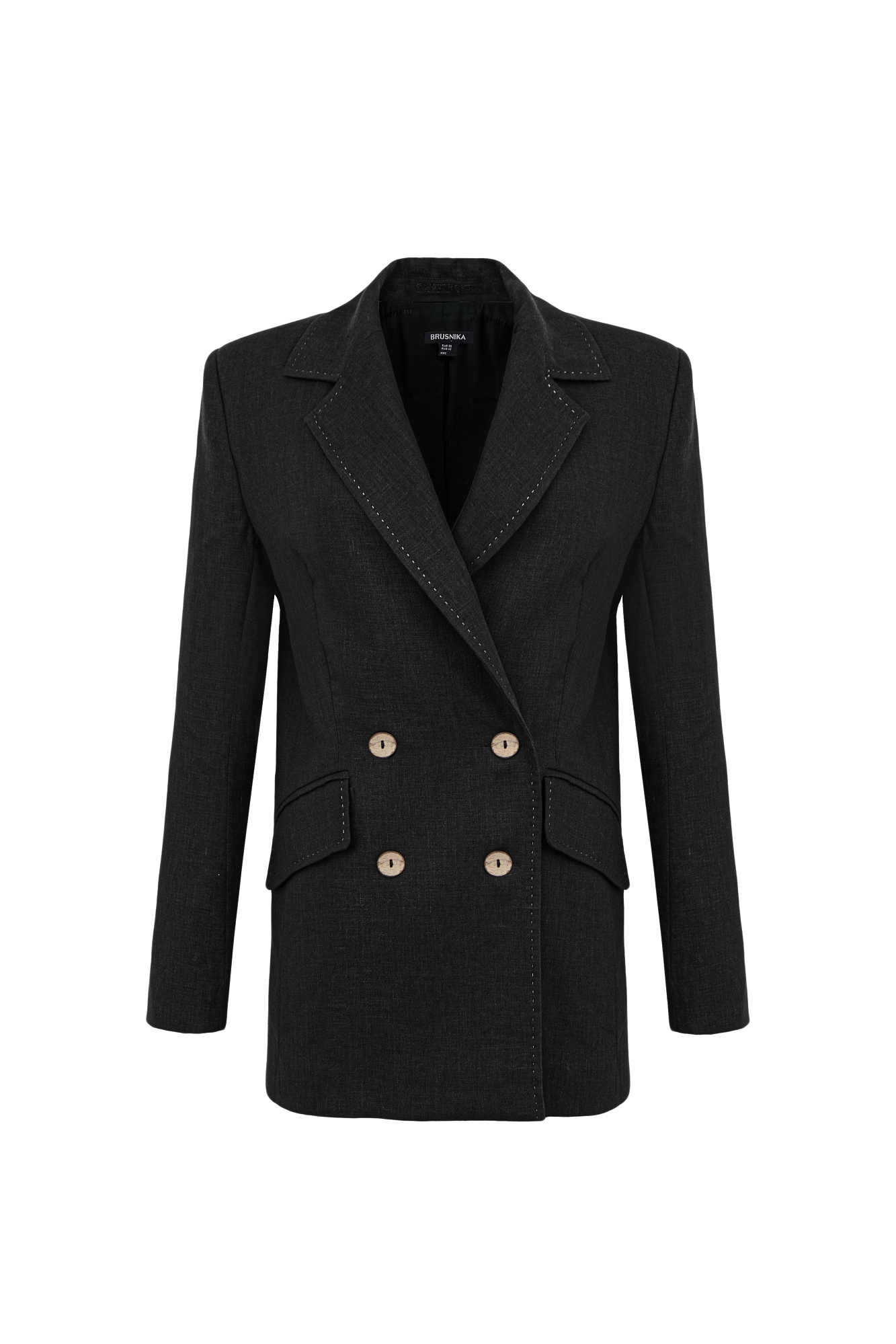 Классический двубортный жакет из 100% льна. Модель прямого кроя с английским воротником и прорезными карманами с клапанами. Изделие декорировано отстрочкой контрастного цвета. На подкладке.