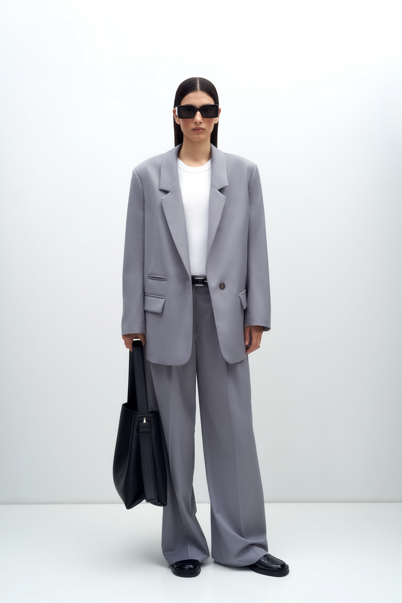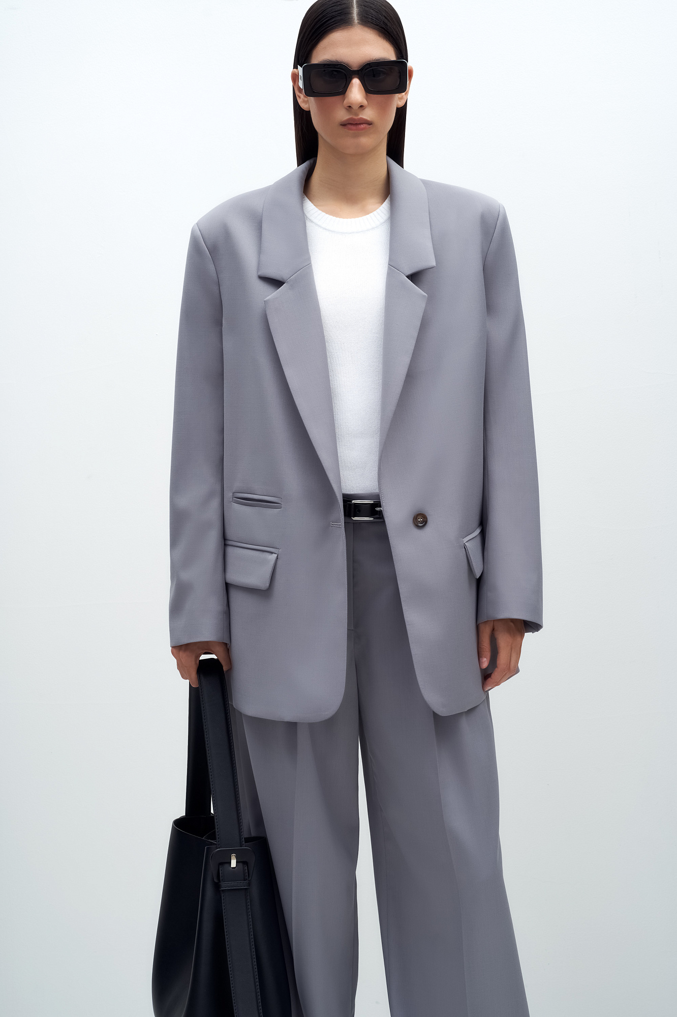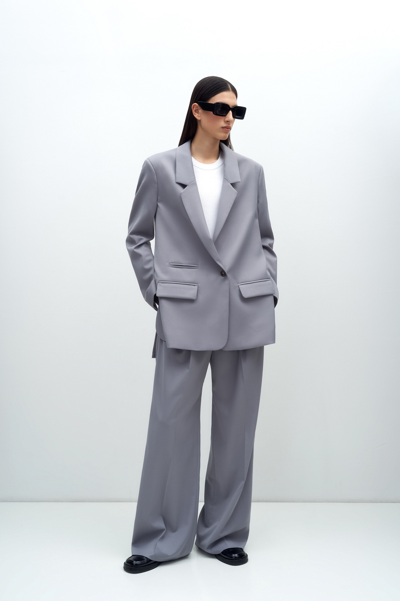 Классический костюм, состоящий из однобортного жакета и брюк палаццо. Жакет прямого кроя судлиненной спинкой, лацканами и двумя прорезными карманами с клапанами. Брюки прямого кроя с боковыми карманами и застежкой на молнию.