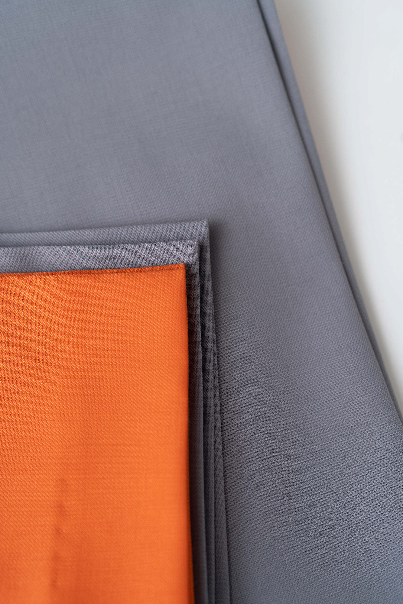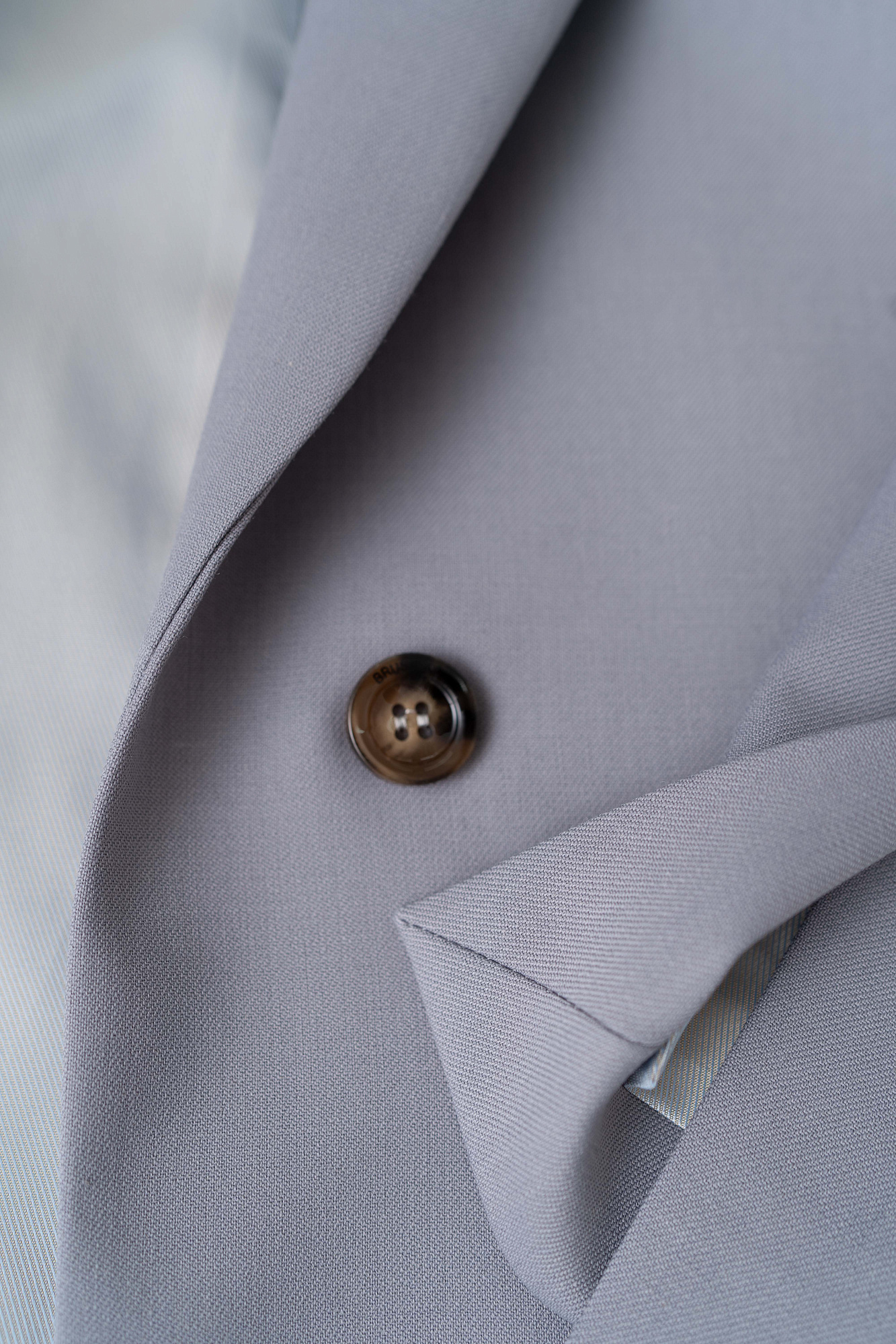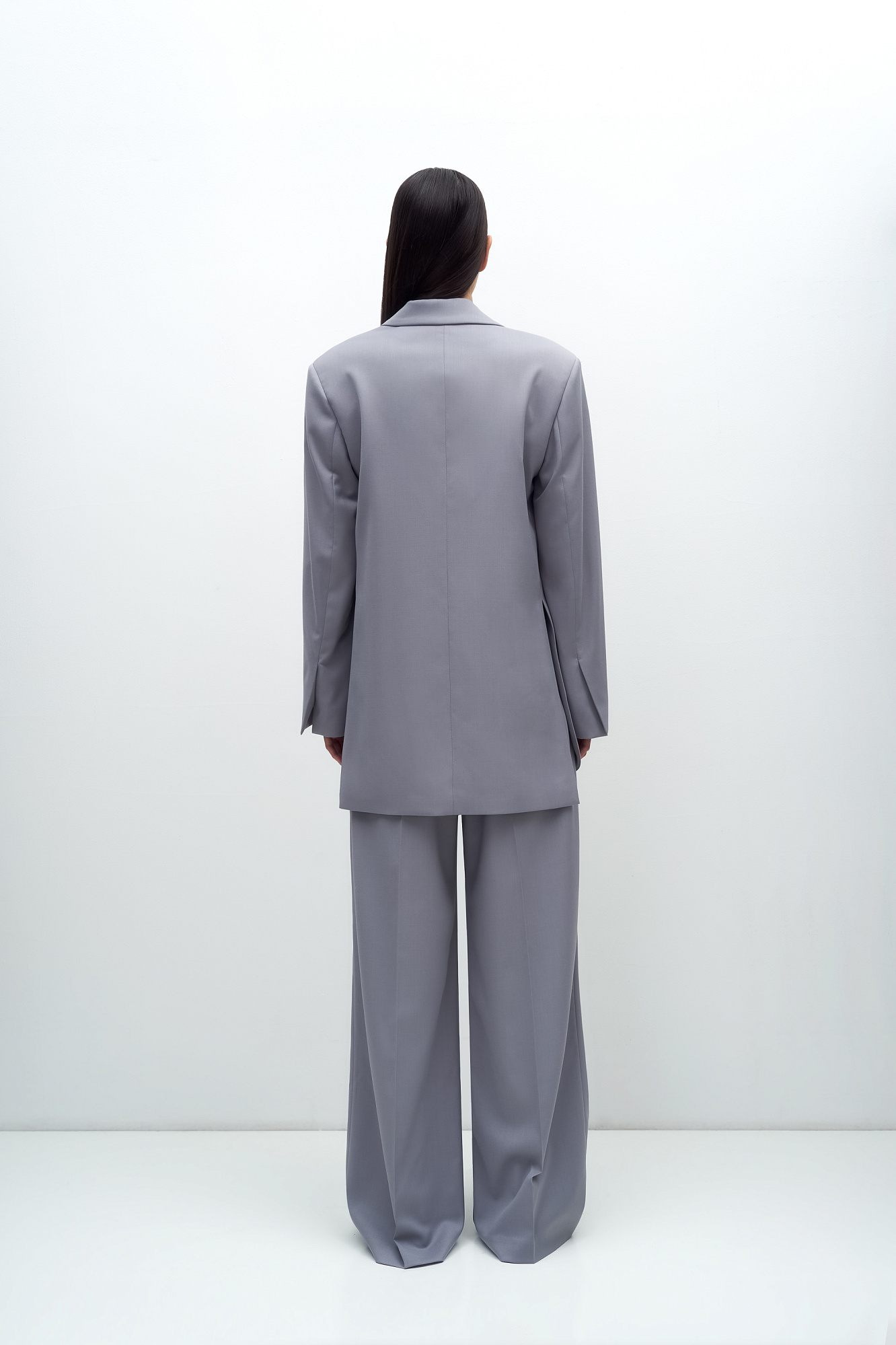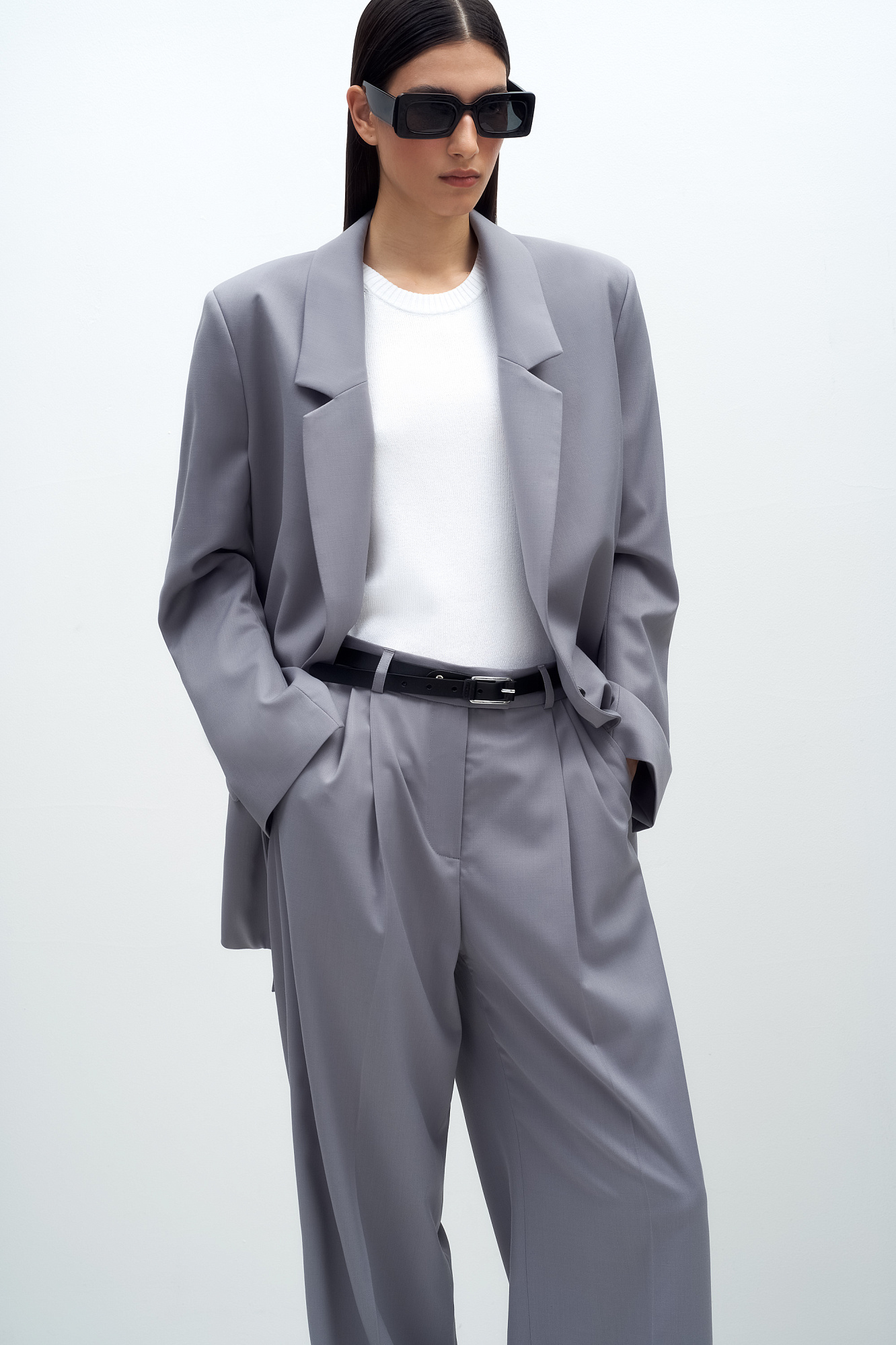 Классический костюм, состоящий из однобортного жакета и брюк палаццо. Жакет прямого кроя судлиненной спинкой, лацканами и двумя прорезными карманами с клапанами. Брюки прямого кроя с боковыми карманами и застежкой на молнию.