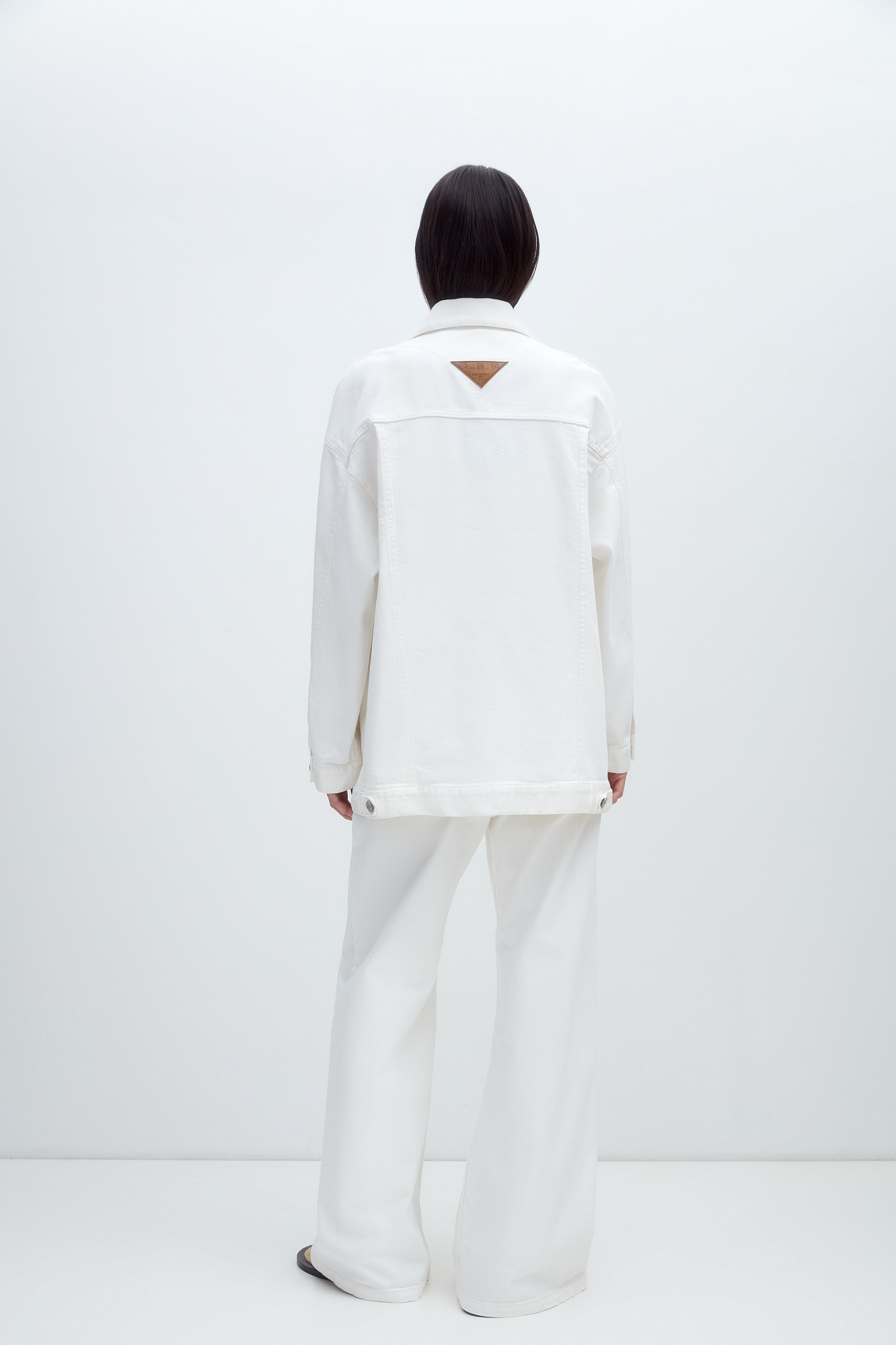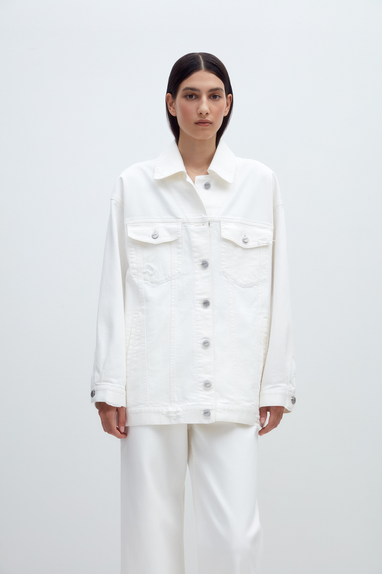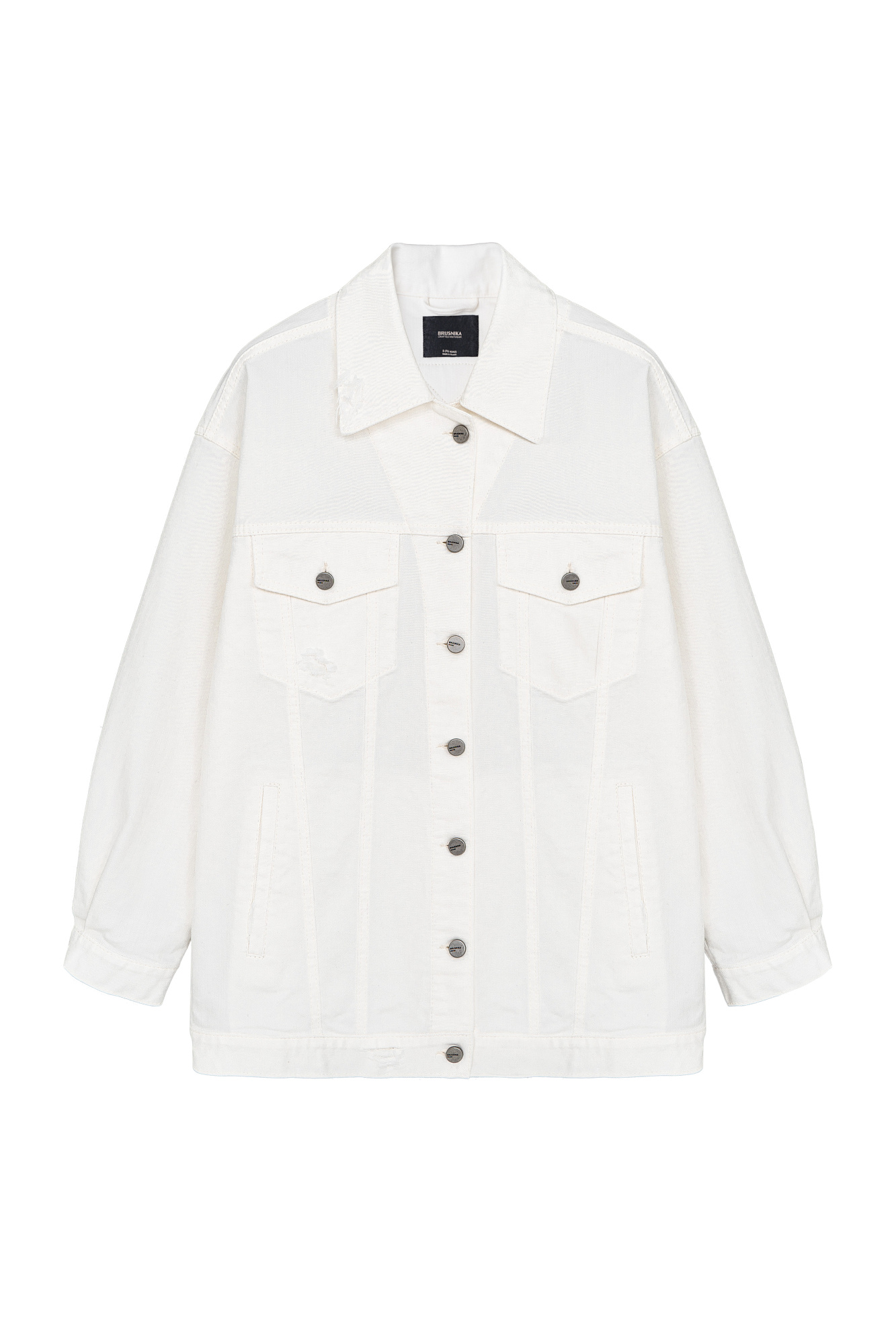 Джинсовый жакет прямого кроя. Отложной воротник, длинные рукава с манжетами на пуговицах. Модель декорирована накладными карманами на груди и брендированным ярлыком на спине. Застежка на пуговицы.