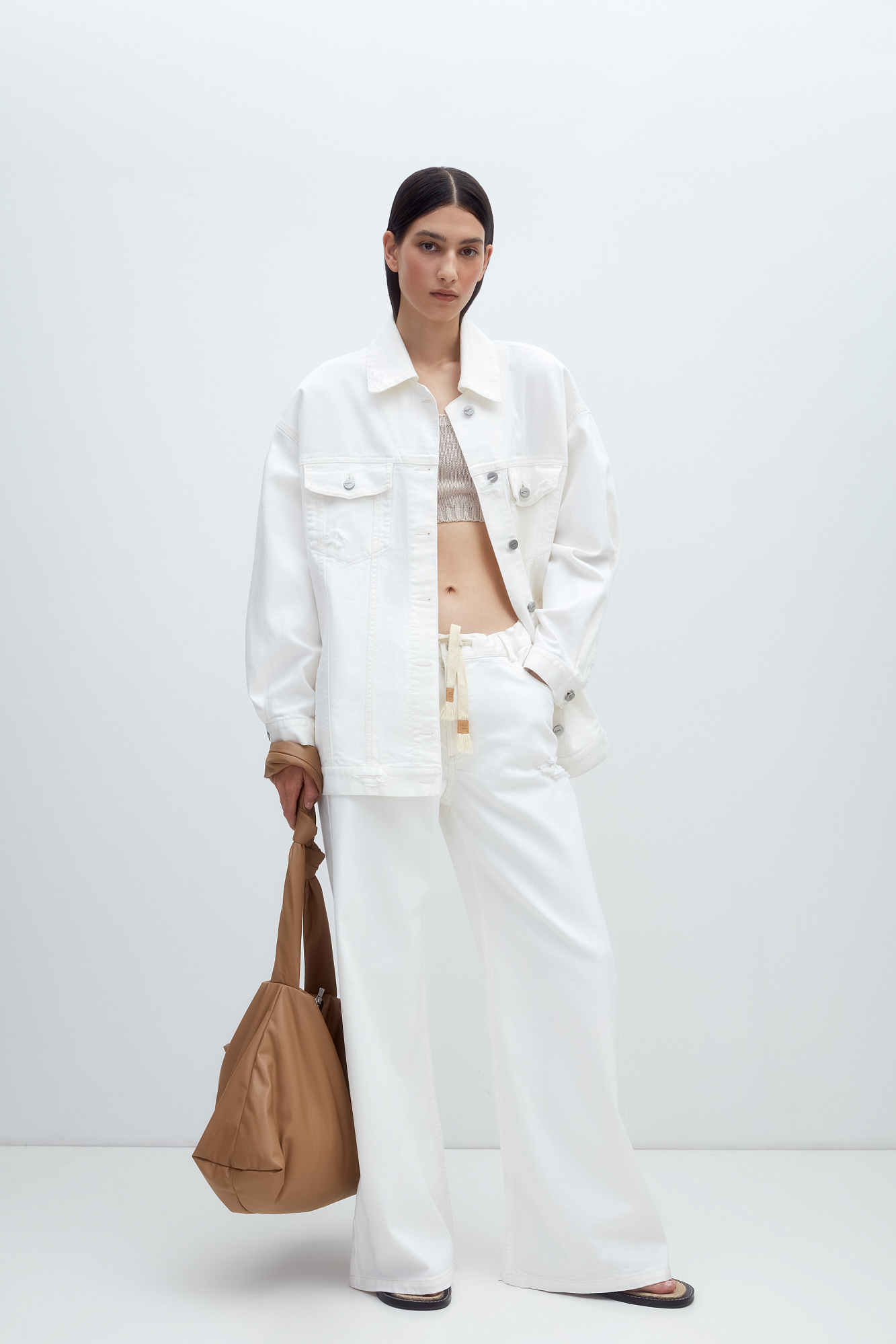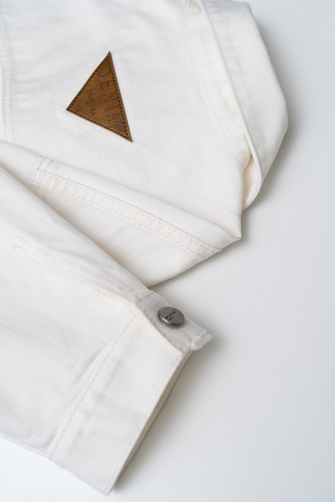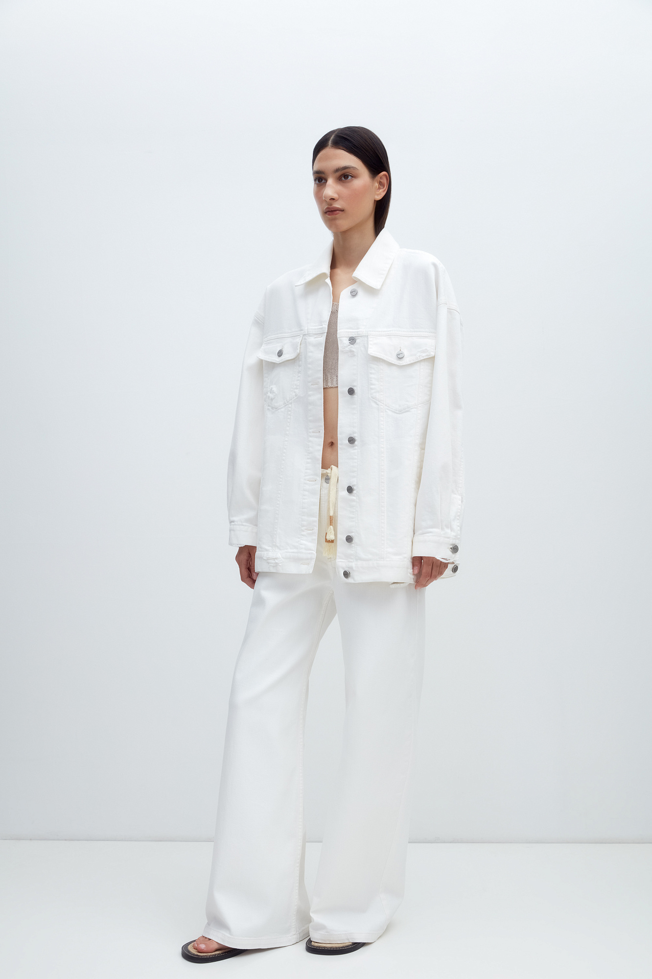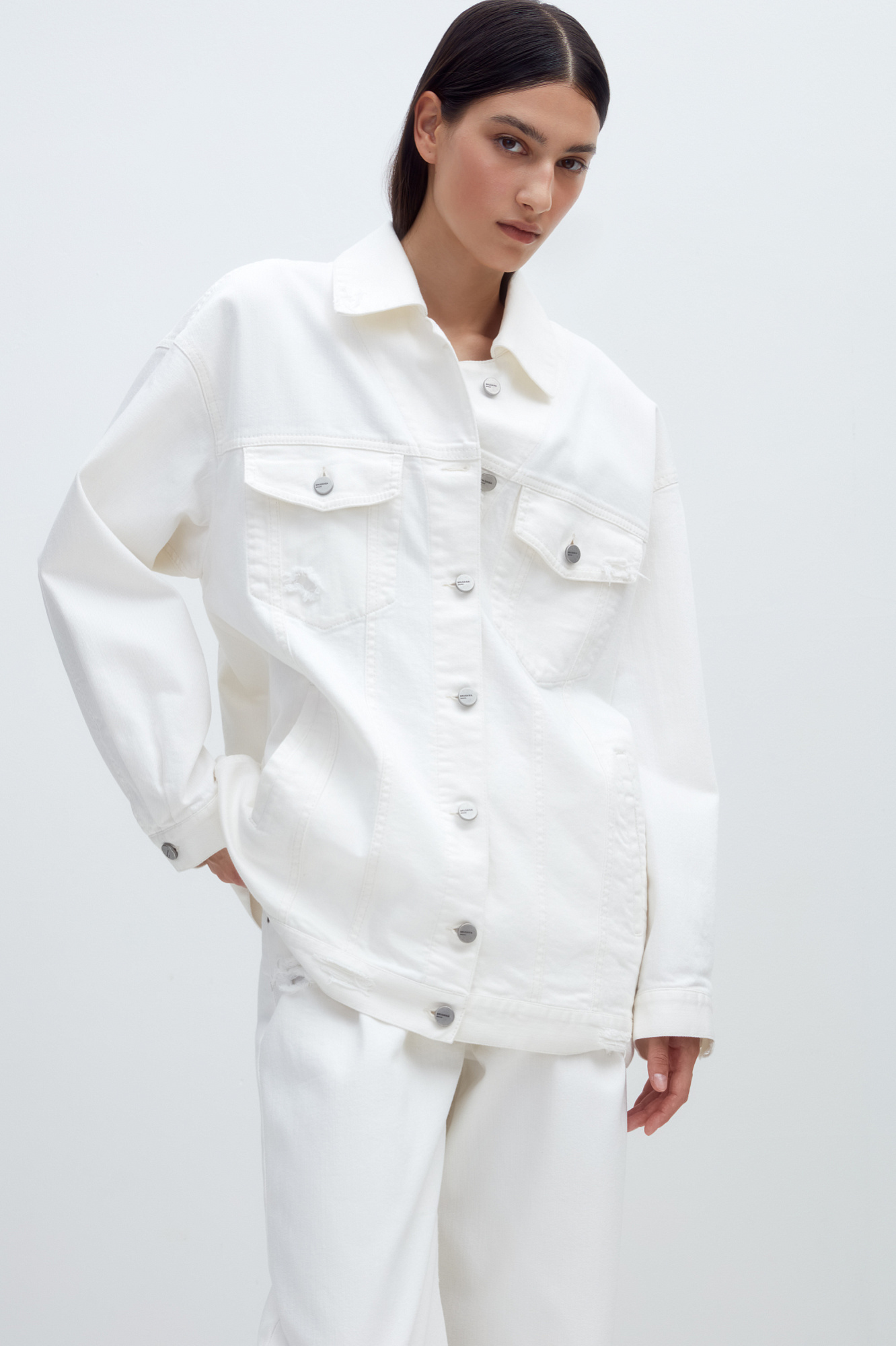 Джинсовый жакет прямого кроя. Отложной воротник, длинные рукава с манжетами на пуговицах. Модель декорирована накладными карманами на груди и брендированным ярлыком на спине. Застежка на пуговицы.