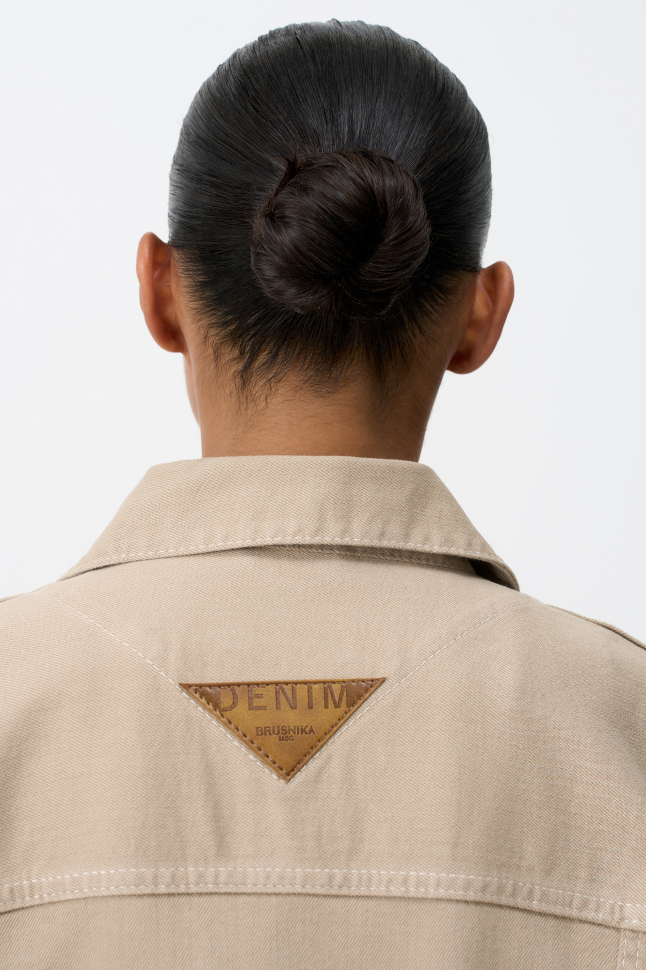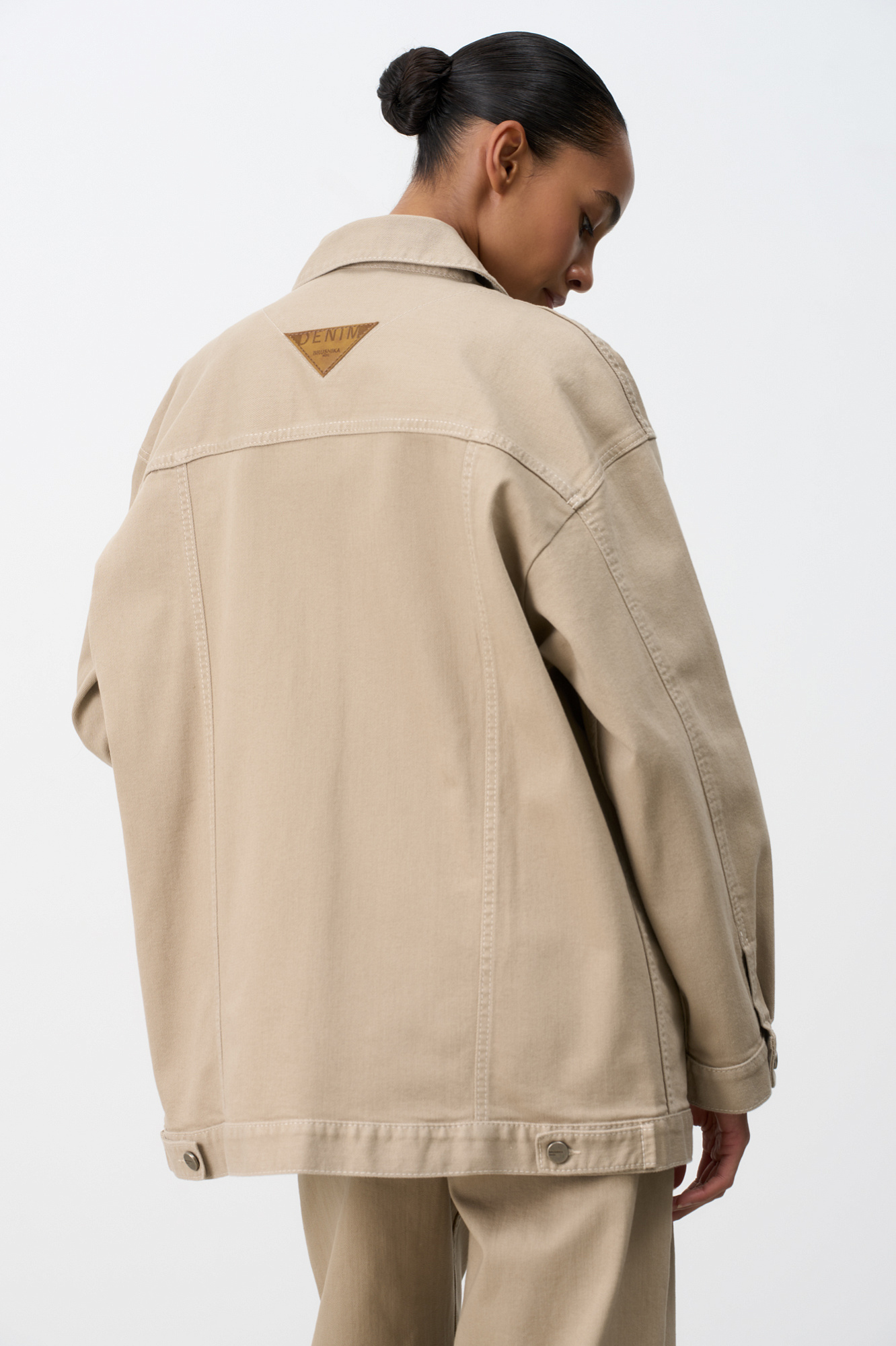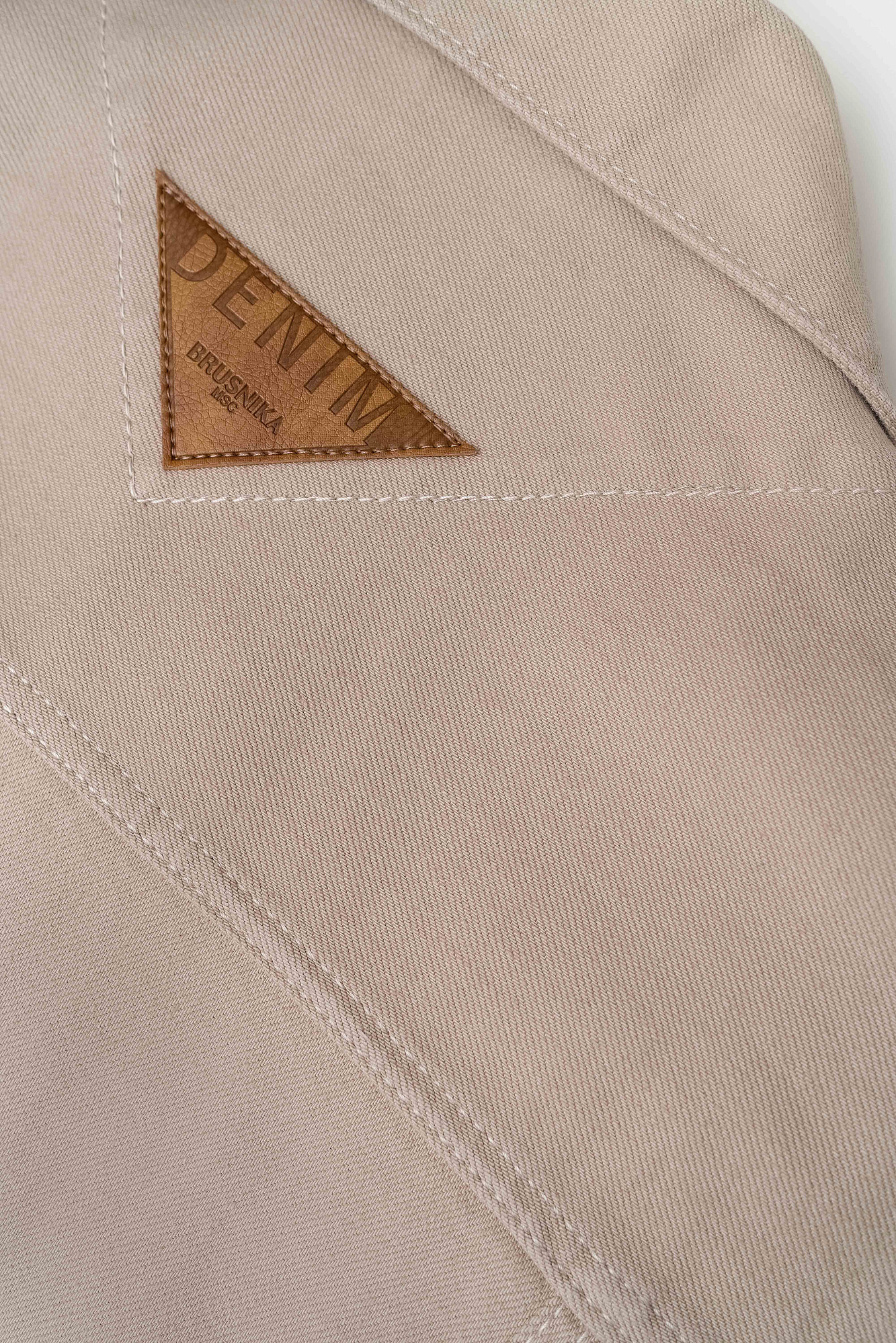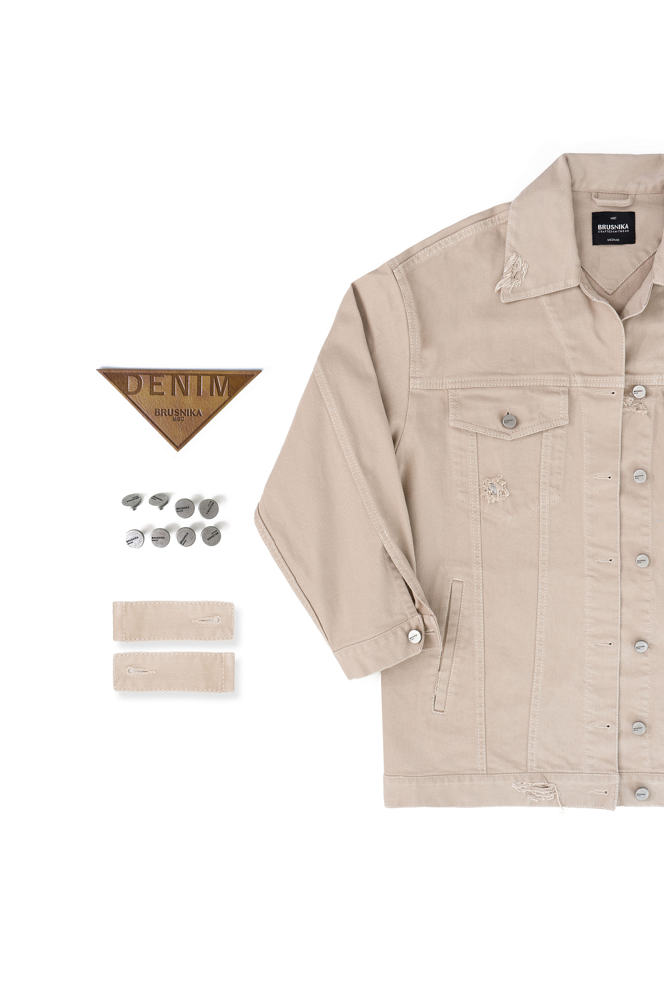 Джинсовый жакет прямого кроя. Отложной воротник, длинные рукава с манжетами на пуговицах. Модель декорирована накладными карманами на груди и брендированным ярлыком на спине. Застежка на пуговицы.
