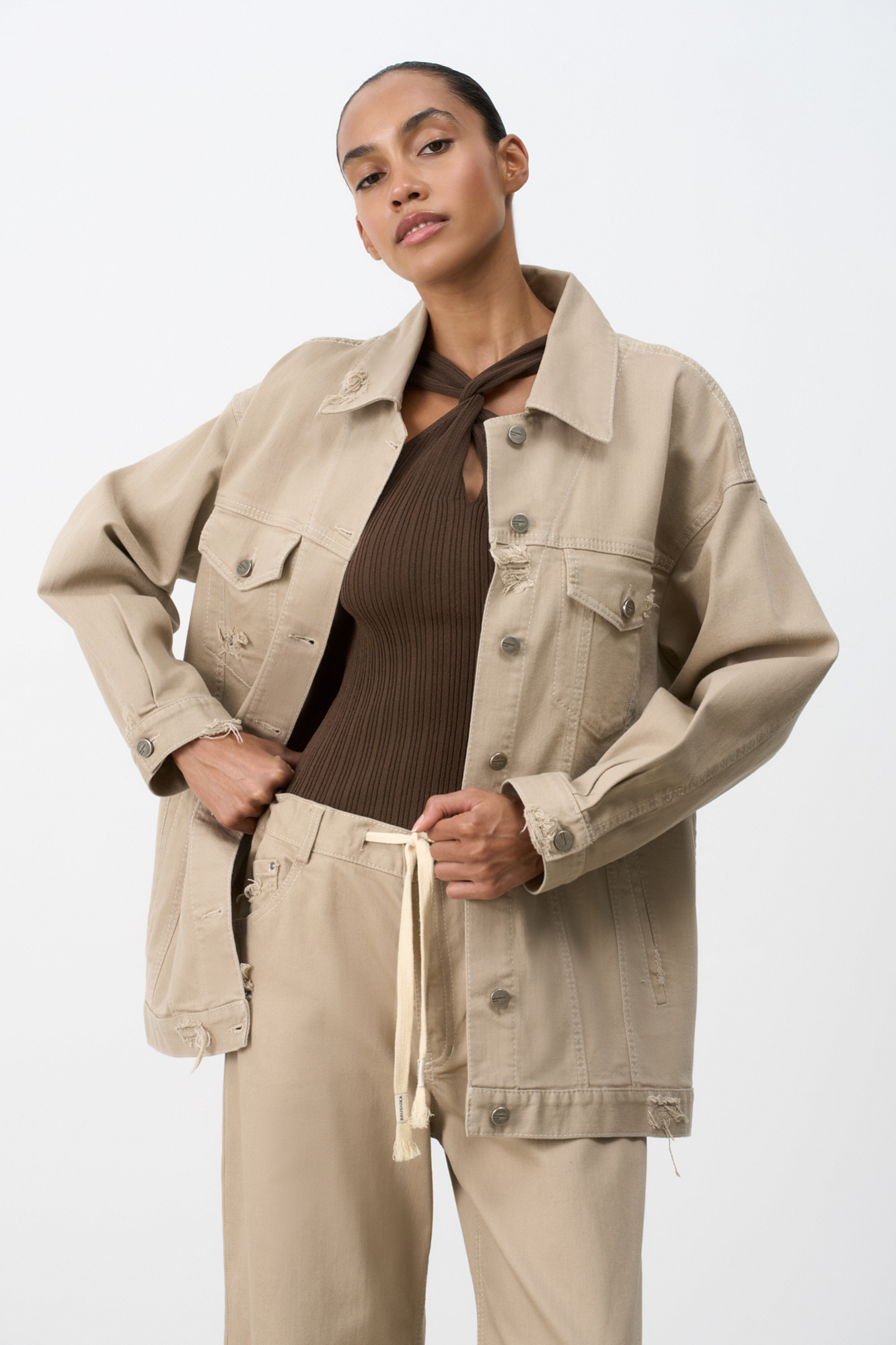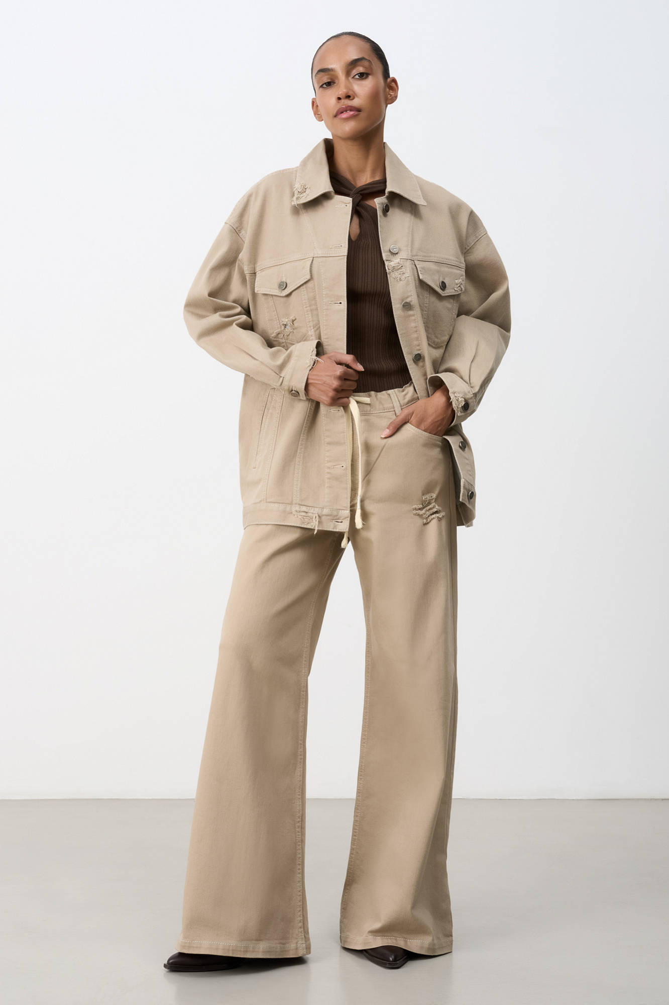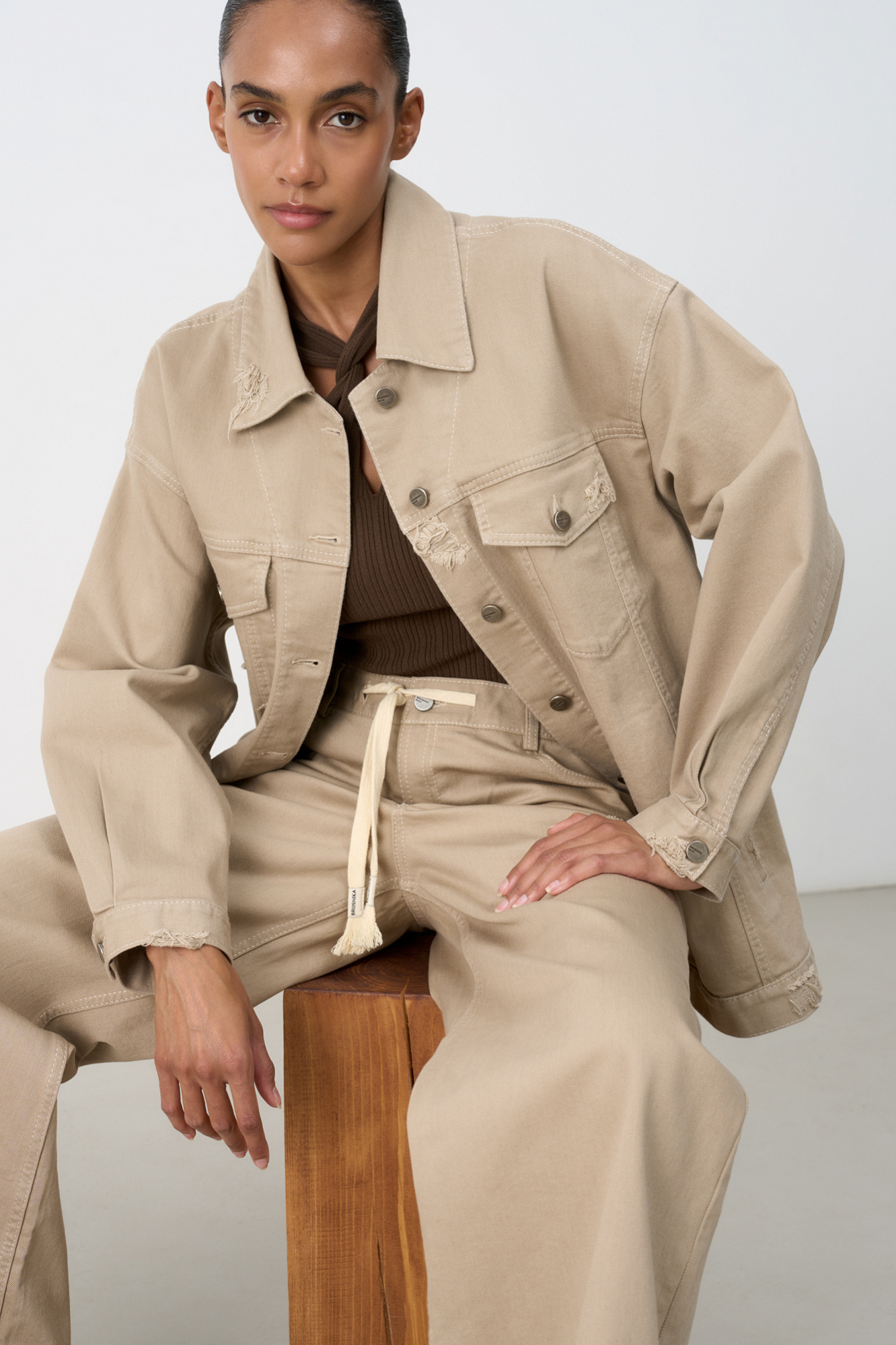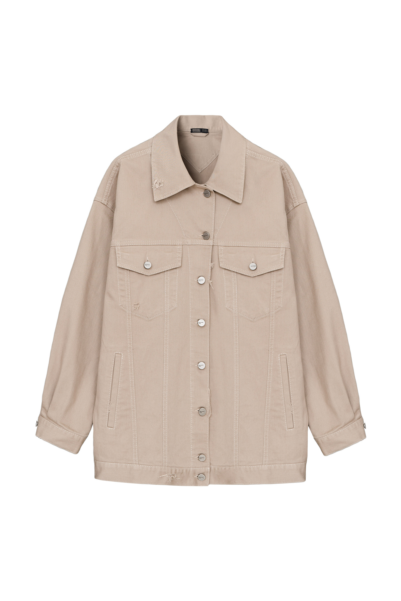 Джинсовый жакет прямого кроя. Отложной воротник, длинные рукава с манжетами на пуговицах. Модель декорирована накладными карманами на груди и брендированным ярлыком на спине. Застежка на пуговицы.
