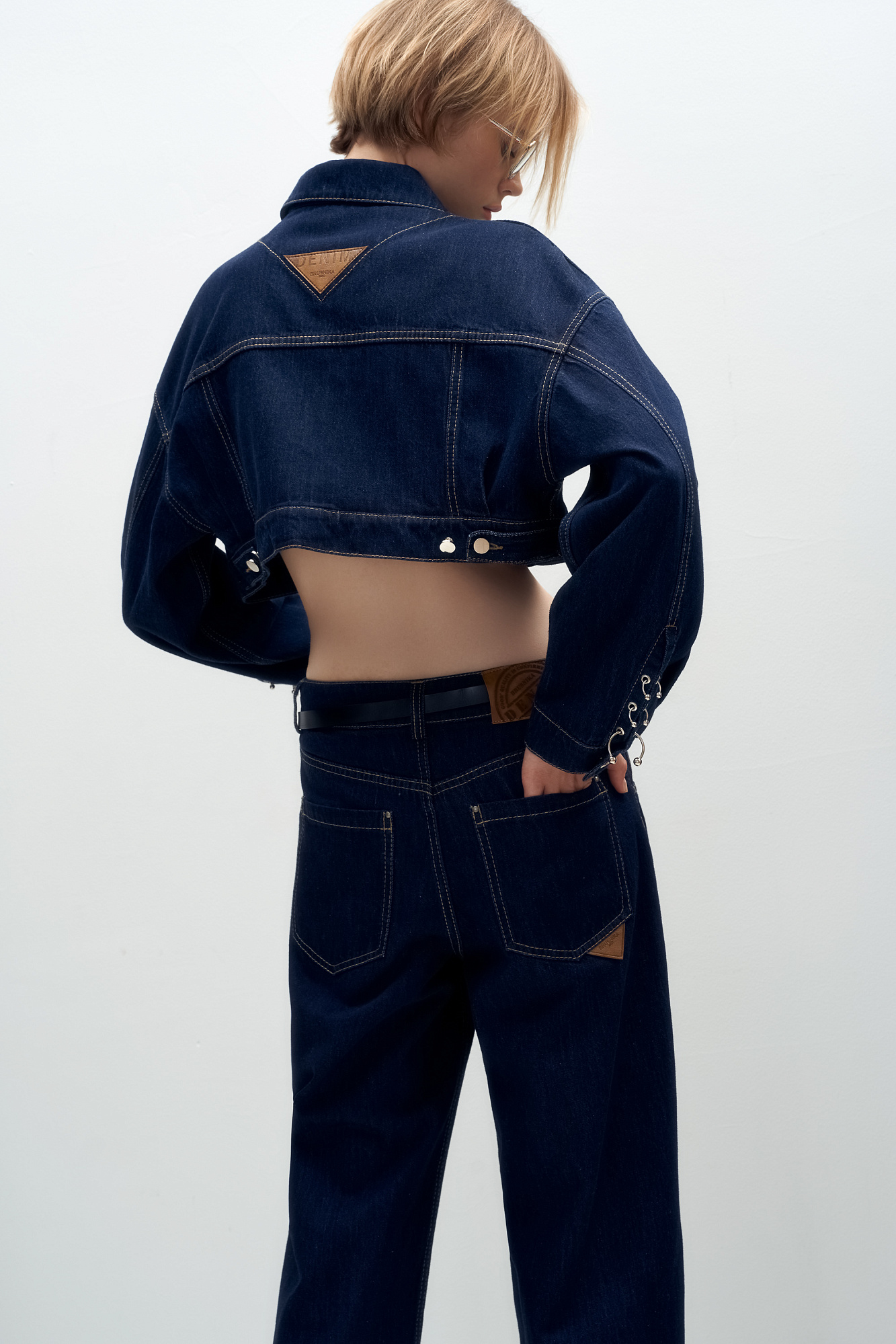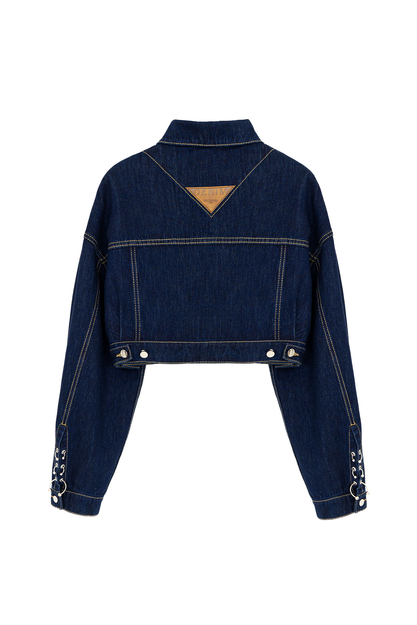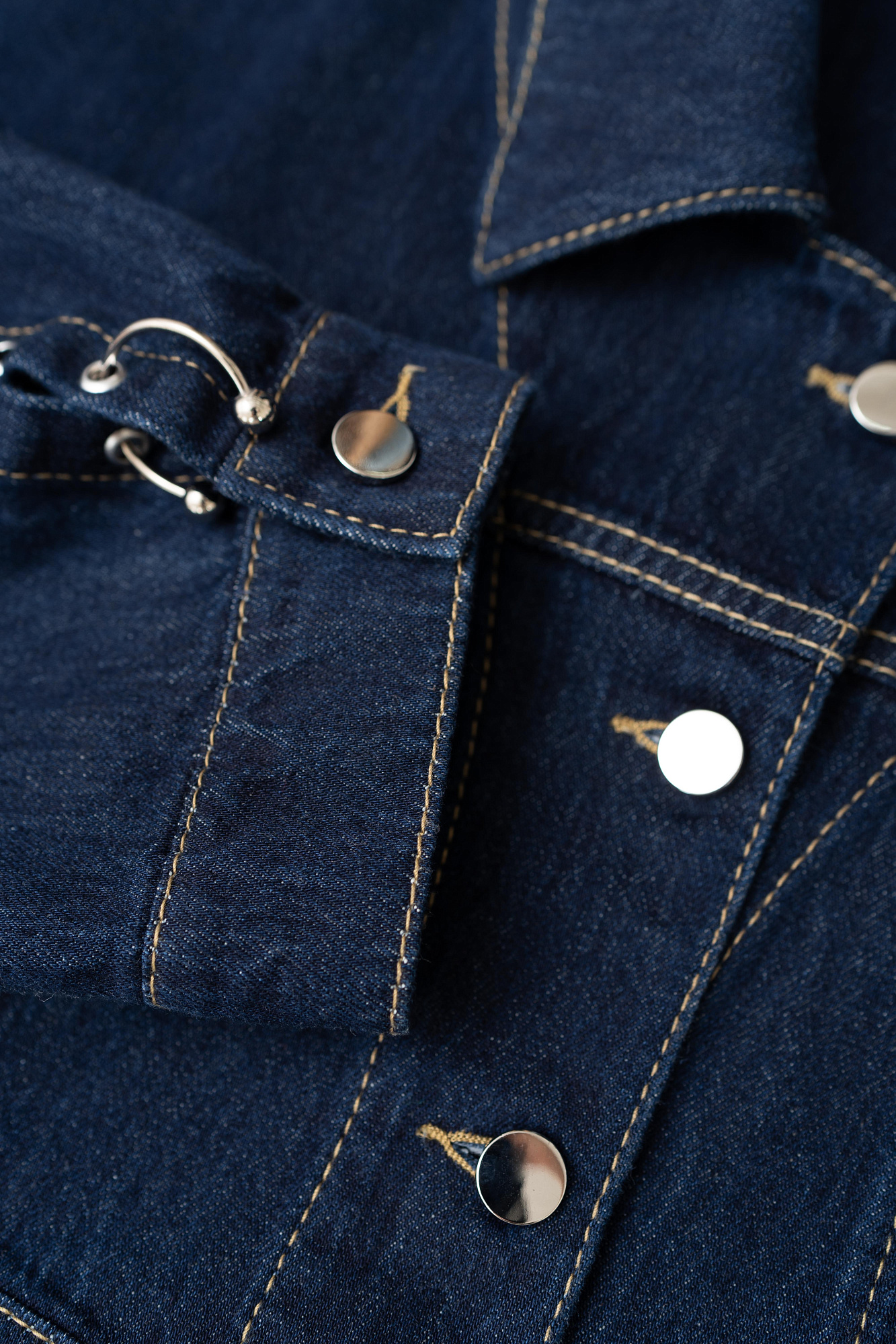 Укороченная куртка прямого кроя из денима с отложным воротником и хлястиками на поясе. Модель декорирована накладными карманами на груди, металлической фурнитурой в виде пирсинга на манжетах и брендированным ярлыком на спине. Застежка на пуговицы.