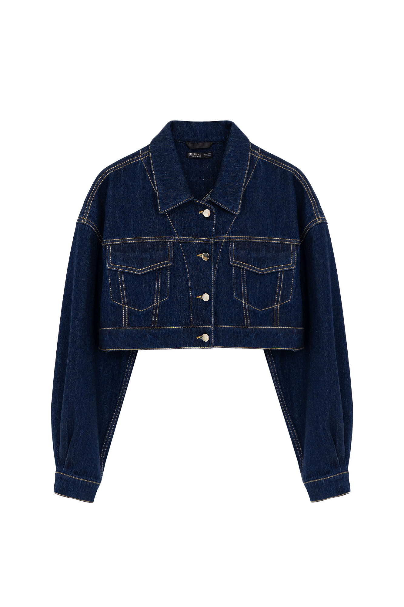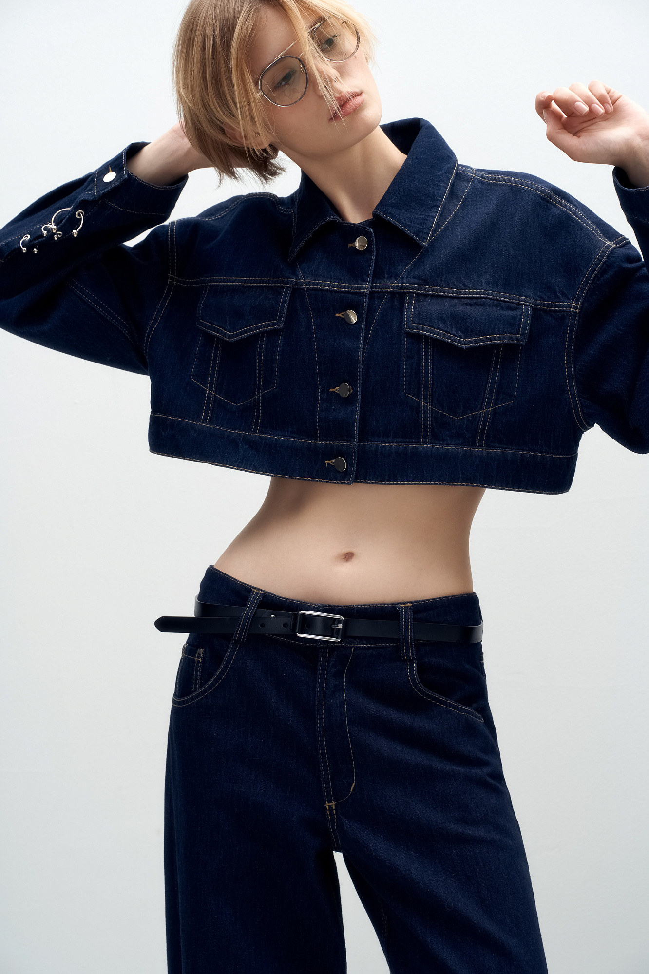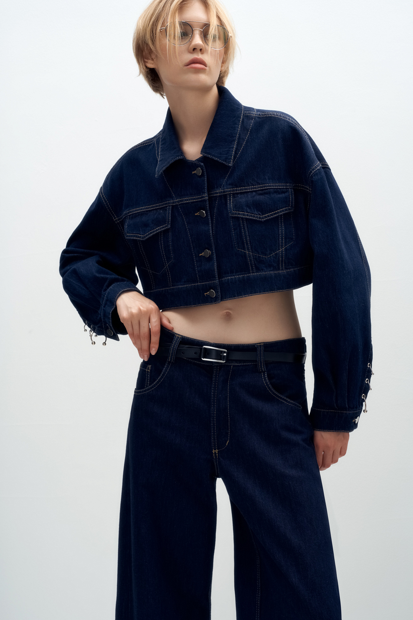 Укороченная куртка прямого кроя из денима с отложным воротником и хлястиками на поясе. Модель декорирована накладными карманами на груди, металлической фурнитурой в виде пирсинга на манжетах и брендированным ярлыком на спине. Застежка на пуговицы.