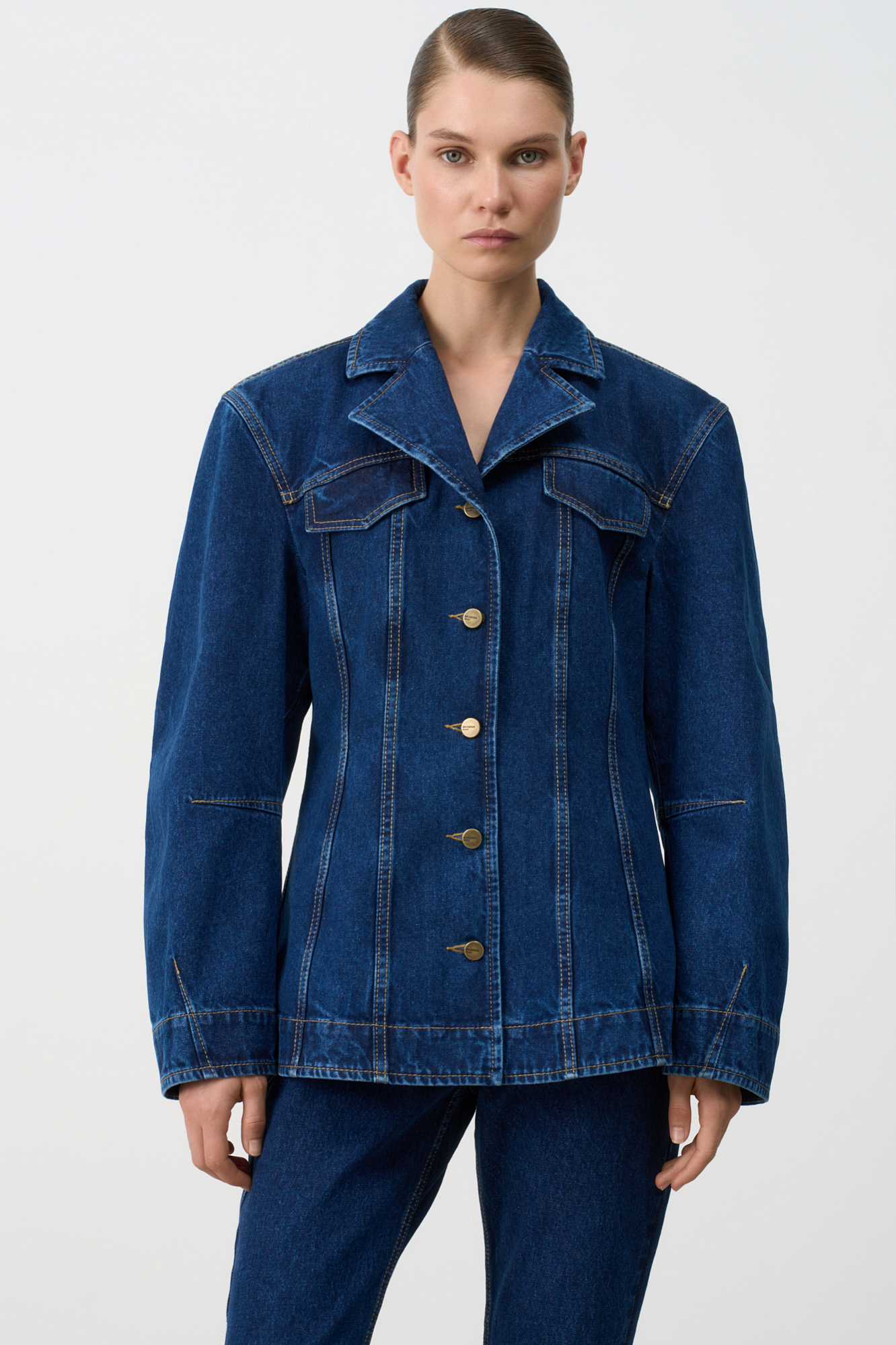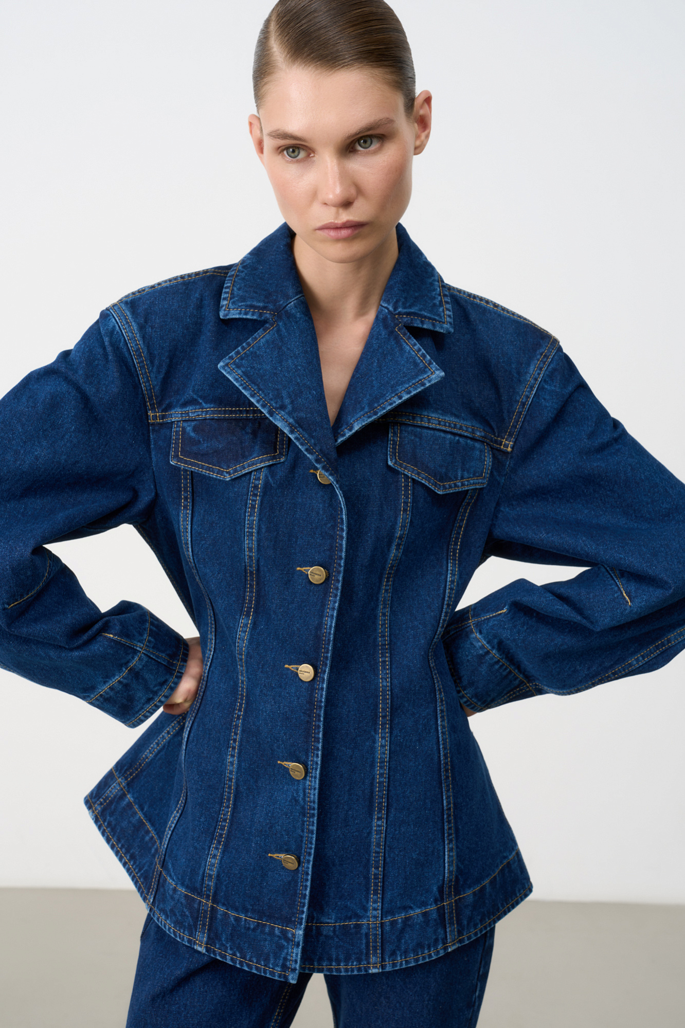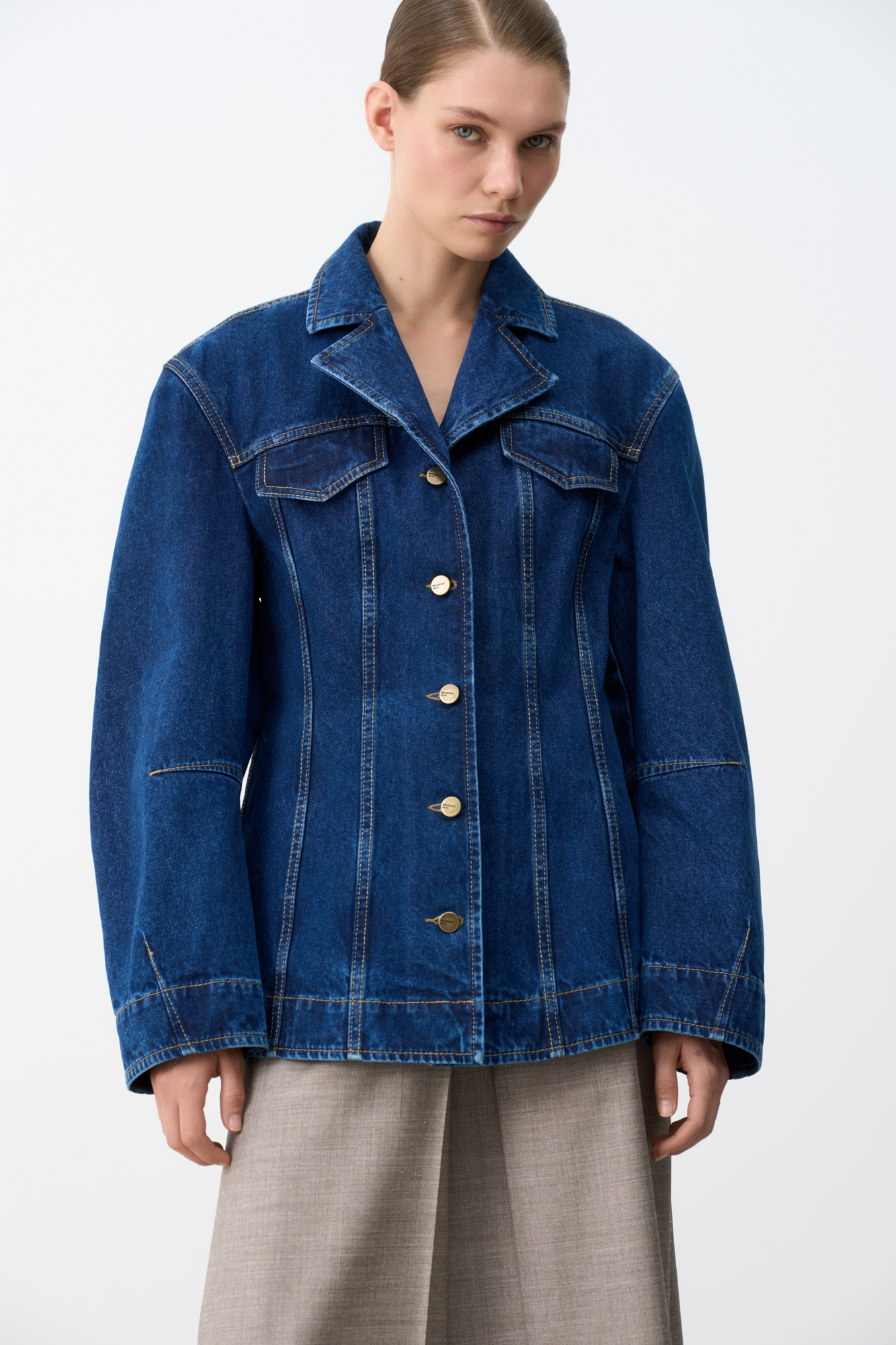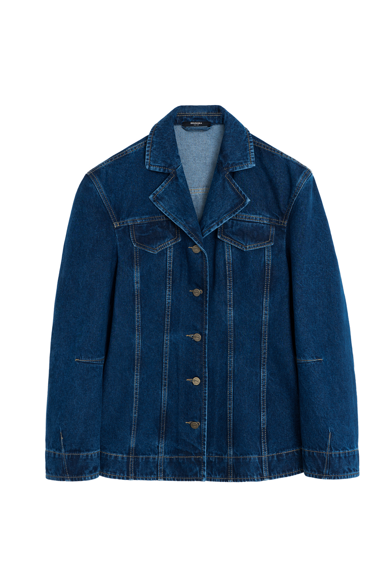 Джинсовый жакет с рельефными швами. Модель свободного силуэта со спущенной линией плеча и застежкой на металлические пуговицы.