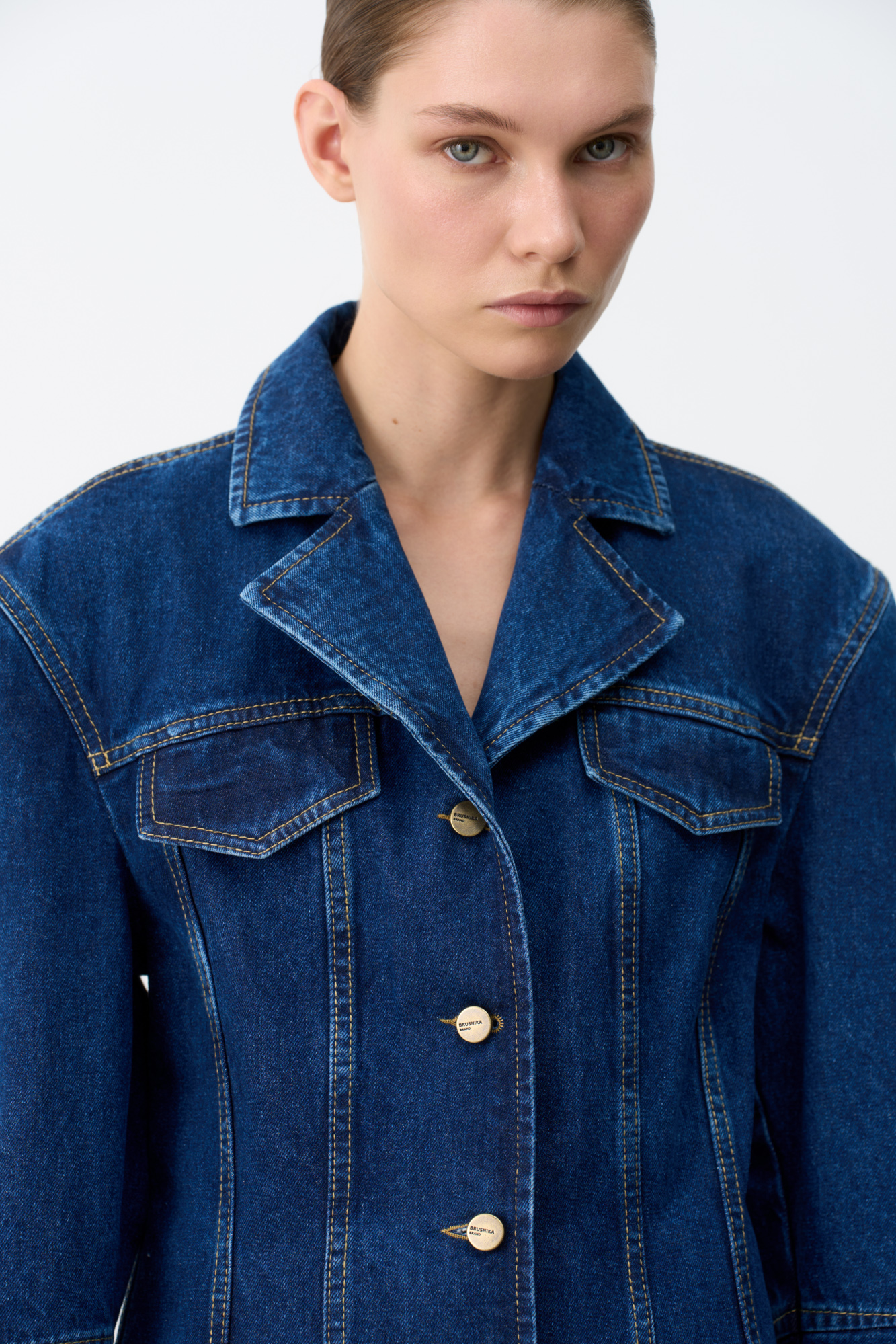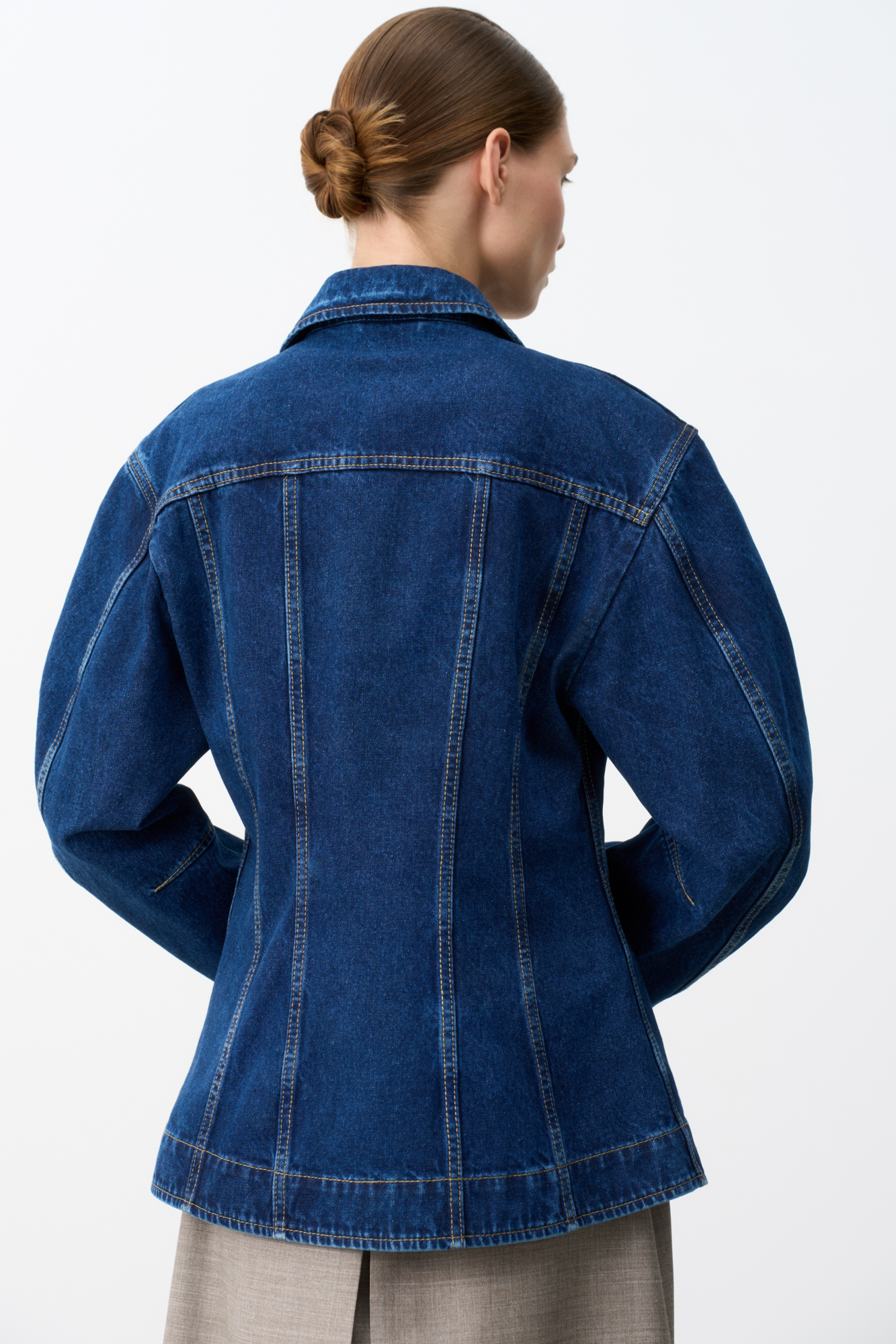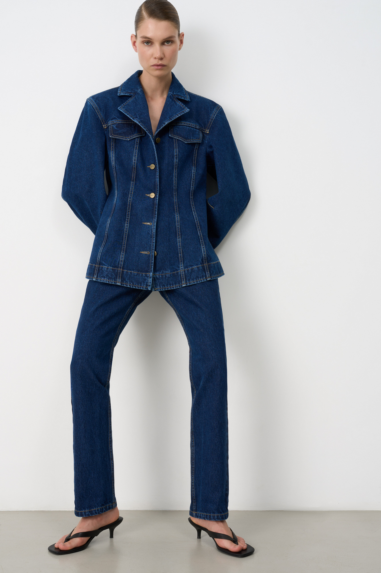 Джинсовый жакет с рельефными швами. Модель свободного силуэта со спущенной линией плеча и застежкой на металлические пуговицы.