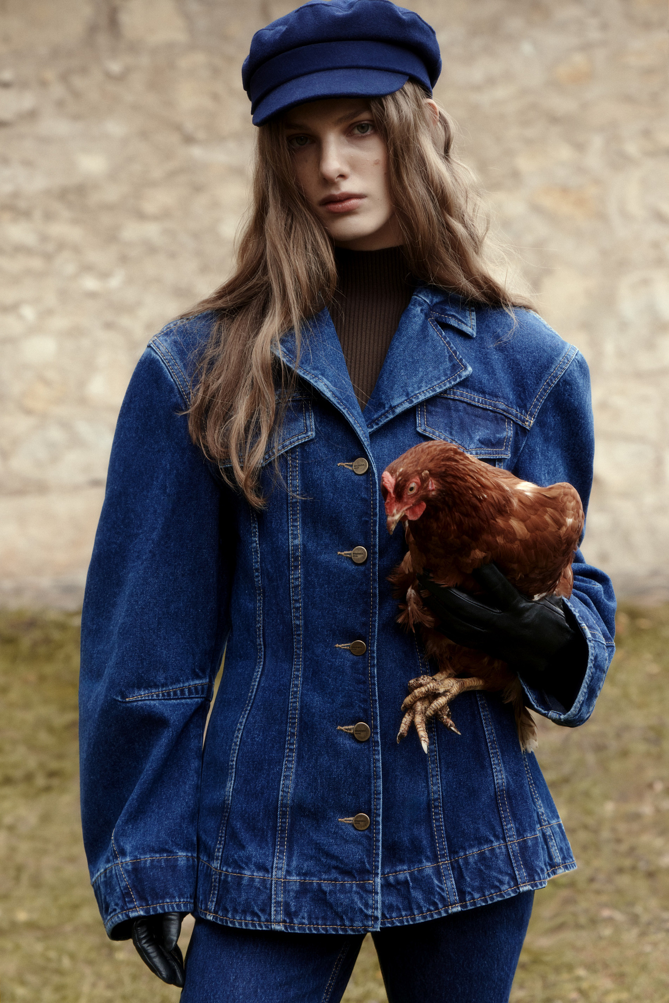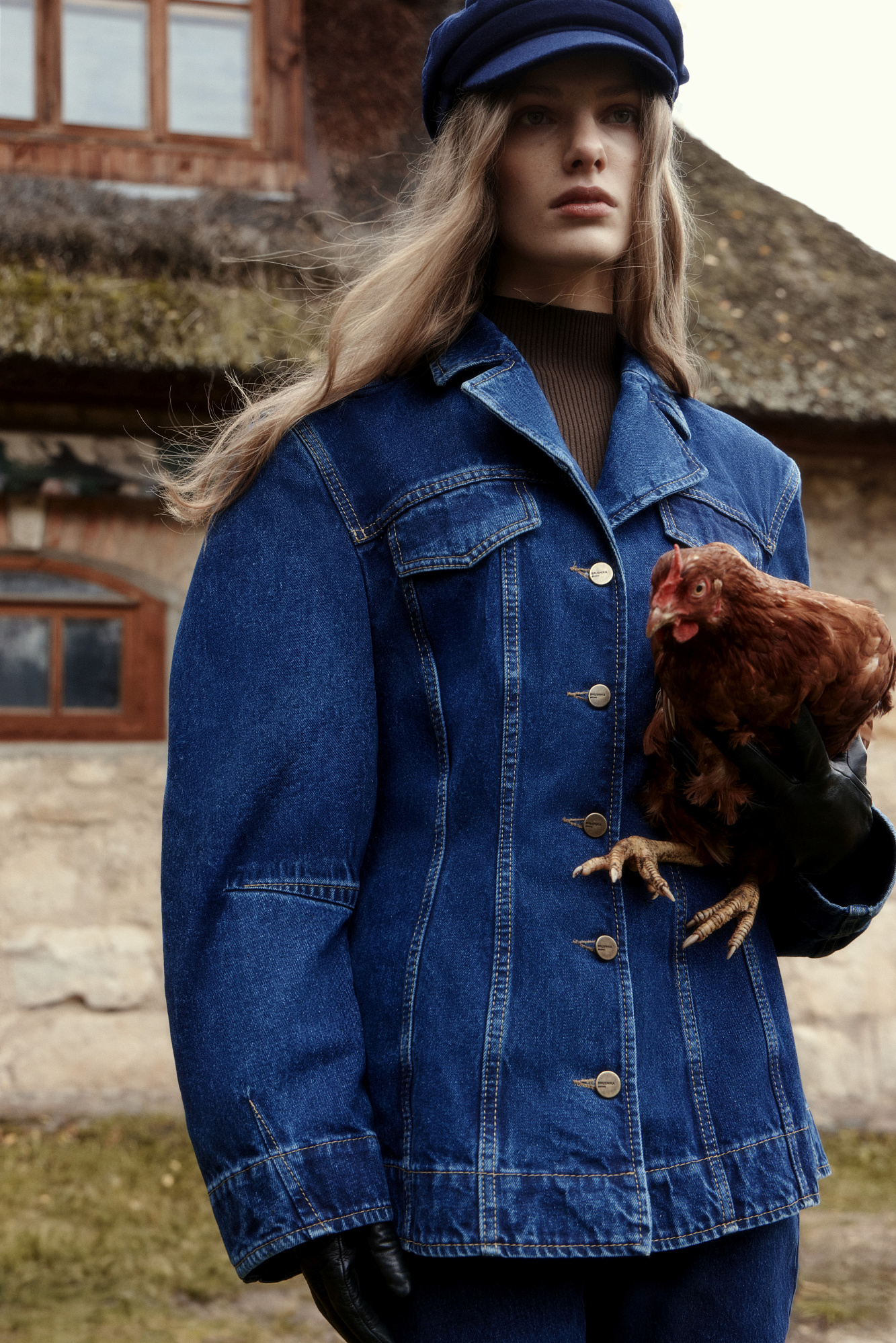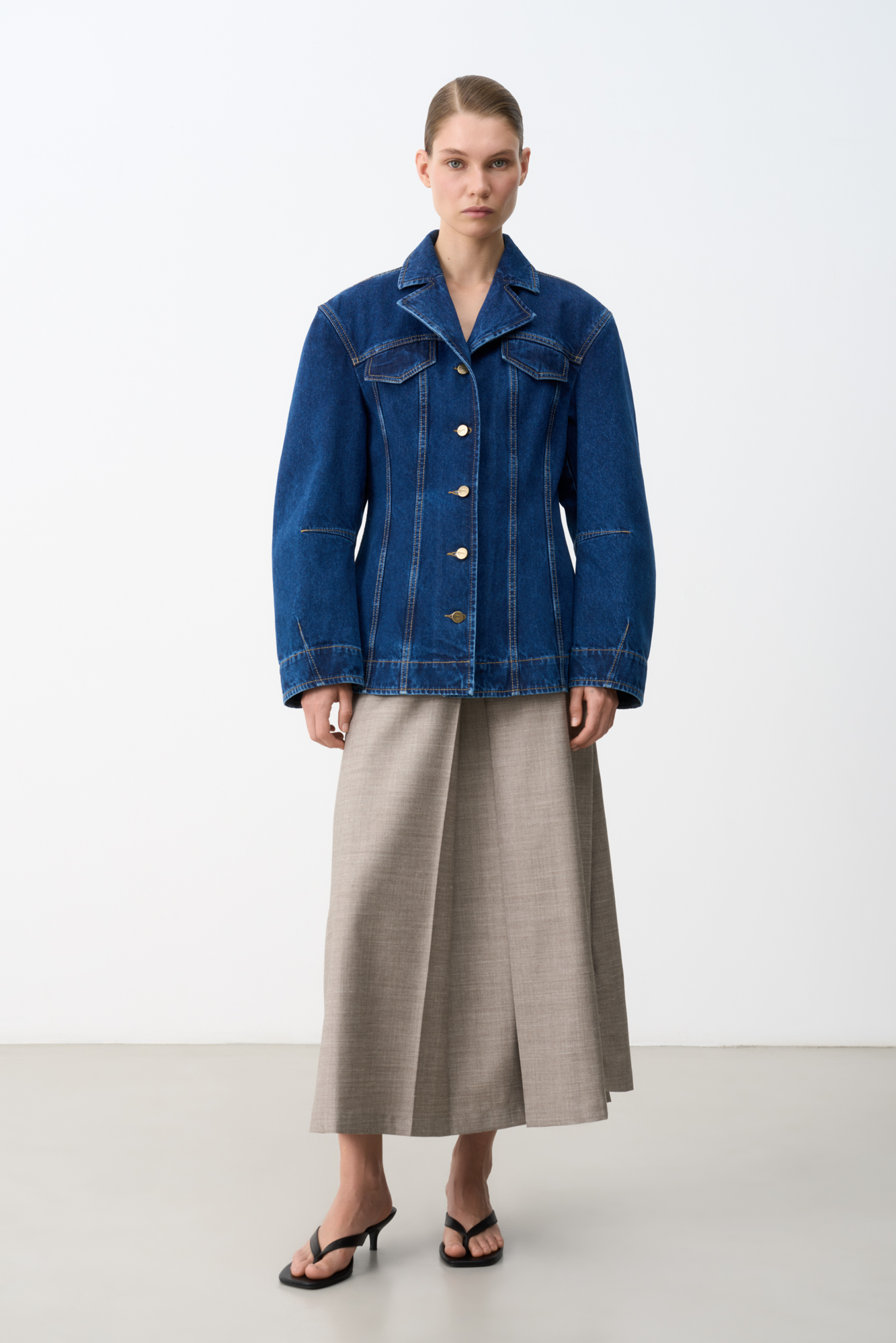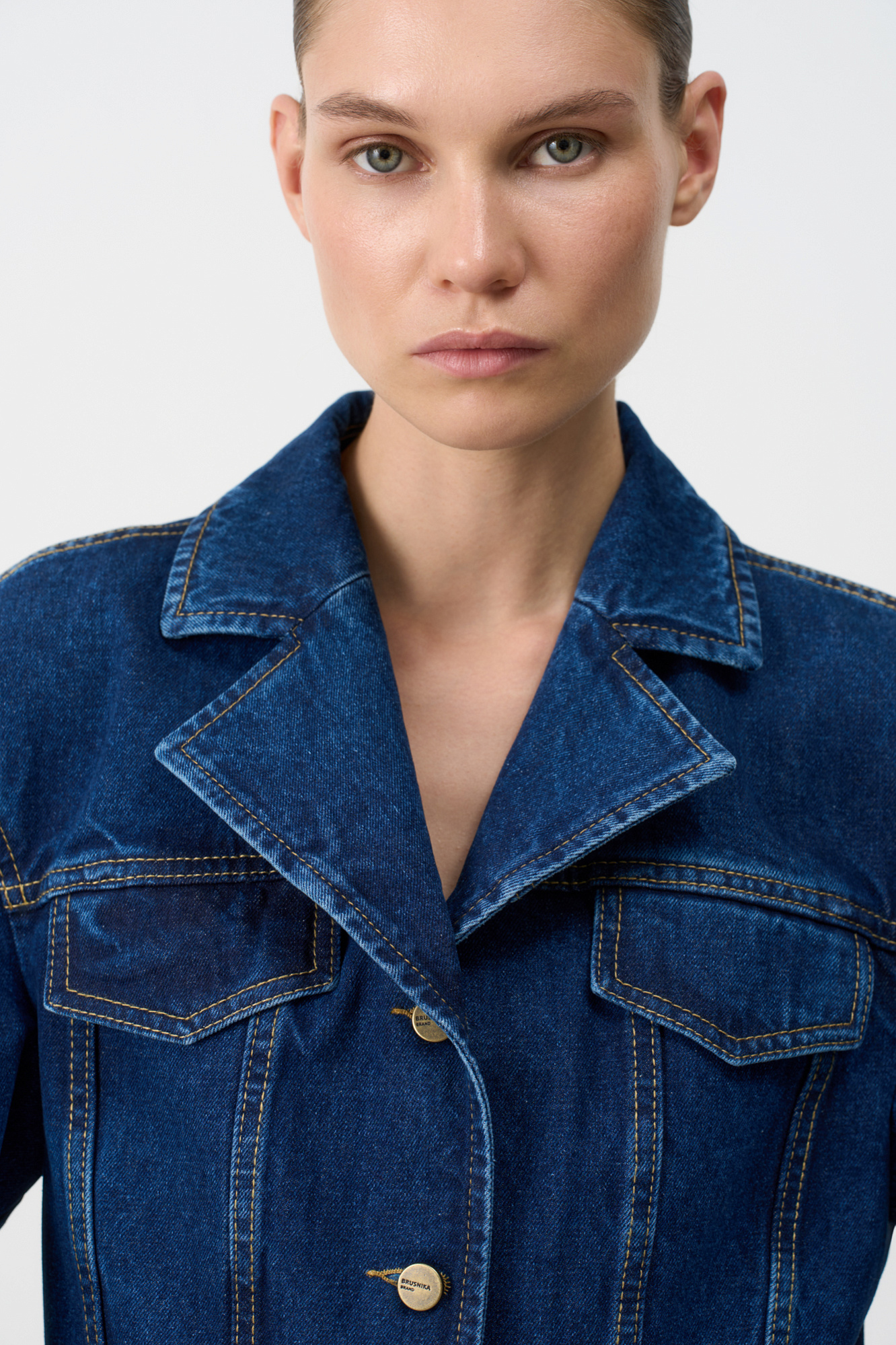 Джинсовый жакет с рельефными швами. Модель свободного силуэта со спущенной линией плеча и застежкой на металлические пуговицы.