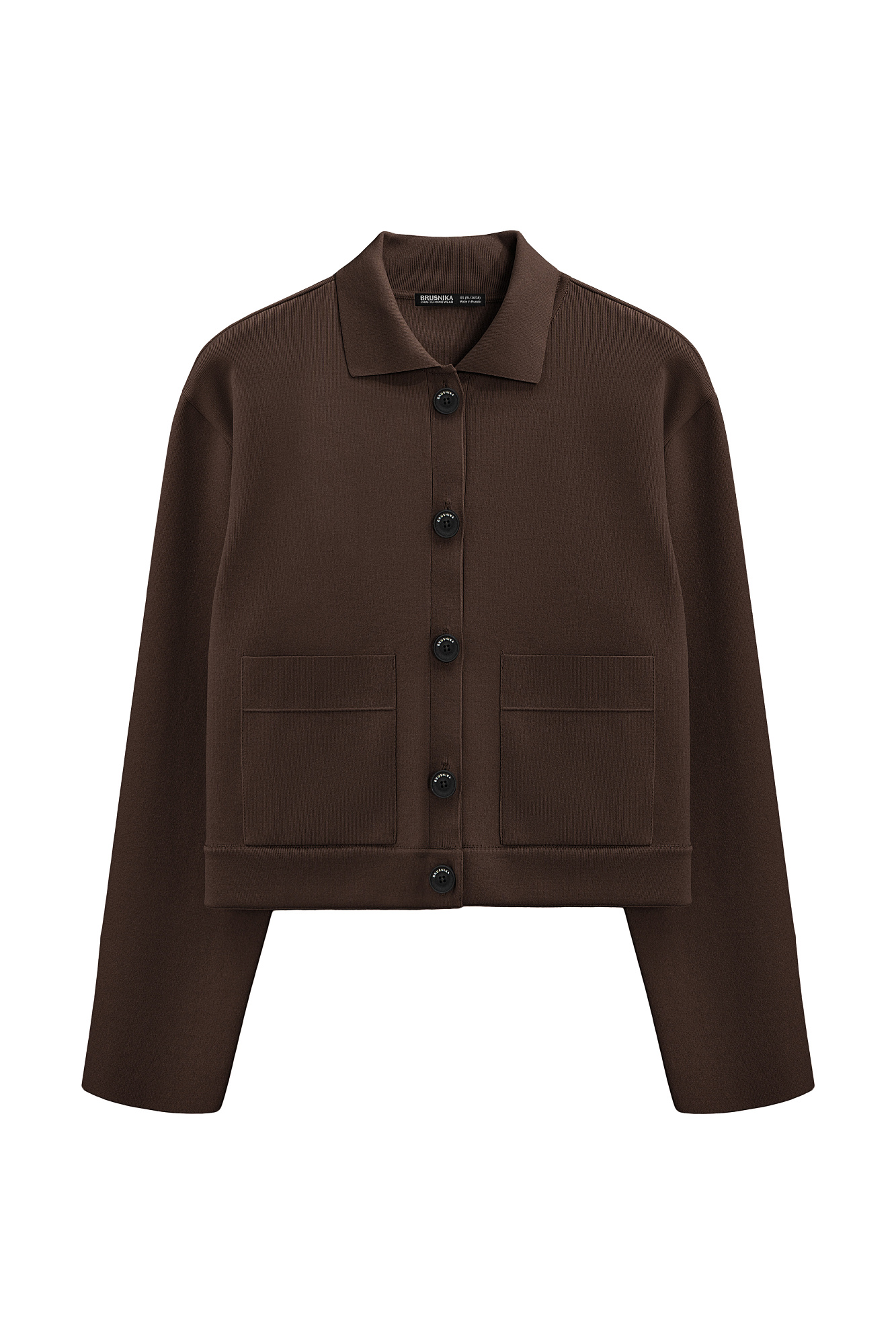 Укороченный трикотажный жакет из вискозы. Модель с отложным воротником и накладными карманам. Застежка на пуговицы. Изделие выполнено без подкладки.