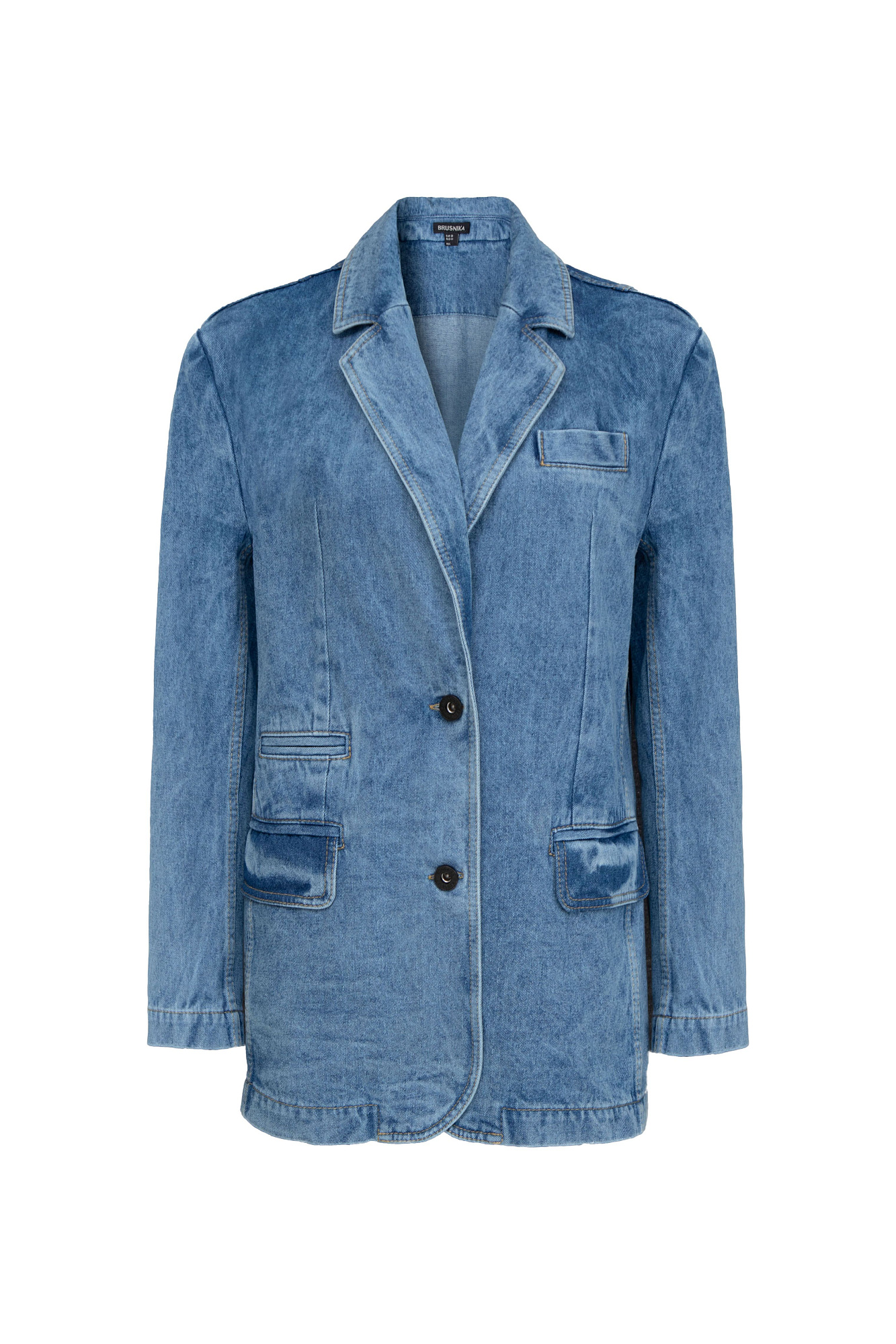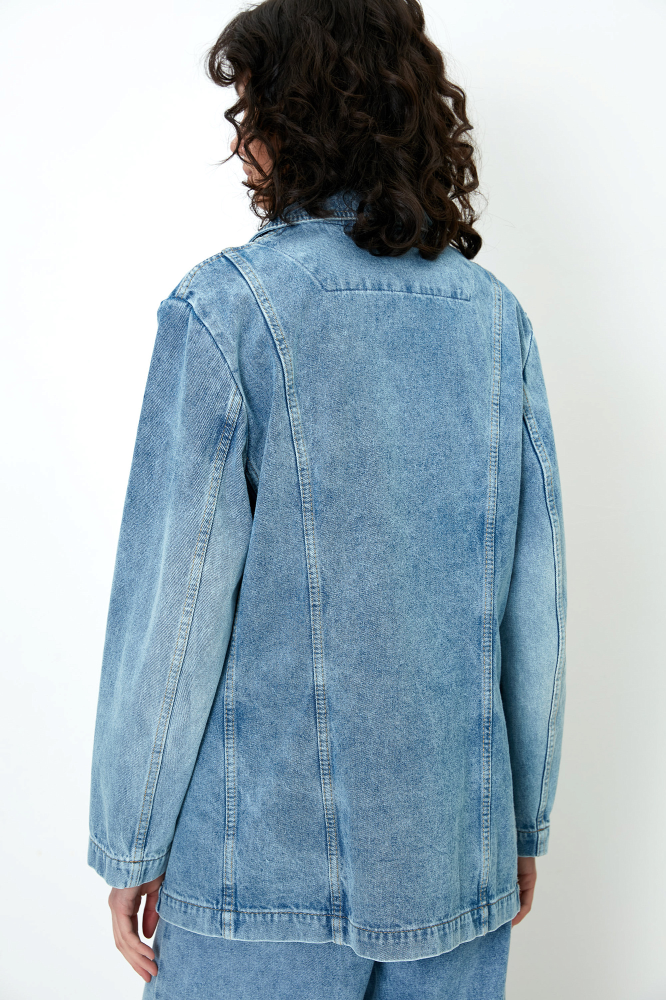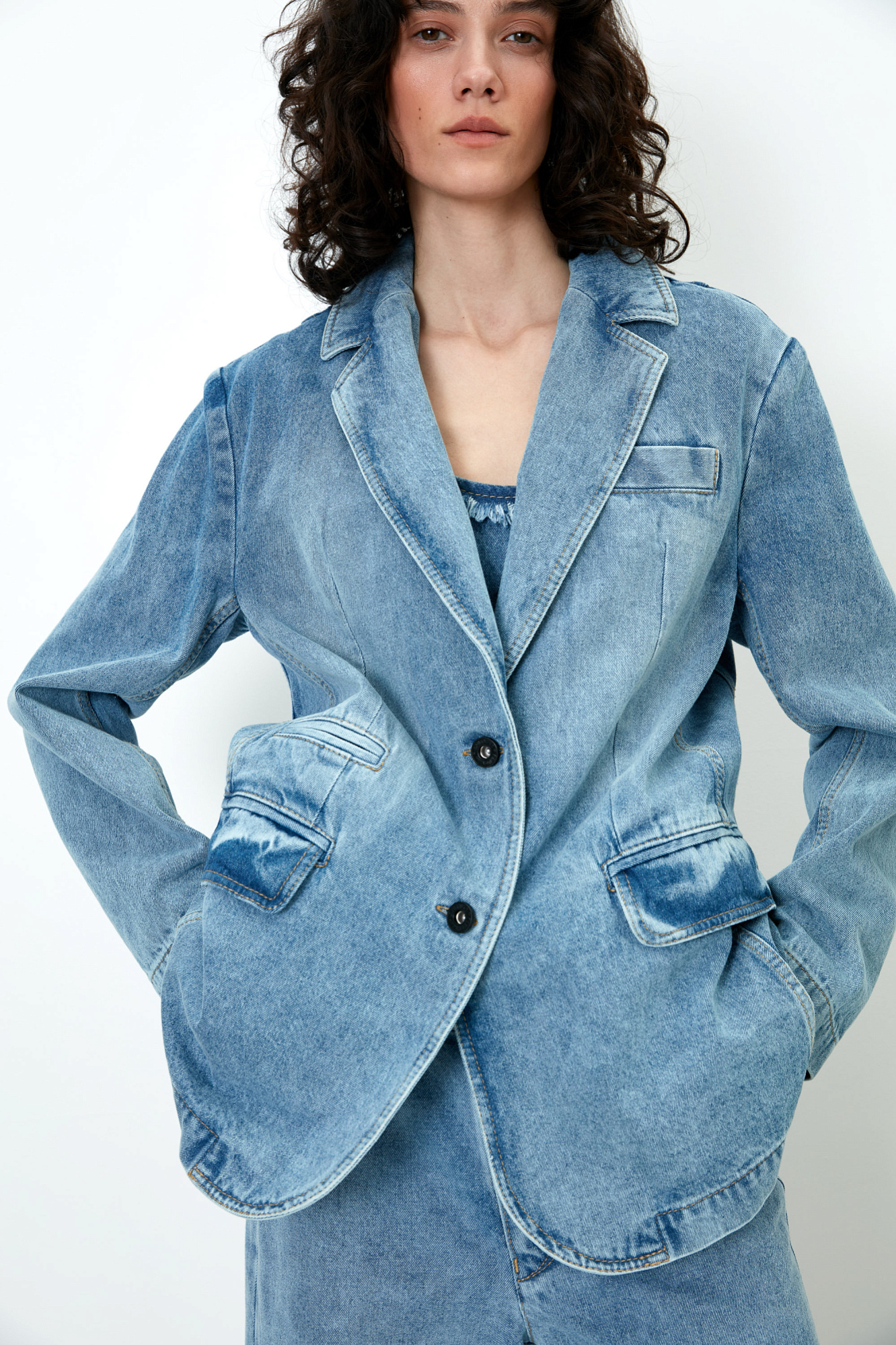 Джинсовый жакет из 100% хлопка. Модель прямого силуэта с английским воротником, прорезными карманами с карманами по бокам и на груди. Застежка на две пуговицы.