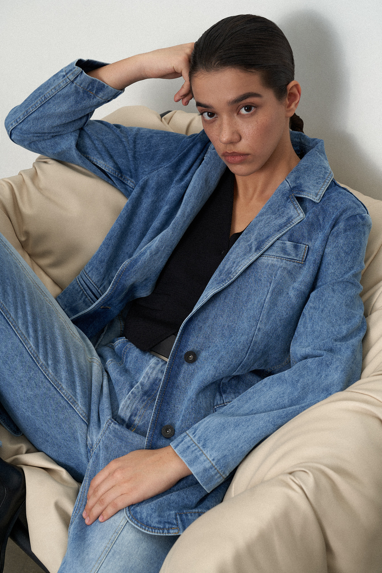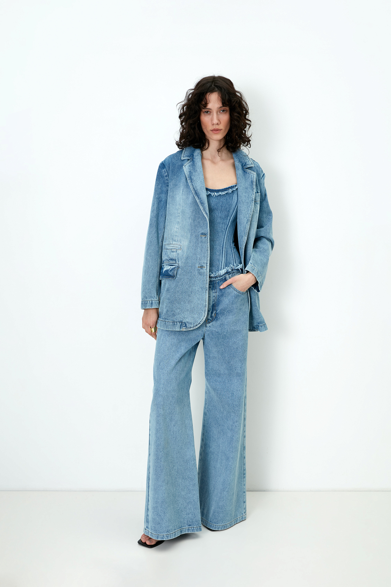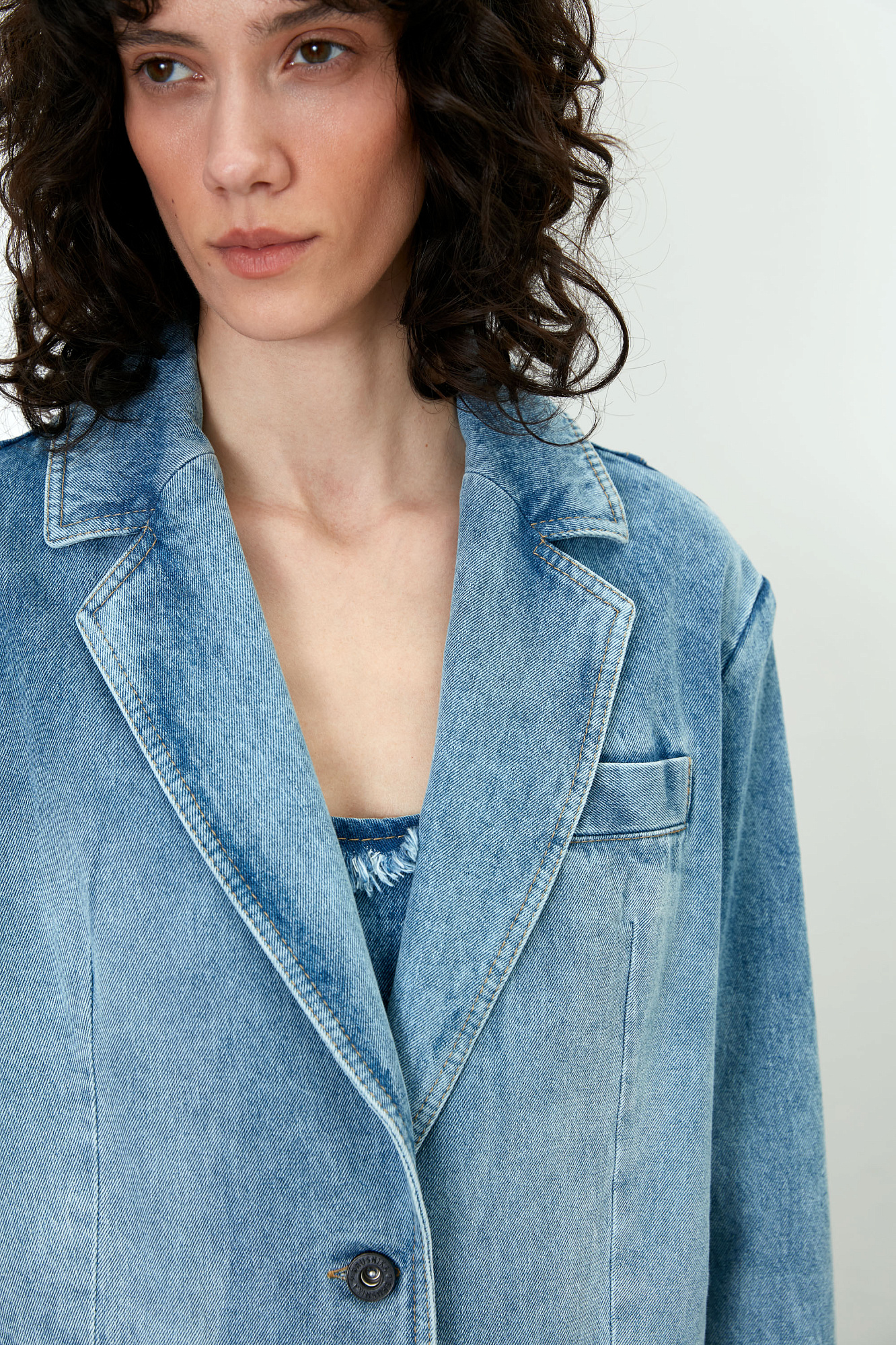 Джинсовый жакет из 100% хлопка. Модель прямого силуэта с английским воротником, прорезными карманами с карманами по бокам и на груди. Застежка на две пуговицы.