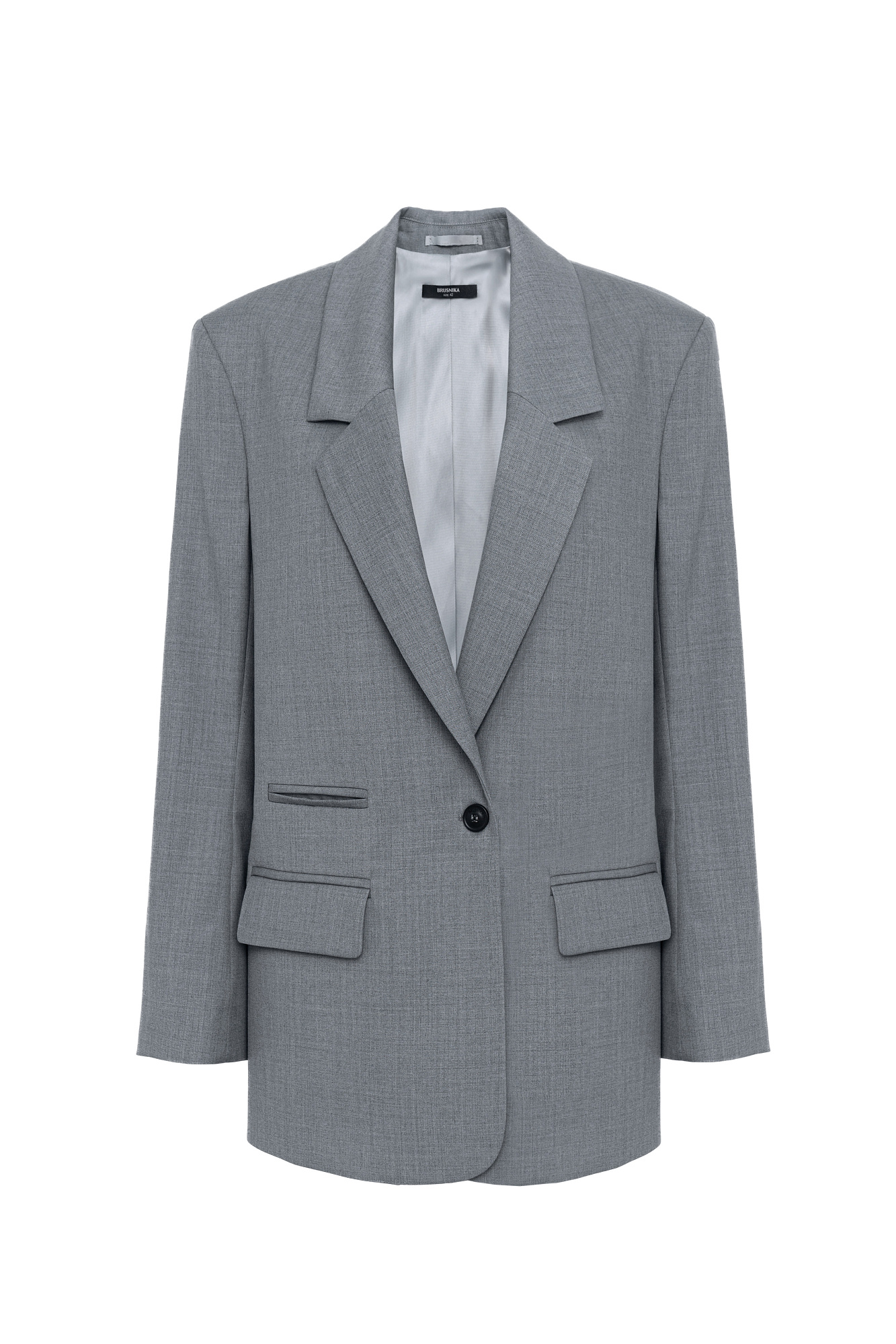 Классический жакет с накладными карманами, подплечниками, разрезами по бокам и удлиненной спинкой. Длинные рукава на манжетах без пуговиц. Застежка на пуговицу.
