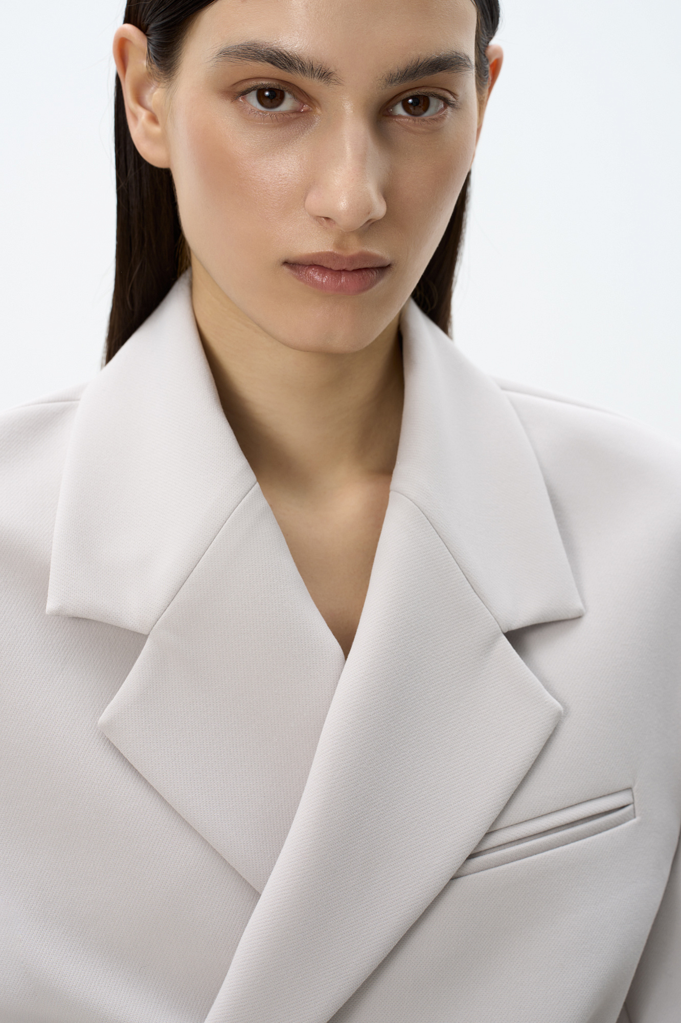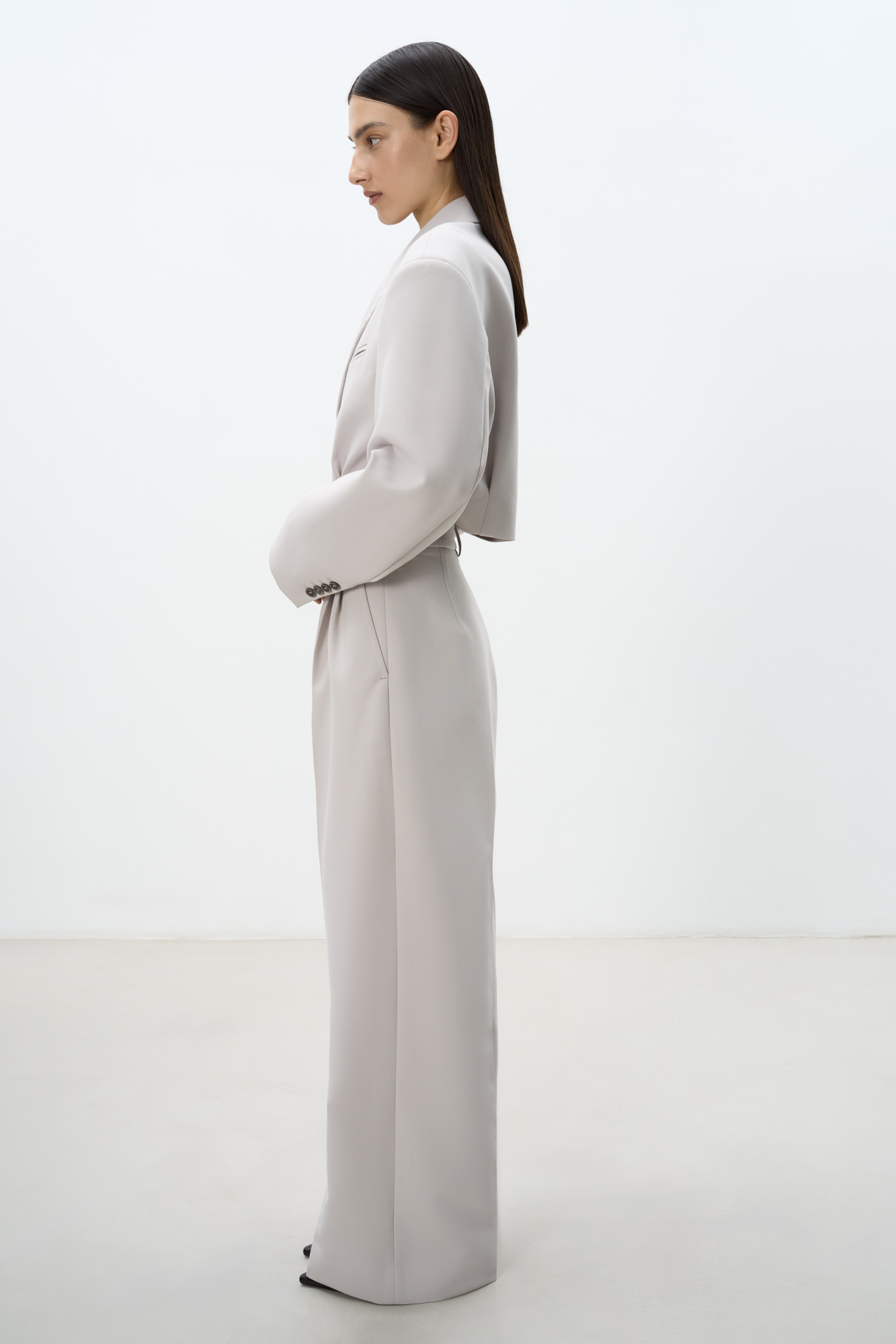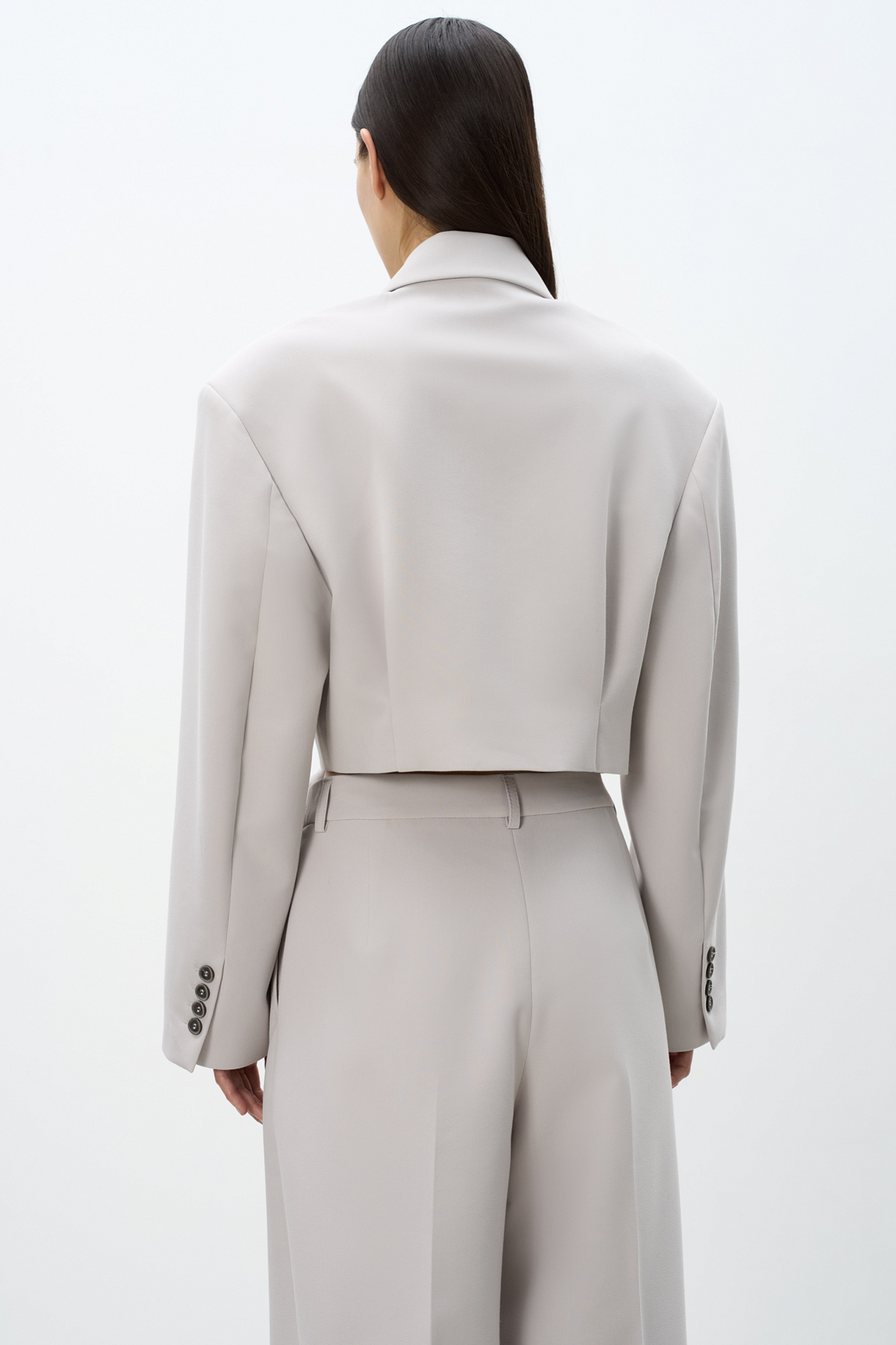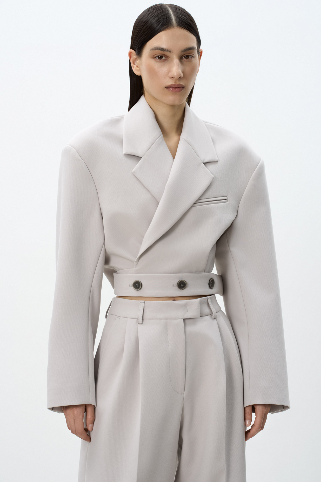 Укороченный жакет на запах с поясом. Отложной воротник с прямоугольными лацканами и декоративный нагрудный карман с кантом. Модель приталенного силуэта с подкладкой, манжеты на пуговицах.