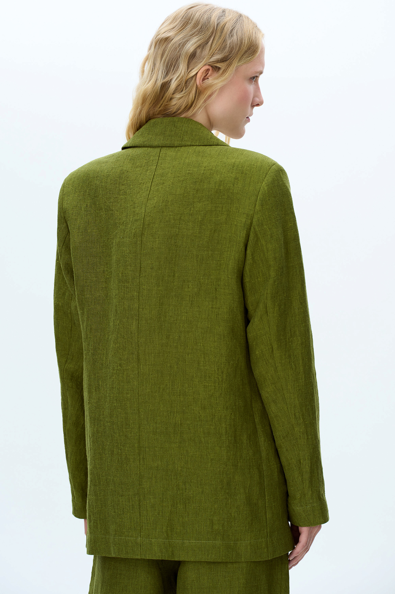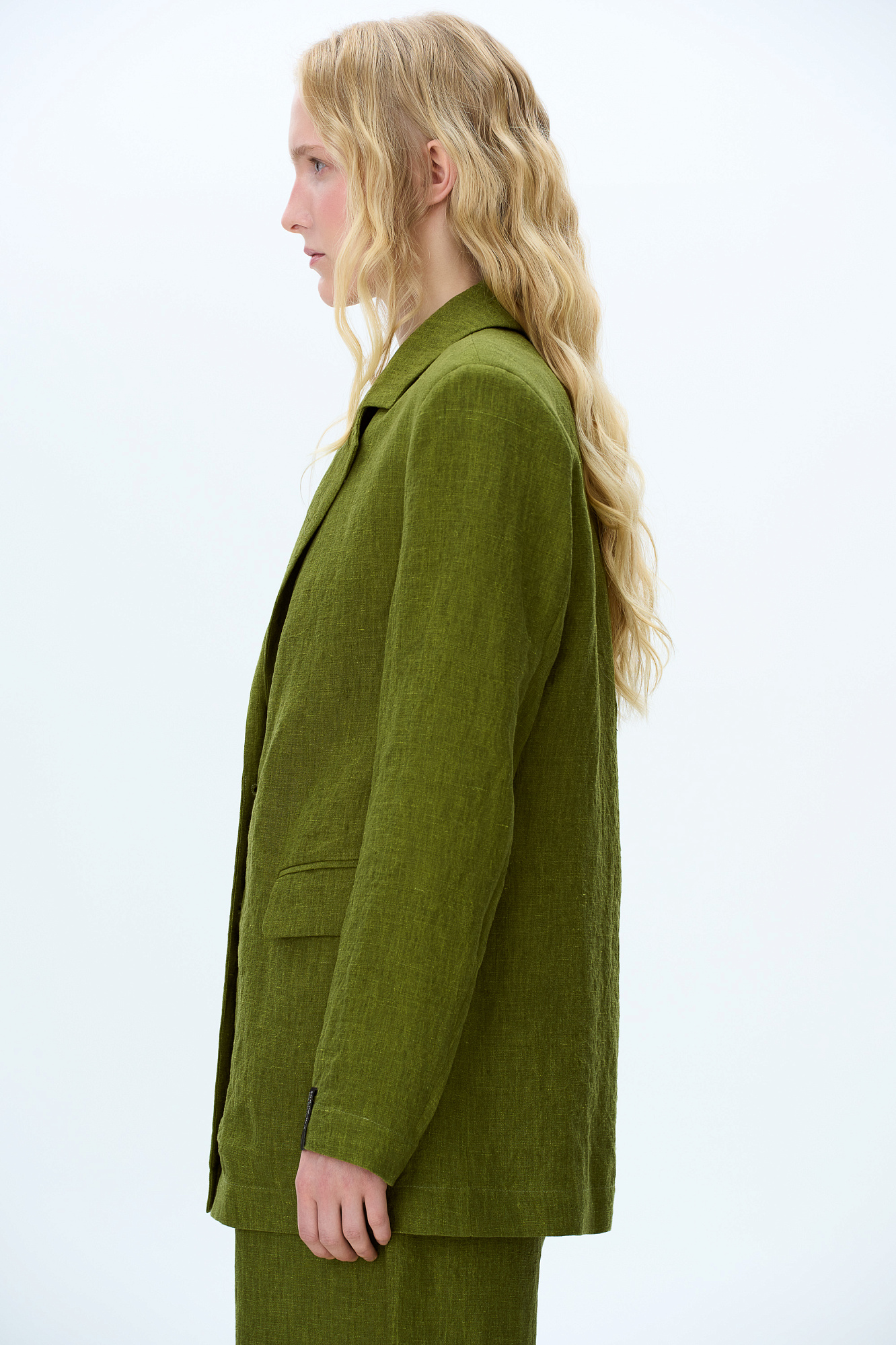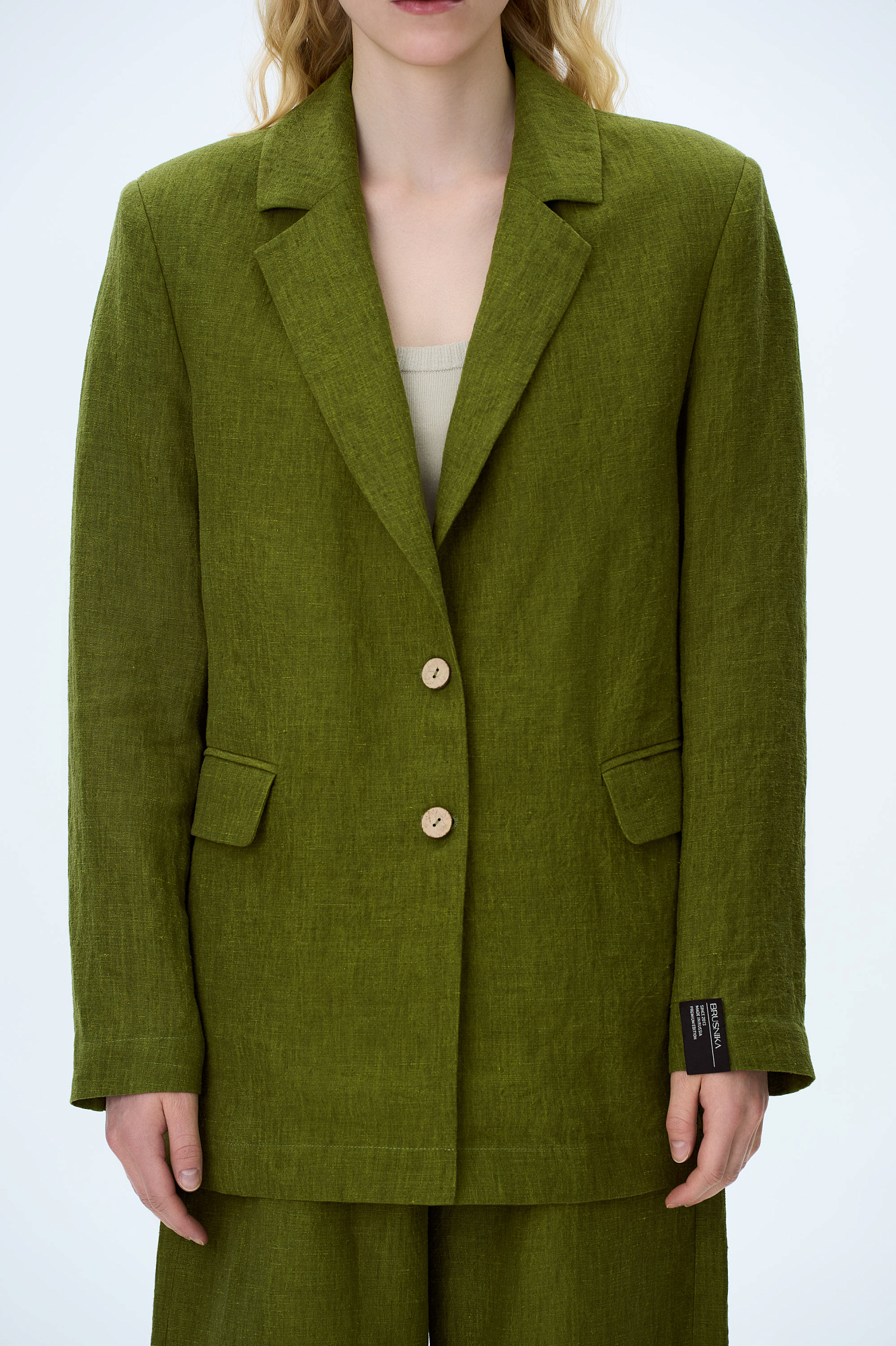 Однобортный жакет, выполненный из конопляной ткани. Модель прямого кроя, передние карманы с клапанами и брендированный ярлык на рукаве. Использование конопляной ткани придает изделию особую прочность и износостойкость, а натуральное происхождение подчеркивает экологичность данной модели.