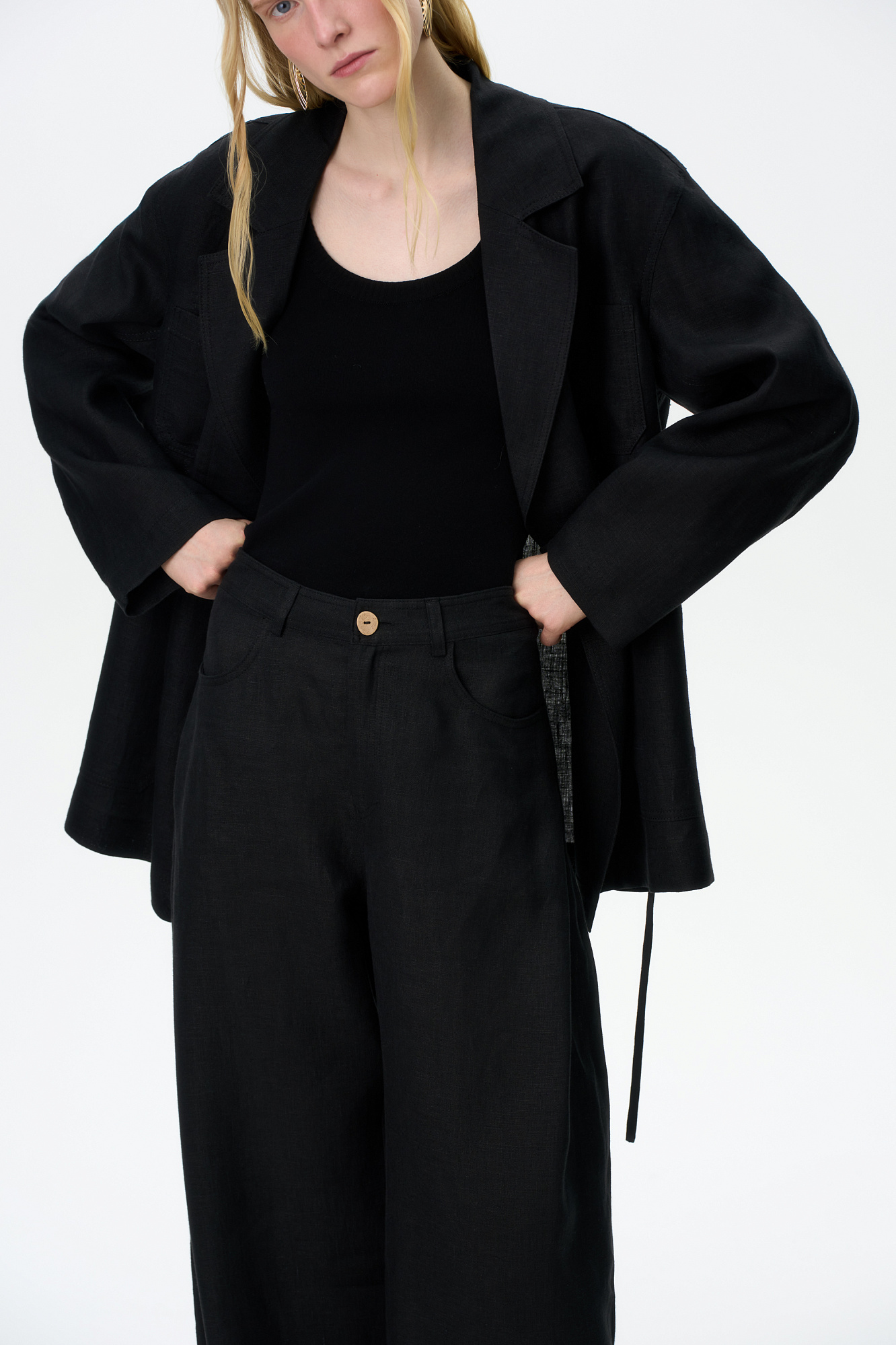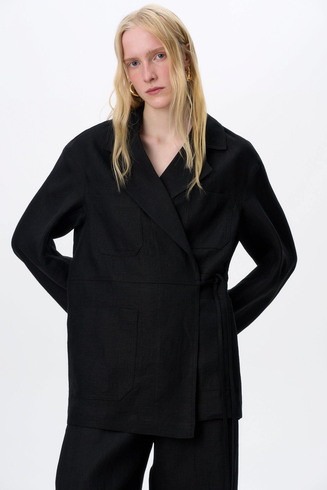 Льняной жакет на запах с поясом. Модель свободного силуэта с накладными карманами на груди.