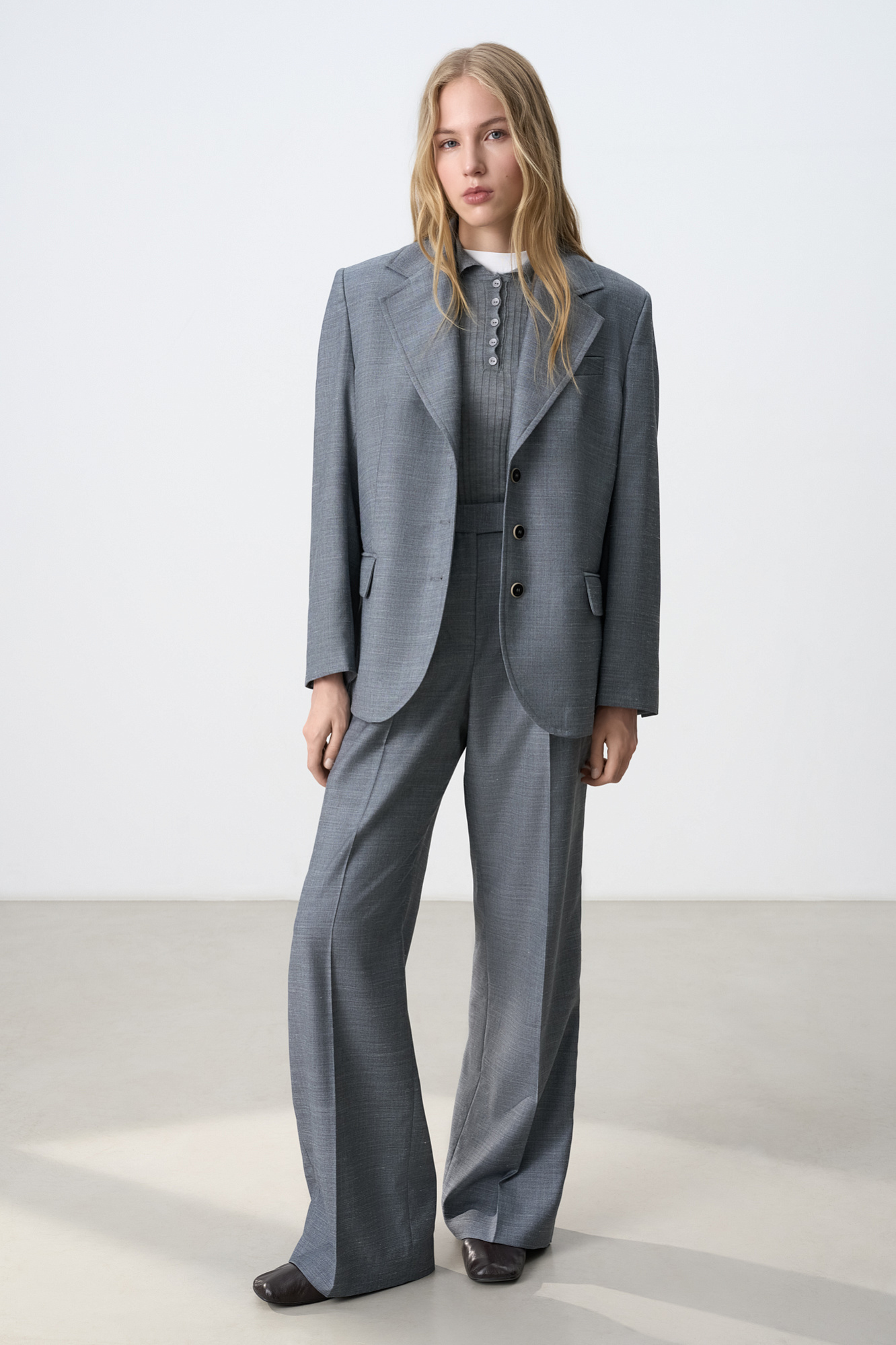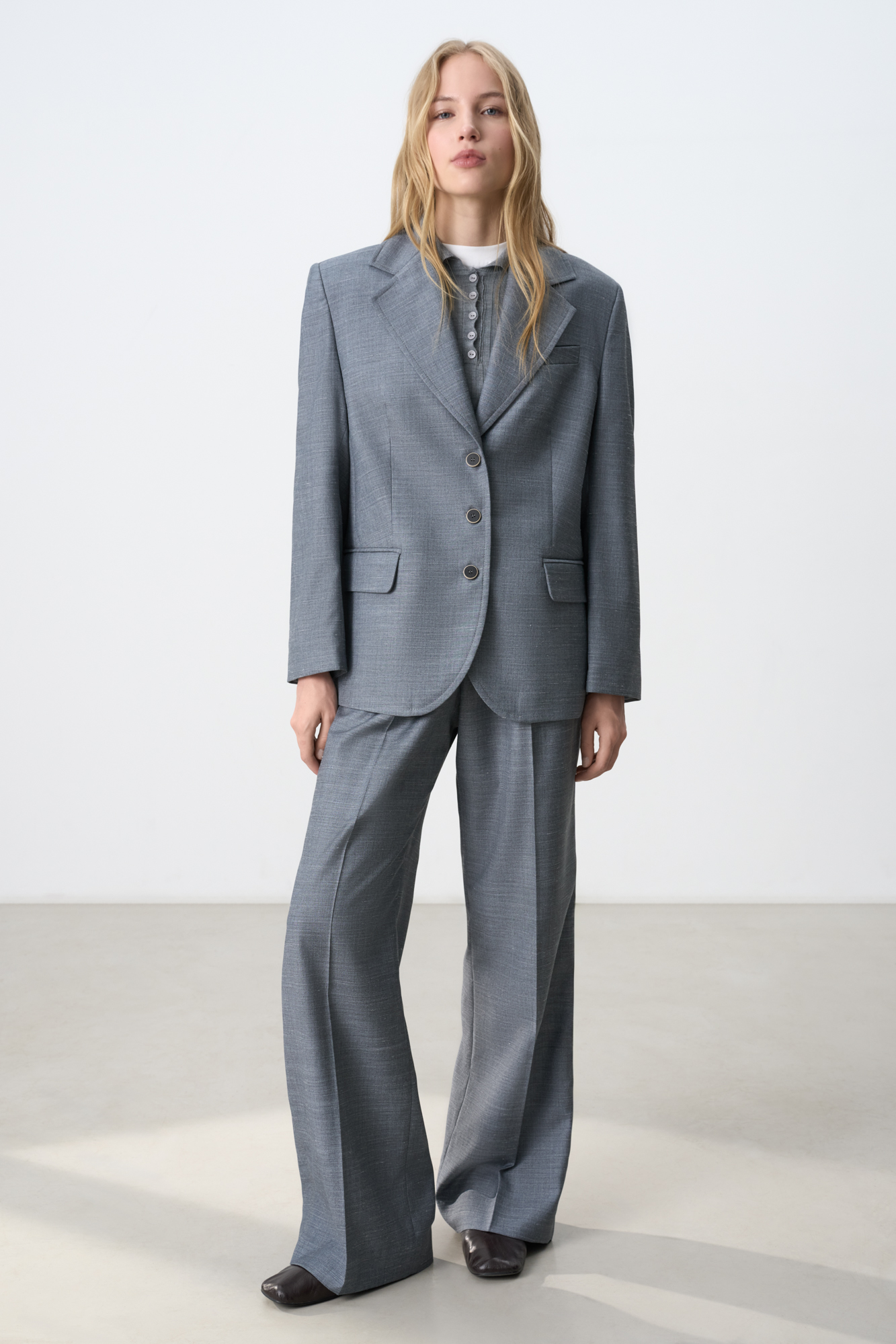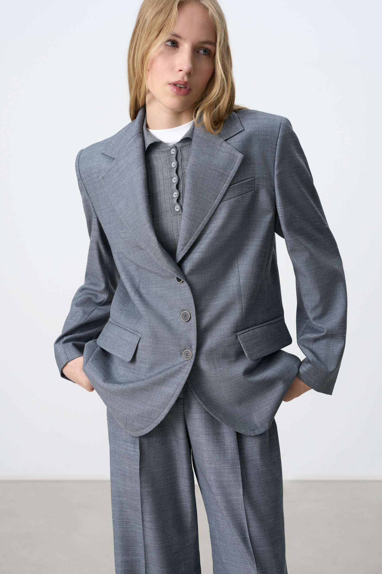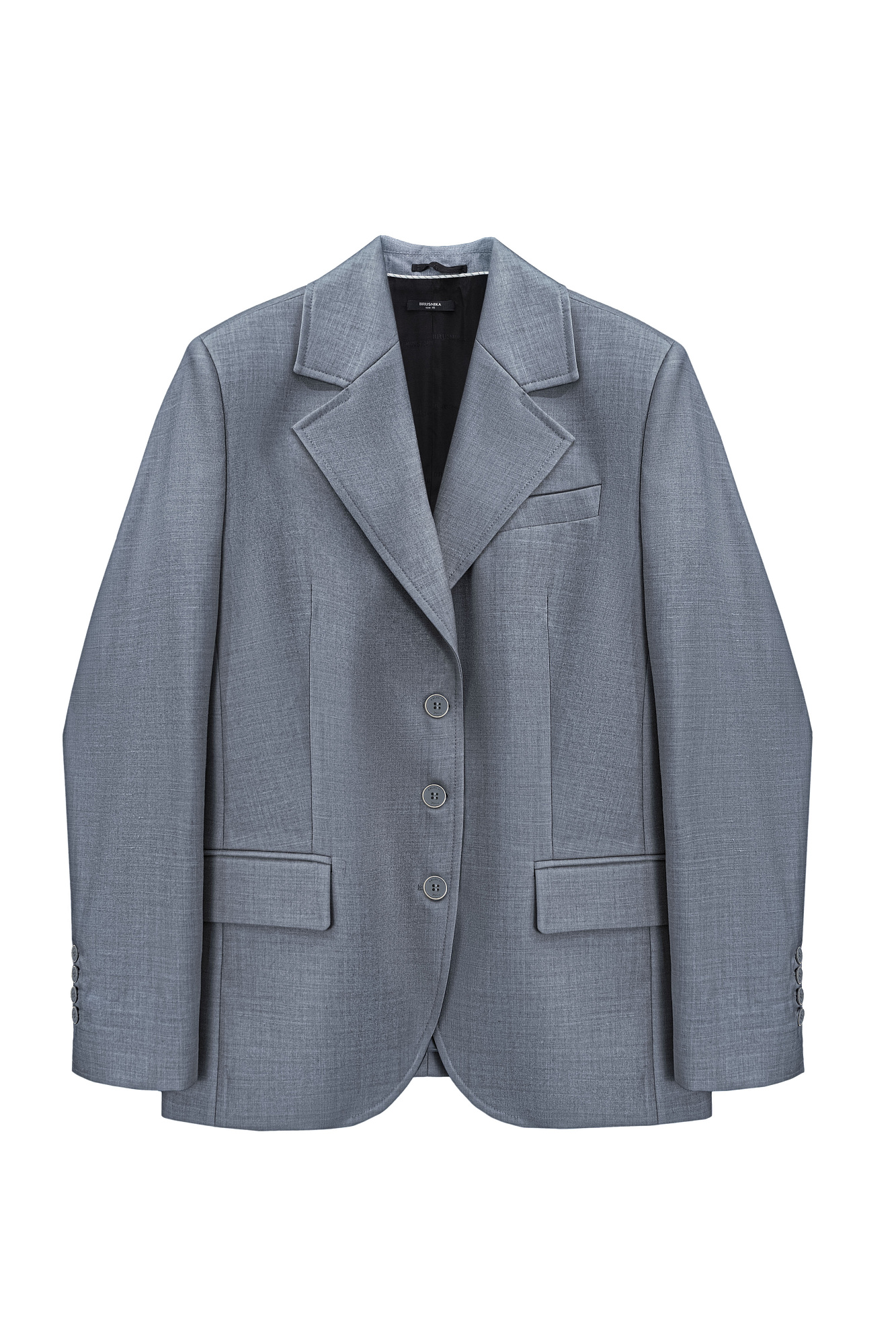 Однобортный жакет из шерсти. Модель свободного силуэта с лацканами, боковыми карманами с клапанами и карманом на груди. Застежка на три пуговицы. Изделие выполнено на подкладке. Дополнить образ можно брюками или юбкой.