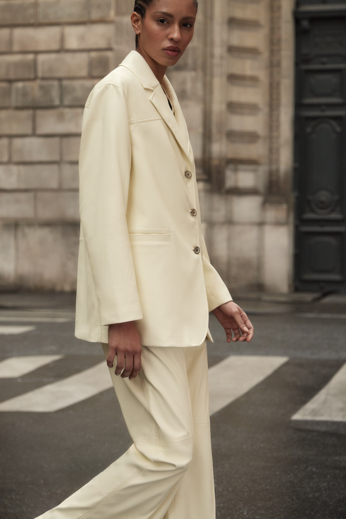 Классический однобортный жакет из экокожи. Модель прямого кроя, с отложным воротником, карманам и застежкой на пуговицы. Изделие на подкладке.