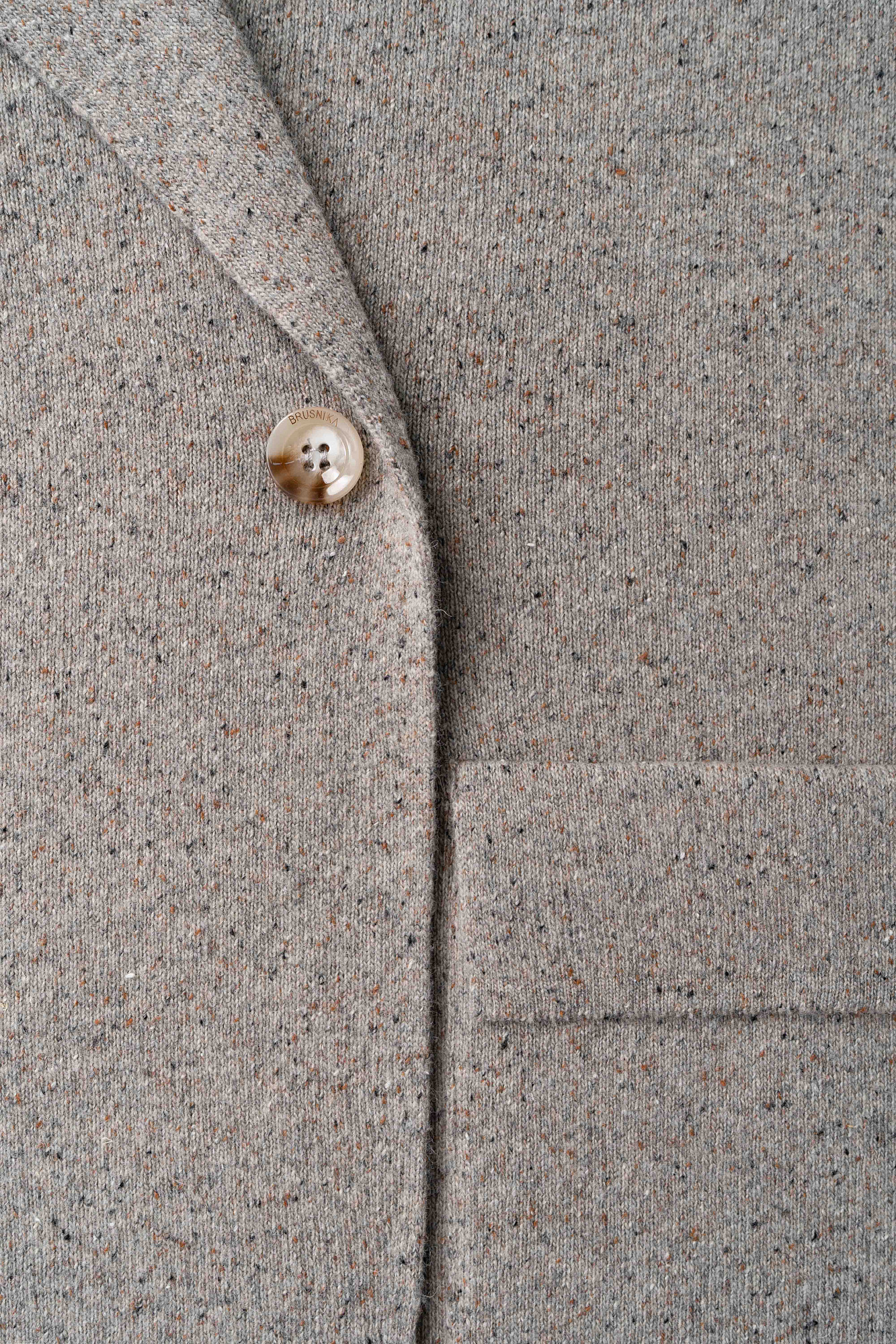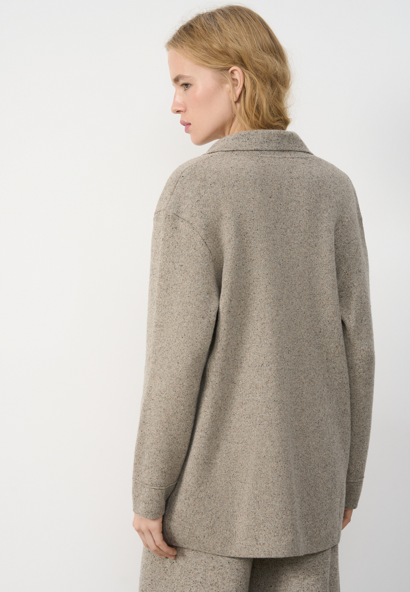 Трикотажный двубортный жакет из шерсти с добавлением вискозы и шелка. Модель прямого кроя, с лацканами, двумя накладными карманами и валиками на манжетах. Застежка на пуговицы. Без подкладки.