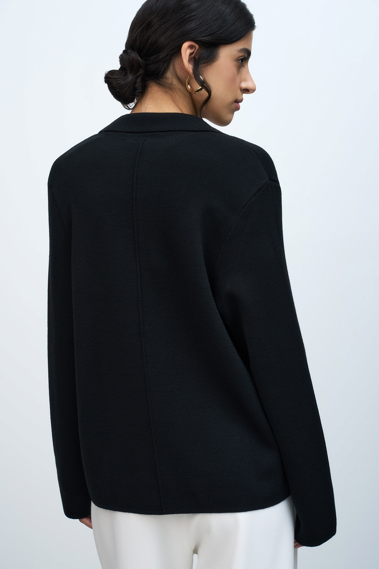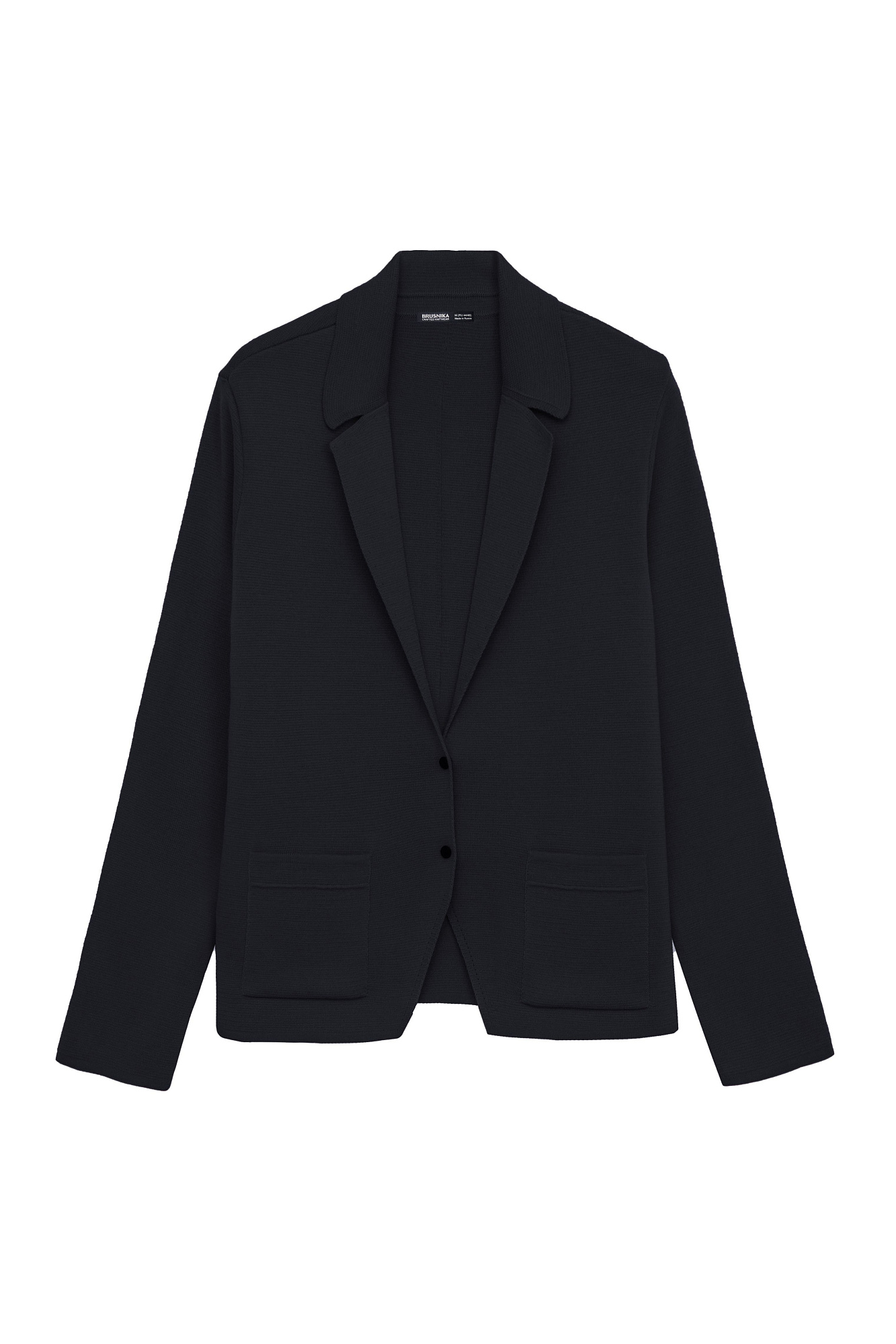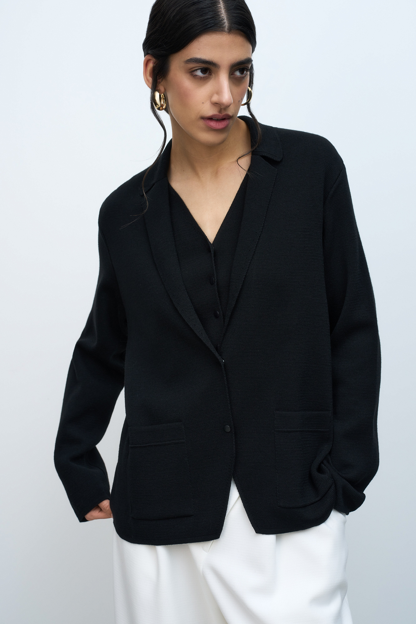 Трикотажный однобортный жакет из шерсти мериноса. Модель свободного силуэта, с узкими лацканами и двумя накладными карманами. Застежка на две кнопки. Дополнить образ можно жилетом, юбкой или брюками.