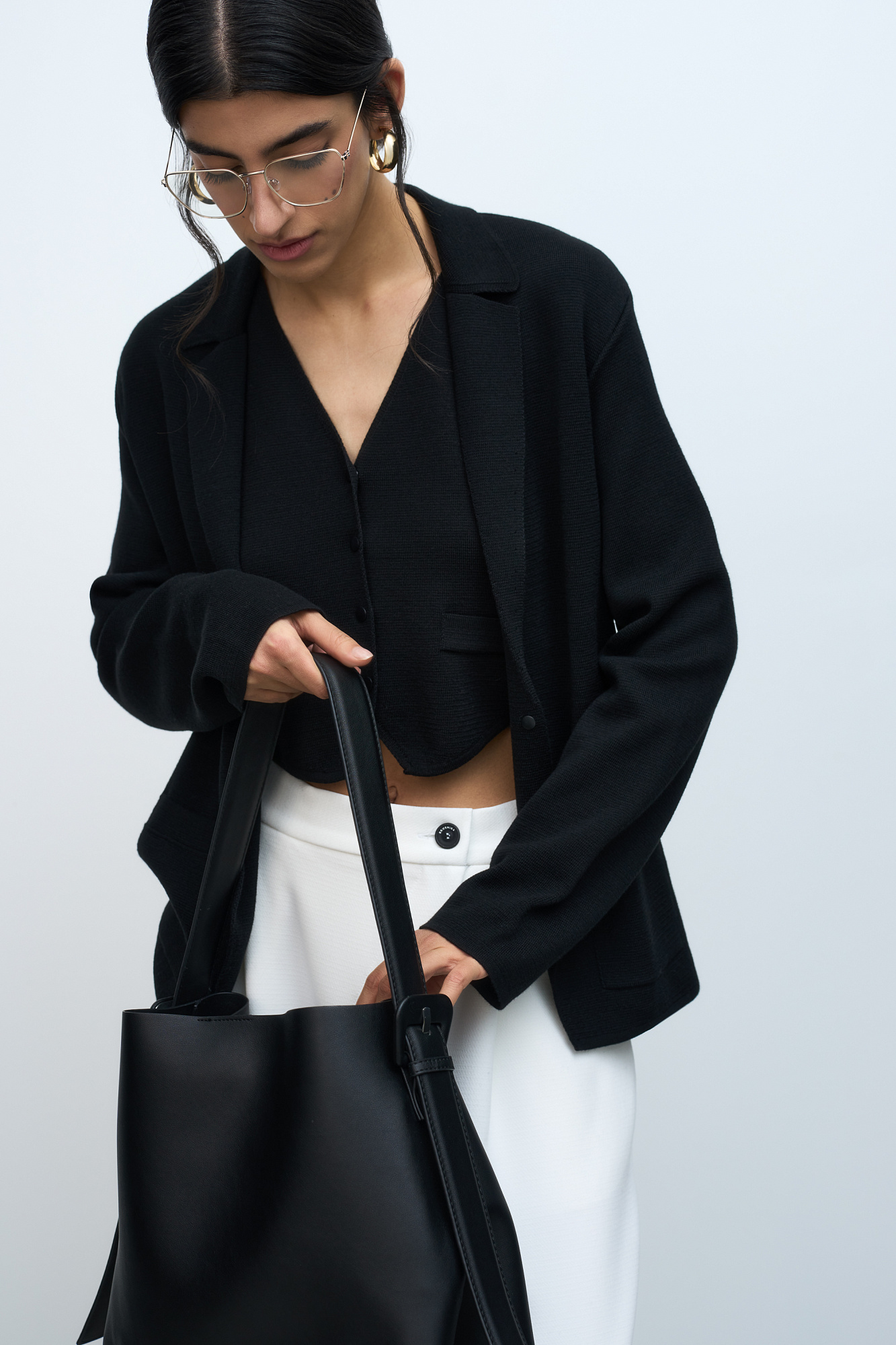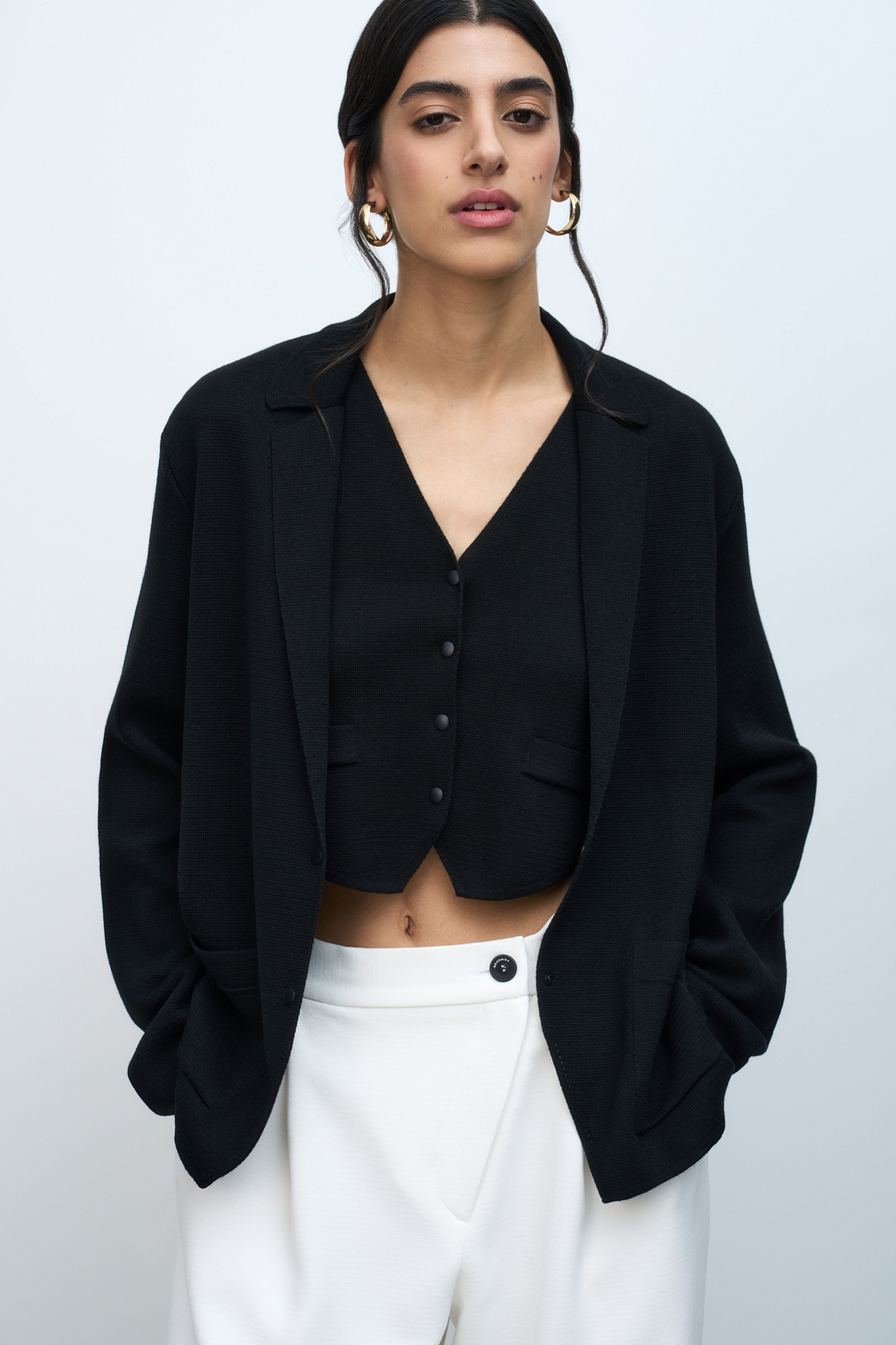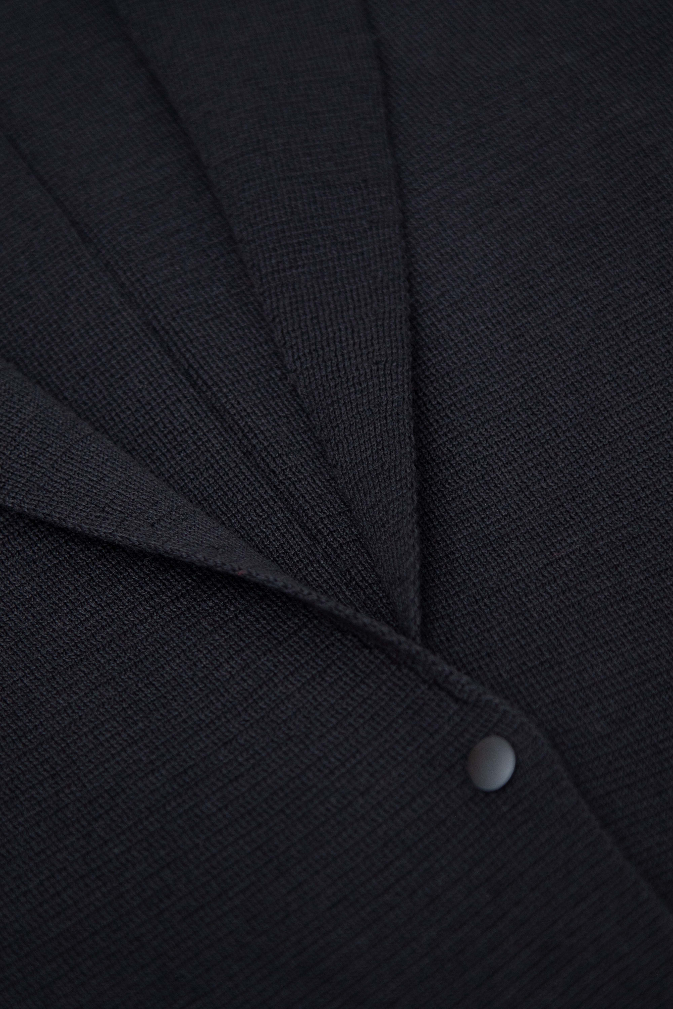 Трикотажный однобортный жакет из шерсти мериноса. Модель свободного силуэта, с узкими лацканами и двумя накладными карманами. Застежка на две кнопки. Дополнить образ можно жилетом, юбкой или брюками.