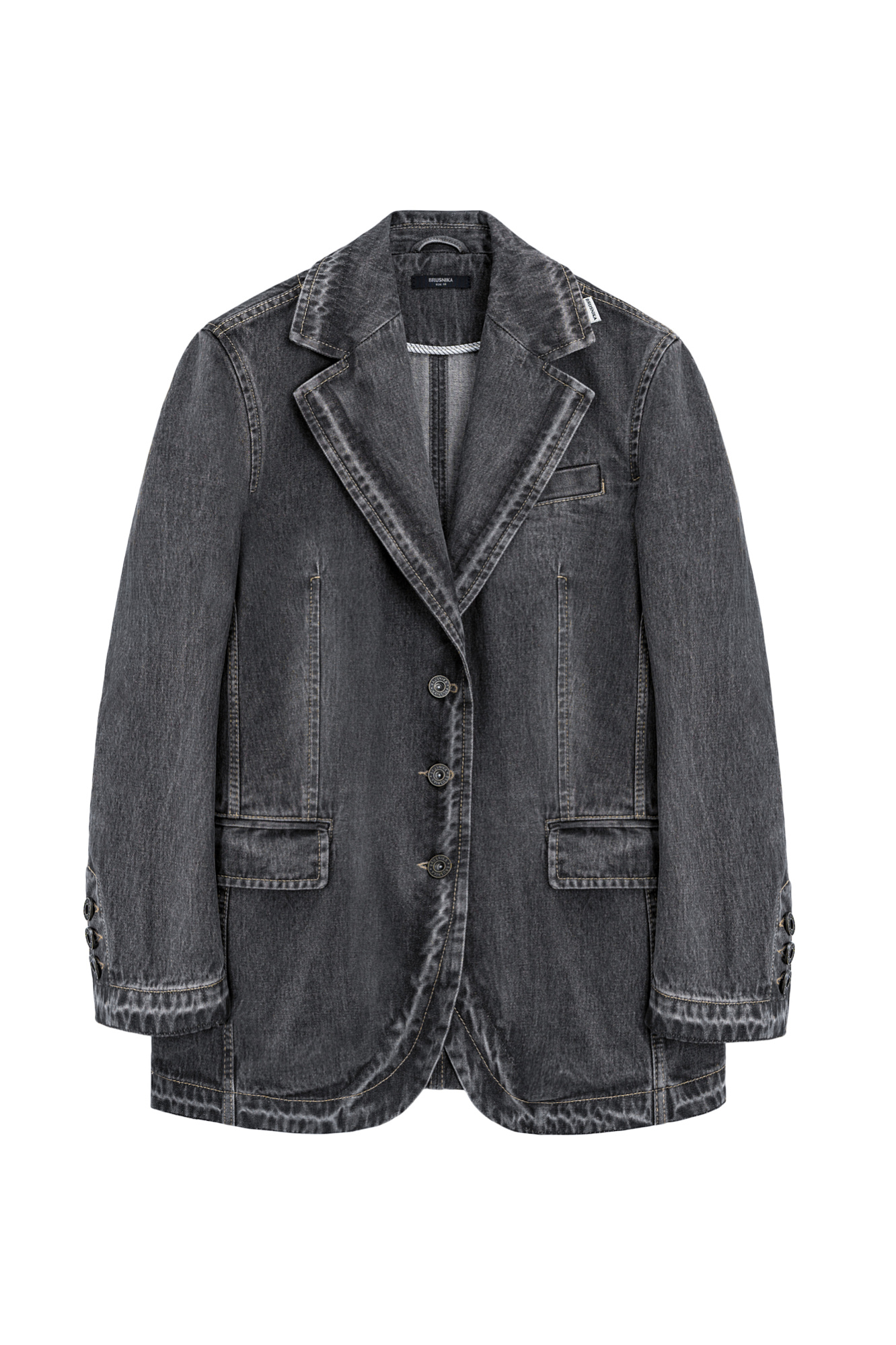 Джинсовый жакет из 100% хлопка. Модель прямого кроя с классическим английским воротником, боковыми карманами с клапанами, карманом на груди и пуговицами на манжетах. Застежка на три металлические пуговицы. Изделие без подкладки.