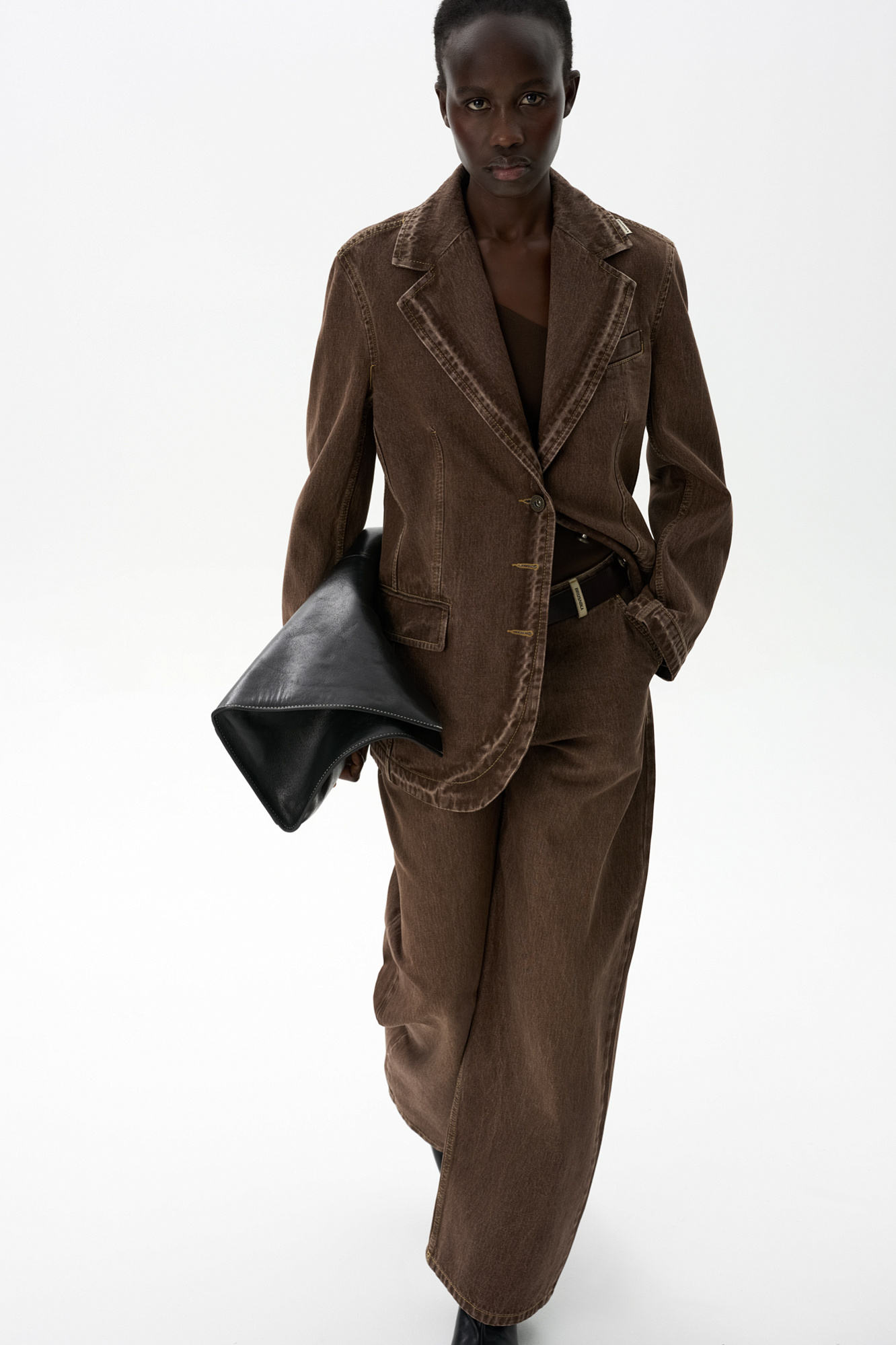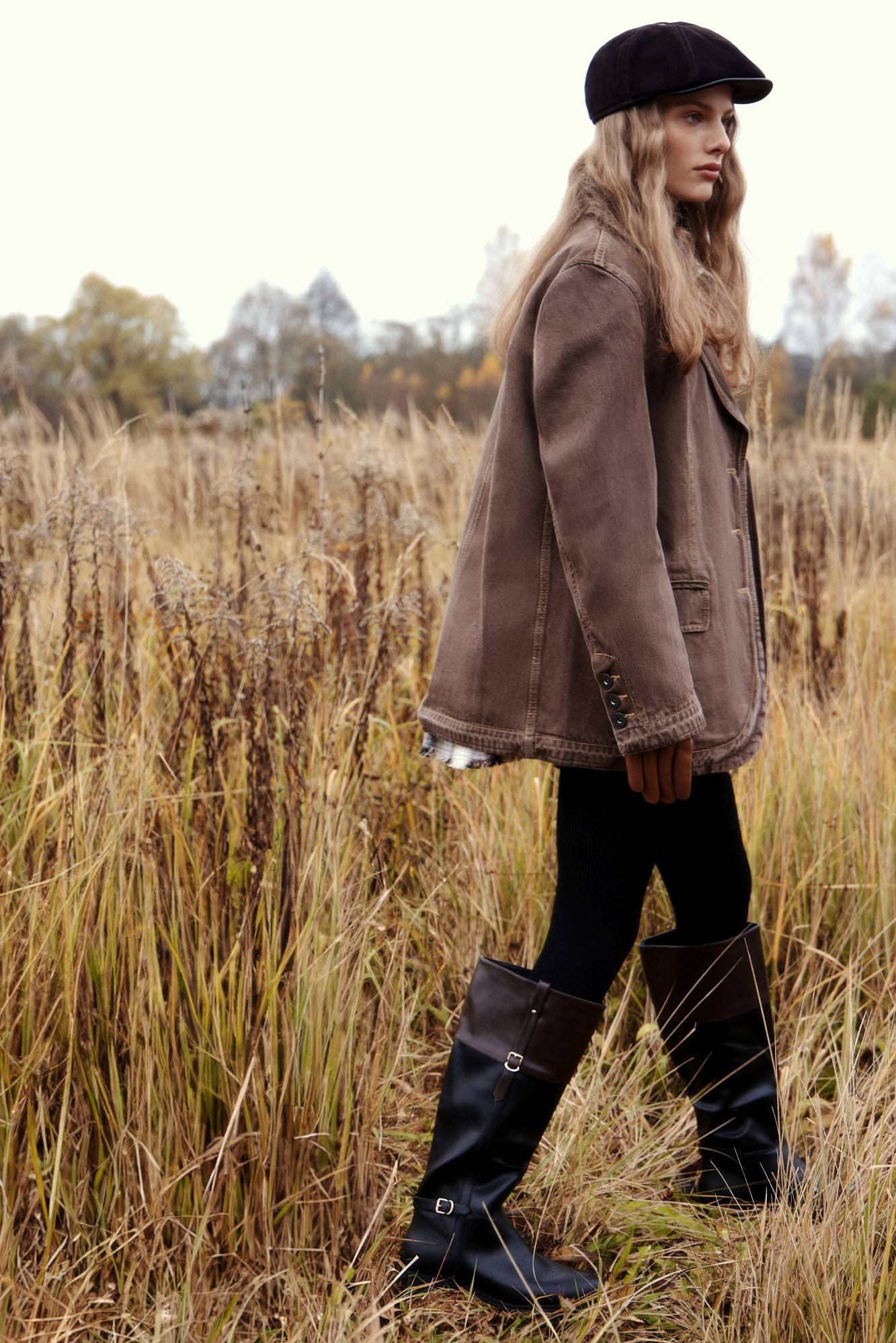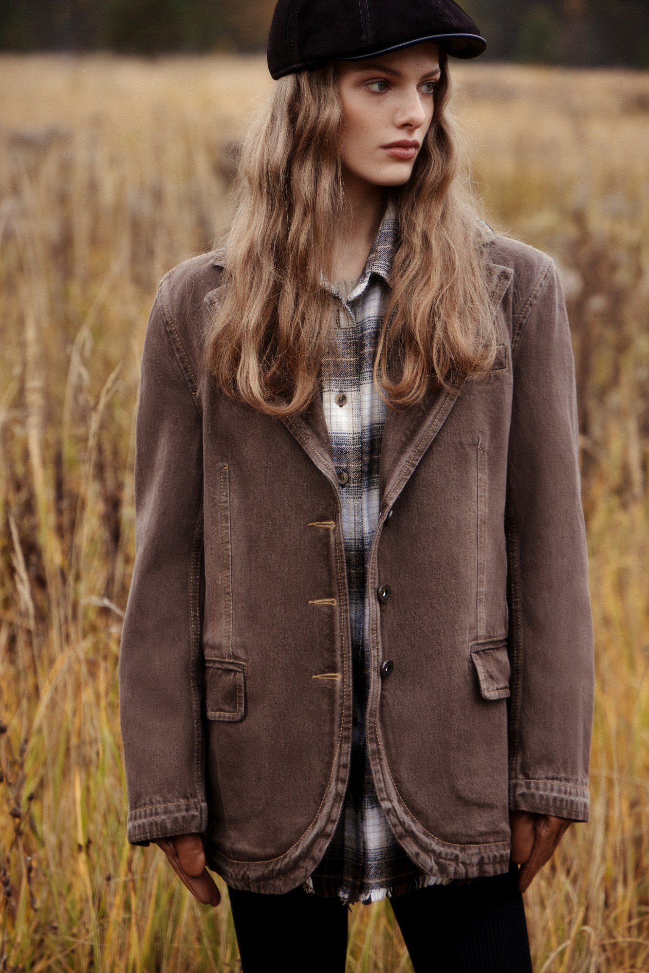 Джинсовый жакет из 100% хлопка. Модель прямого кроя с классическим английским воротником, боковыми карманами с клапанами, карманом на груди и пуговицами на манжетах. Застежка на три металлические пуговицы. Изделие без подкладки.
