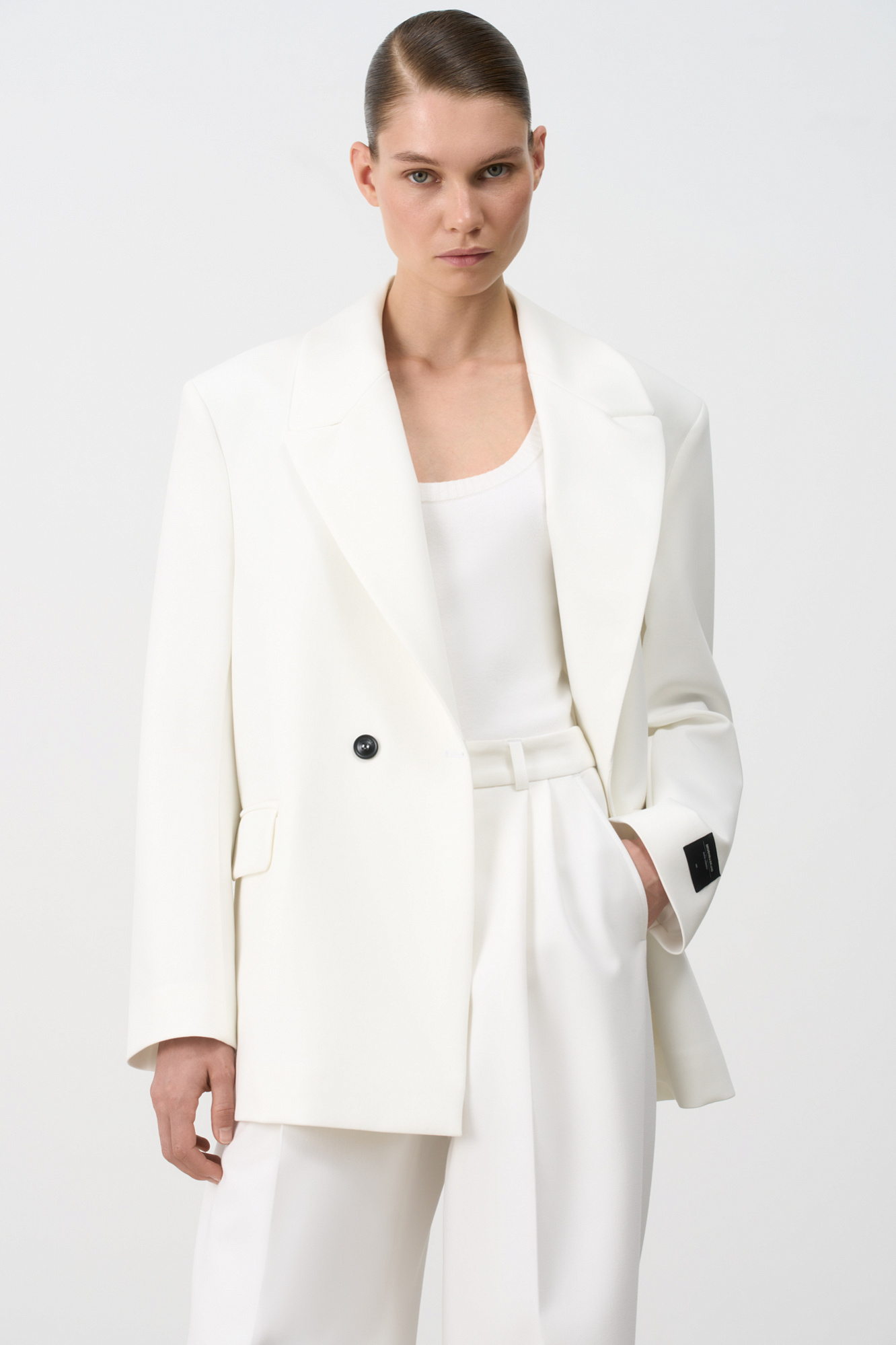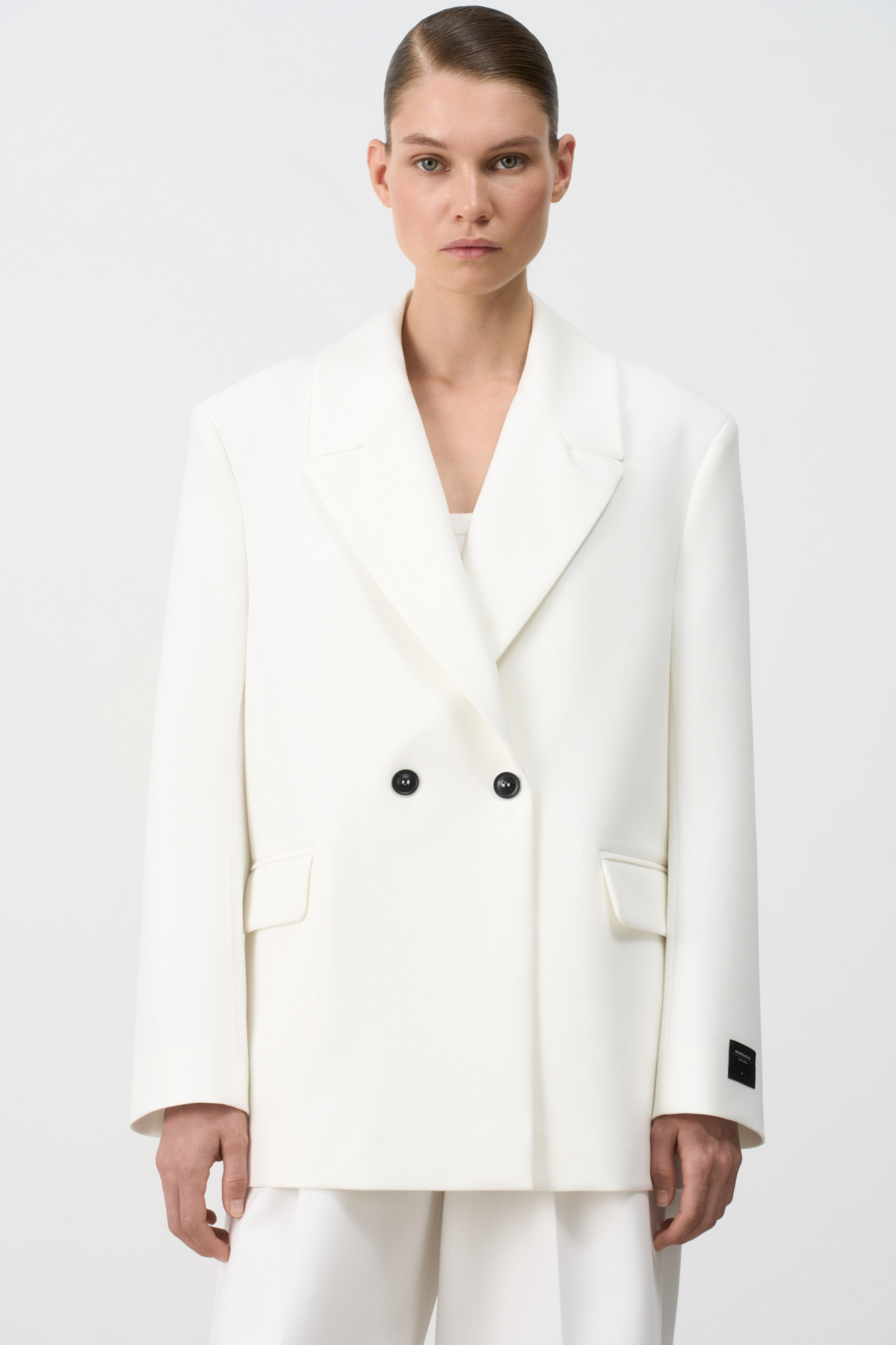 Классический жакет из поливискозы. Накладные карманы, брендированный ярлык на рукаве. Застежка на пуговицы.