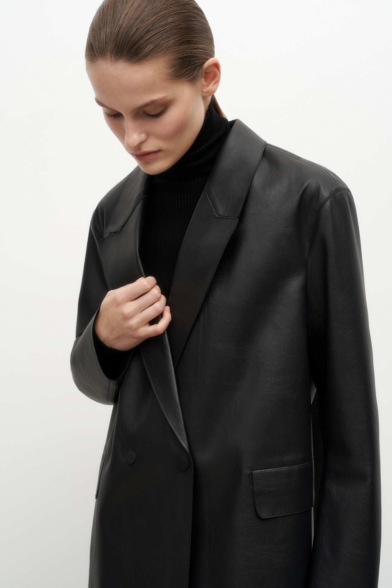 Классический жакет из двусторонней экокожи без подкладки. Английский воротник, накладные карманы. Застежка на кнопки.