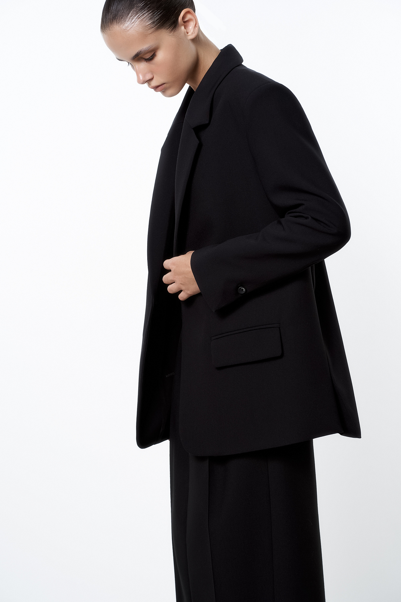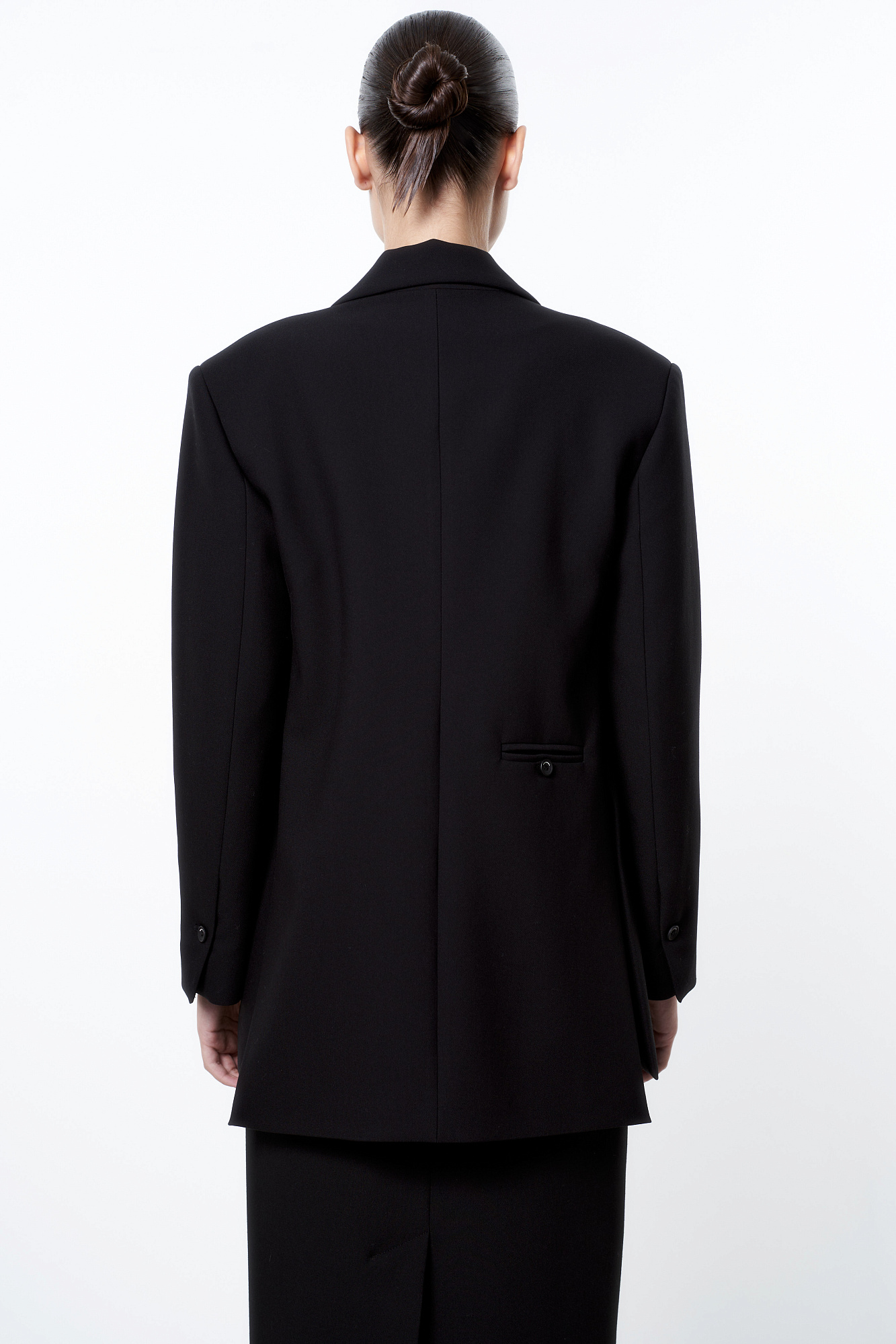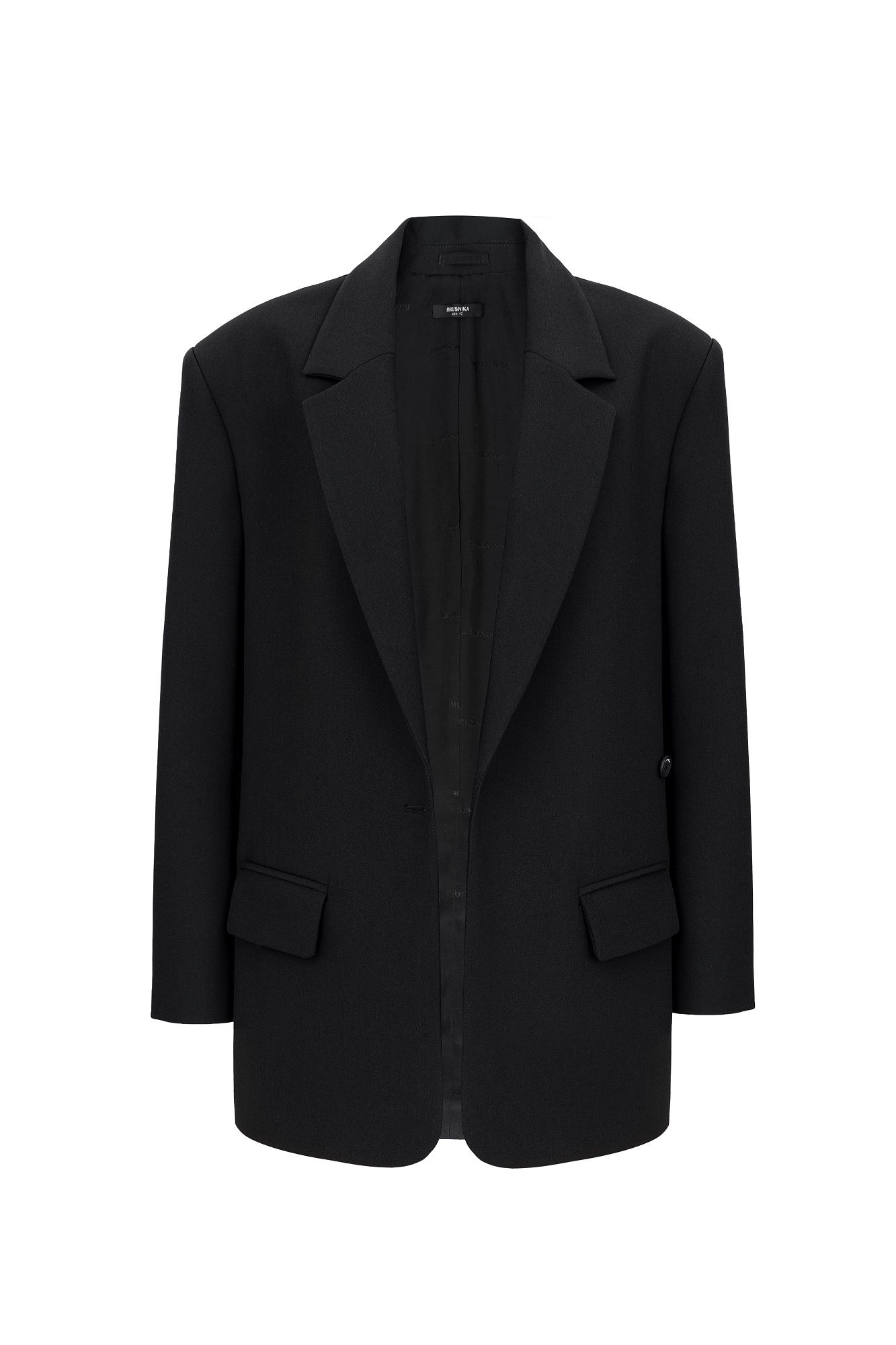 Классический однобортный жакет с застежкой на запах. Модель прямого кроя с прямоугольными лацканами. Манжеты с пуговицами, передние карманы и карман сзади. Брендированная подкладка в тон.