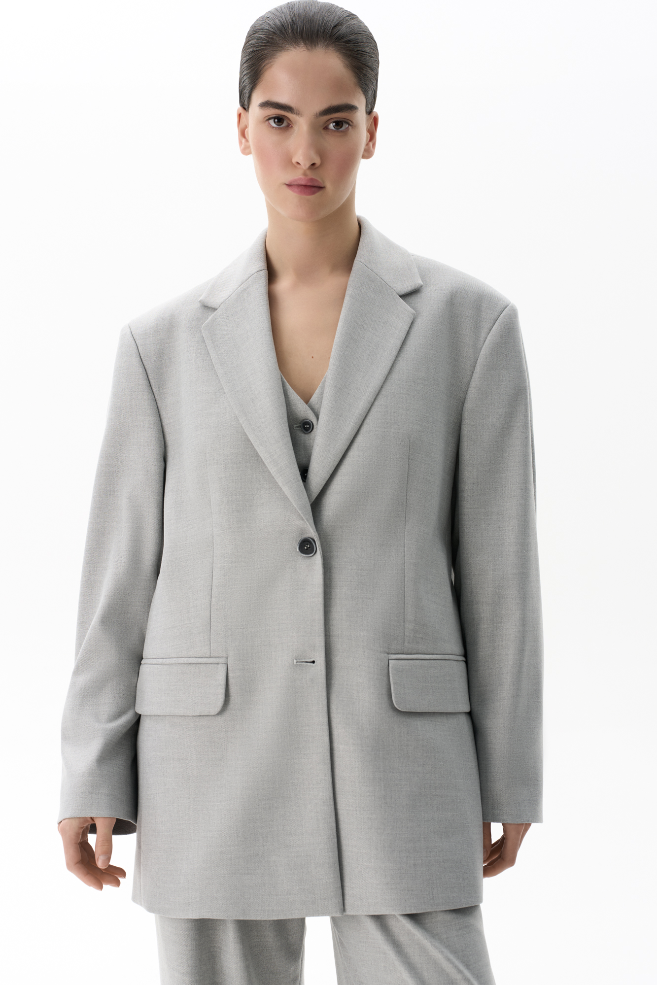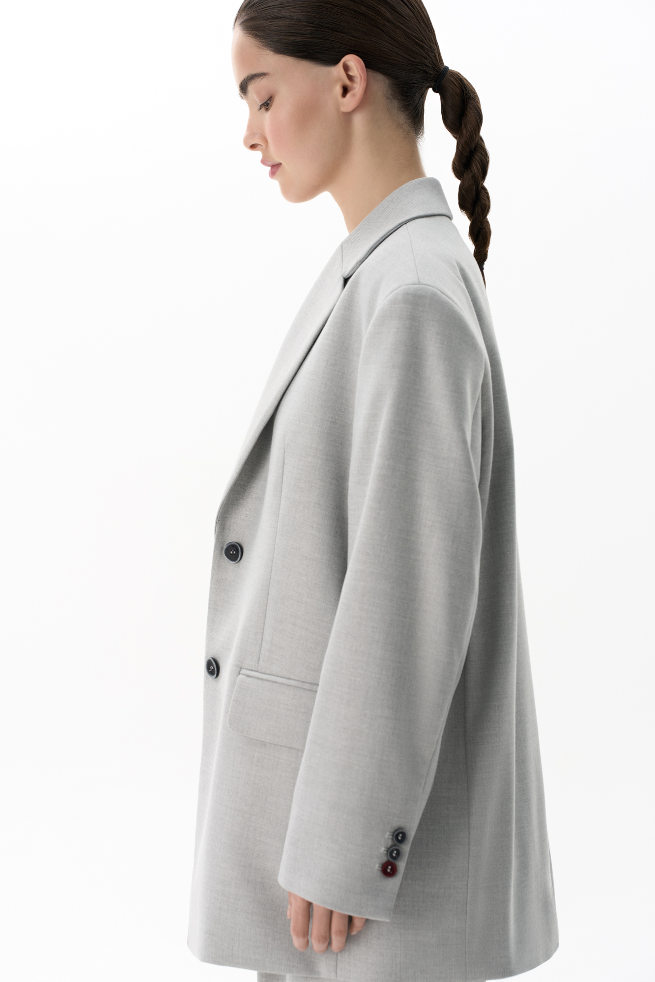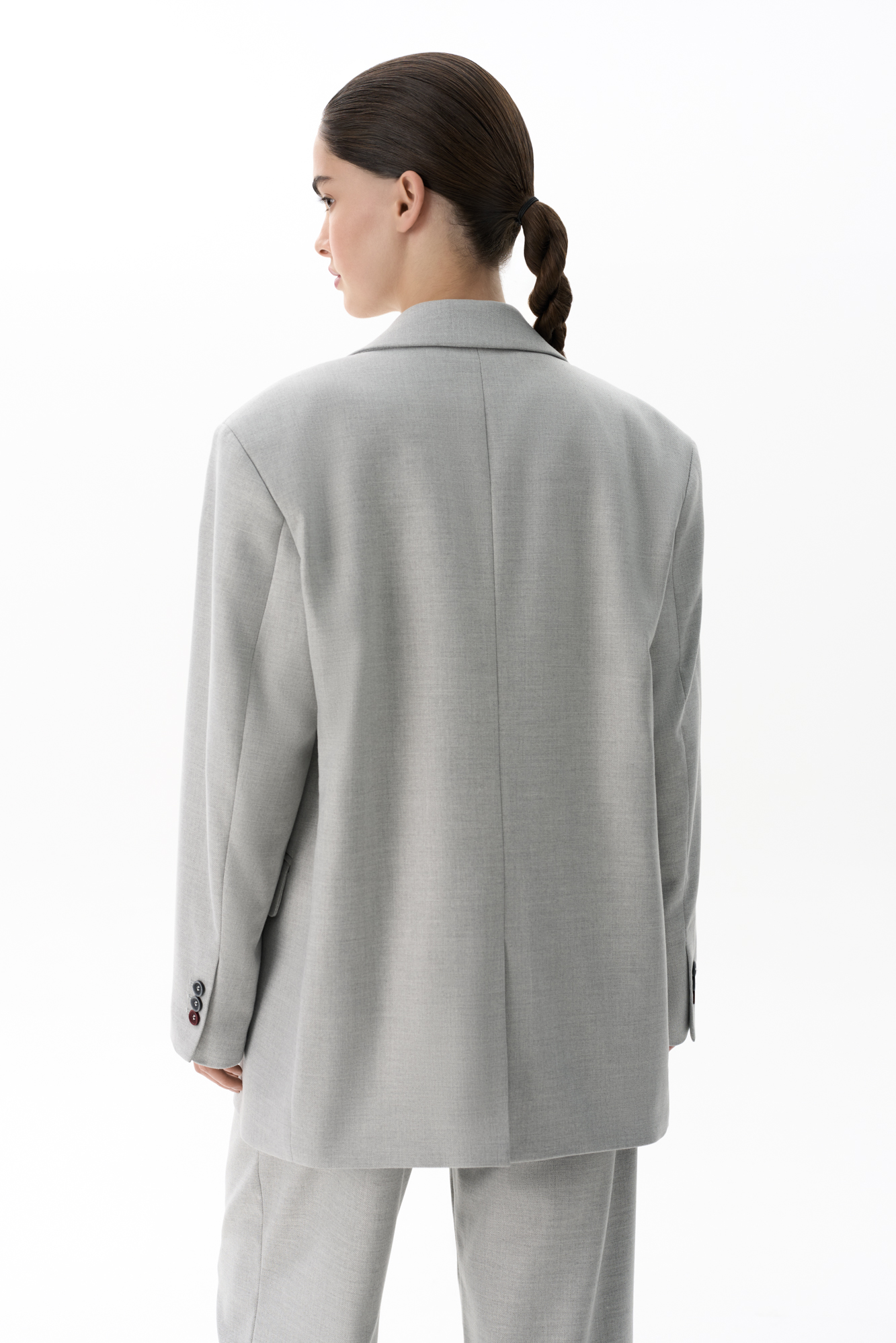 Однобортный oversize жакет из поливискозы. Модель прямого кроя с прямоугольными лацканами, манжетами на пуговицах и прорезными карманами с клапаном. Изделие на подкладке.