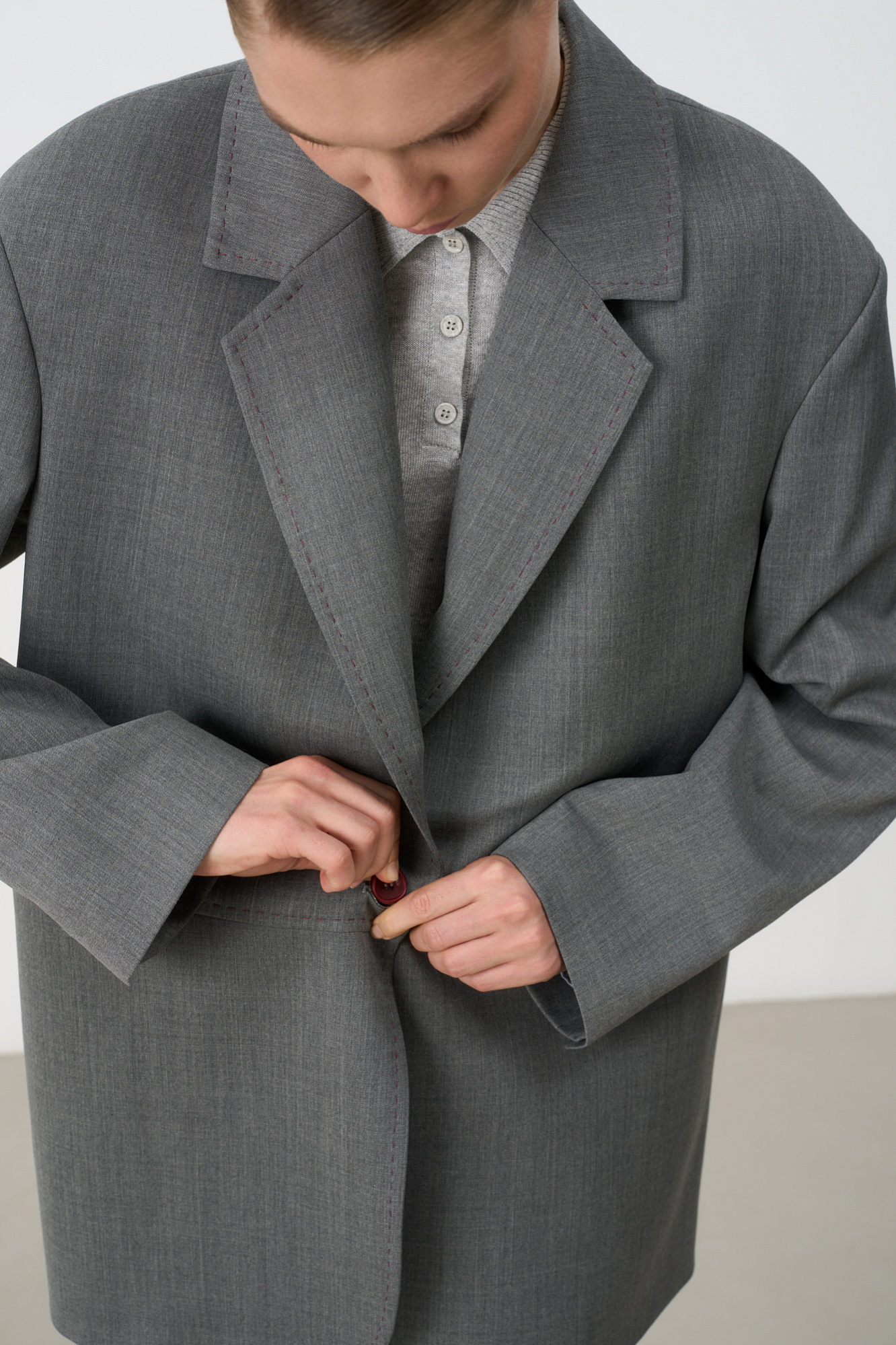 Однобортный жакет с карманами спереди. Модель свободного силуэта со спущенной линией плеча. Дополнить образ можно брюками в таком же стиле.