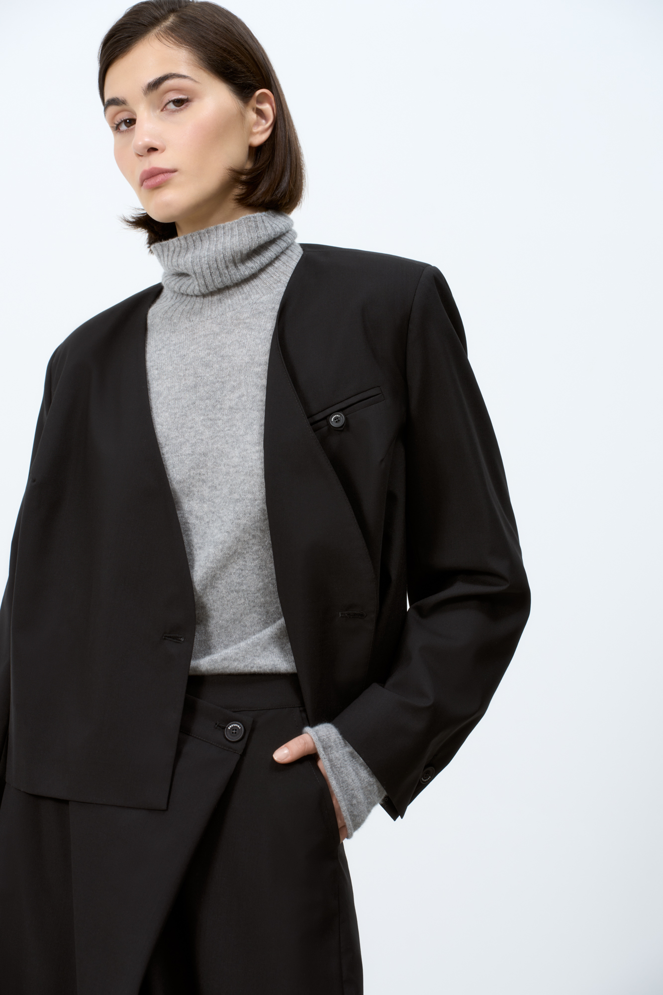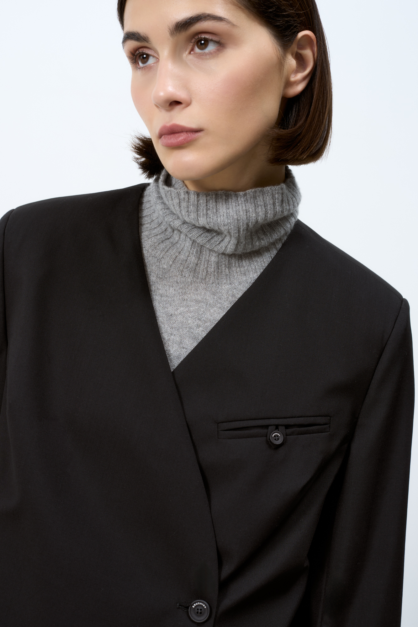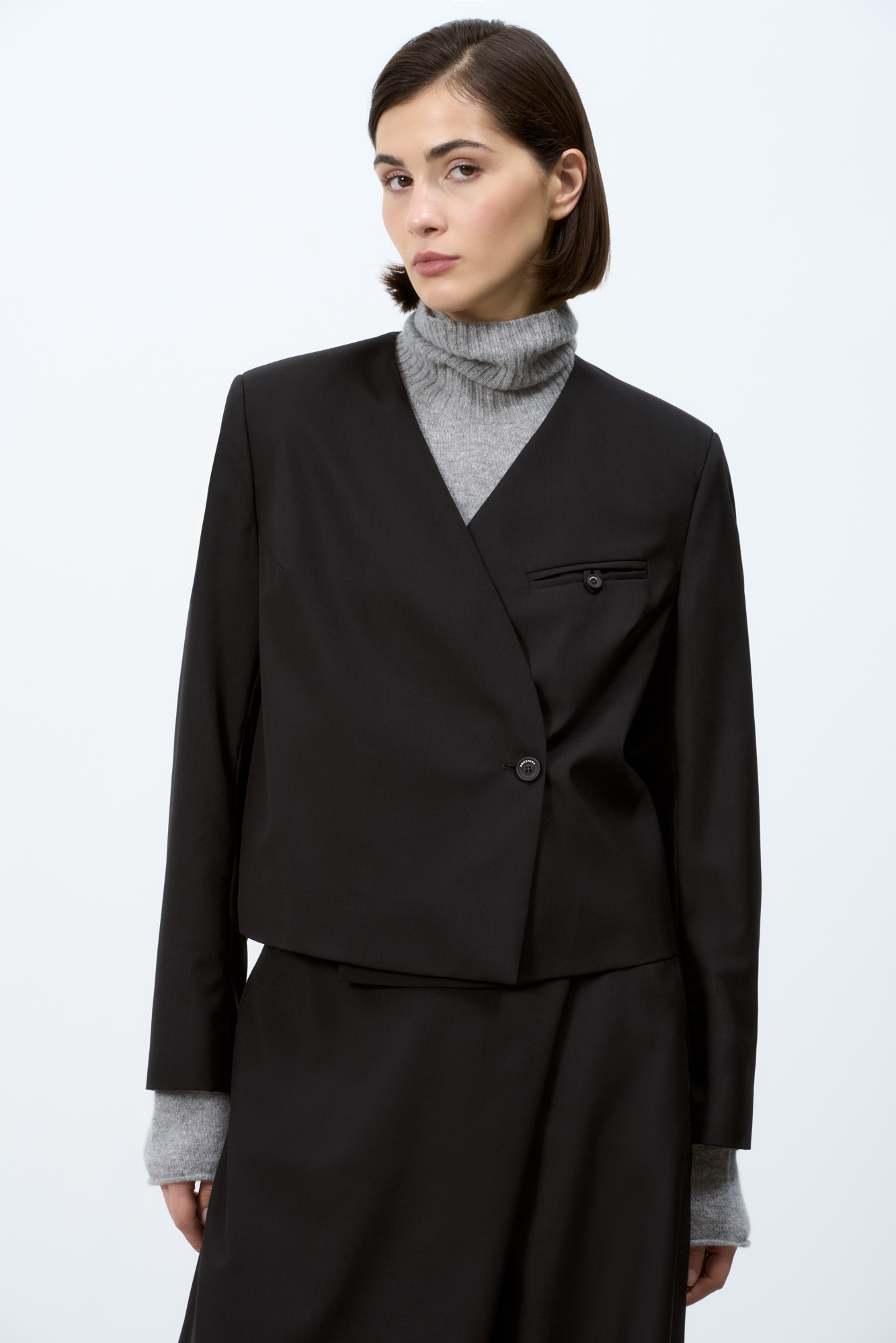 Укороченный жакет на запах. Модель приталенного силуэта с карманом на груди. Застежка на пуговицу. Дополнить образ можно брюками.