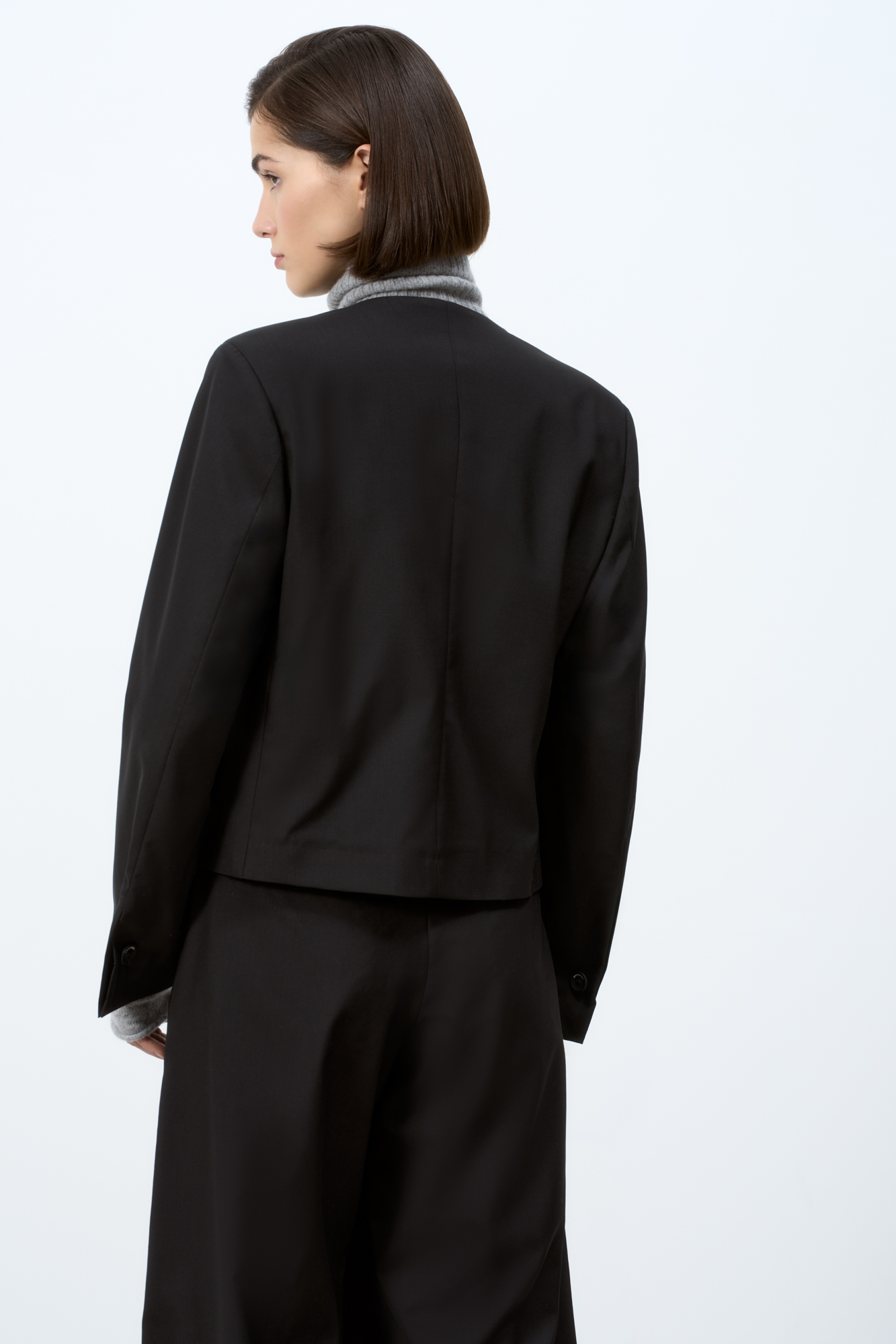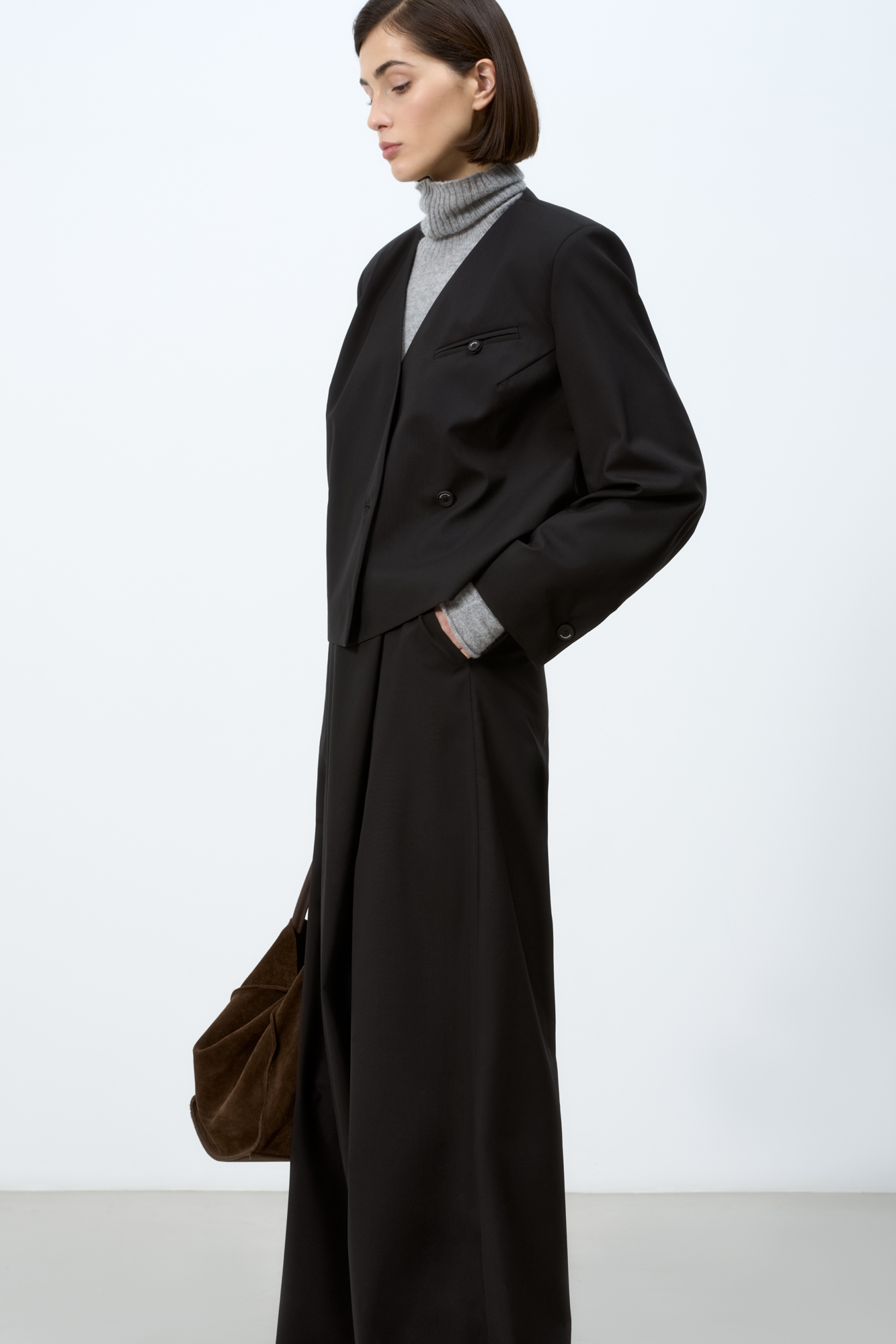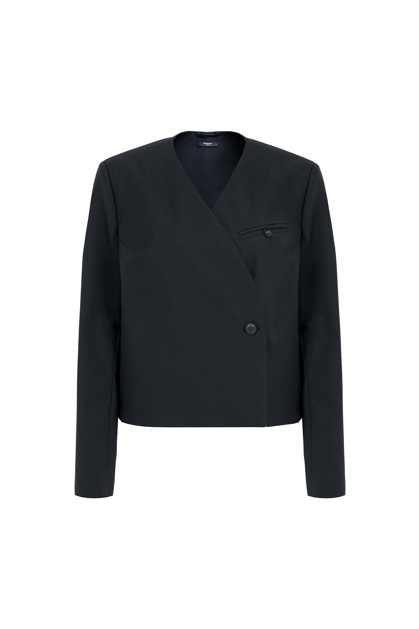 Укороченный жакет на запах. Модель приталенного силуэта с карманом на груди. Застежка на пуговицу. Дополнить образ можно брюками.