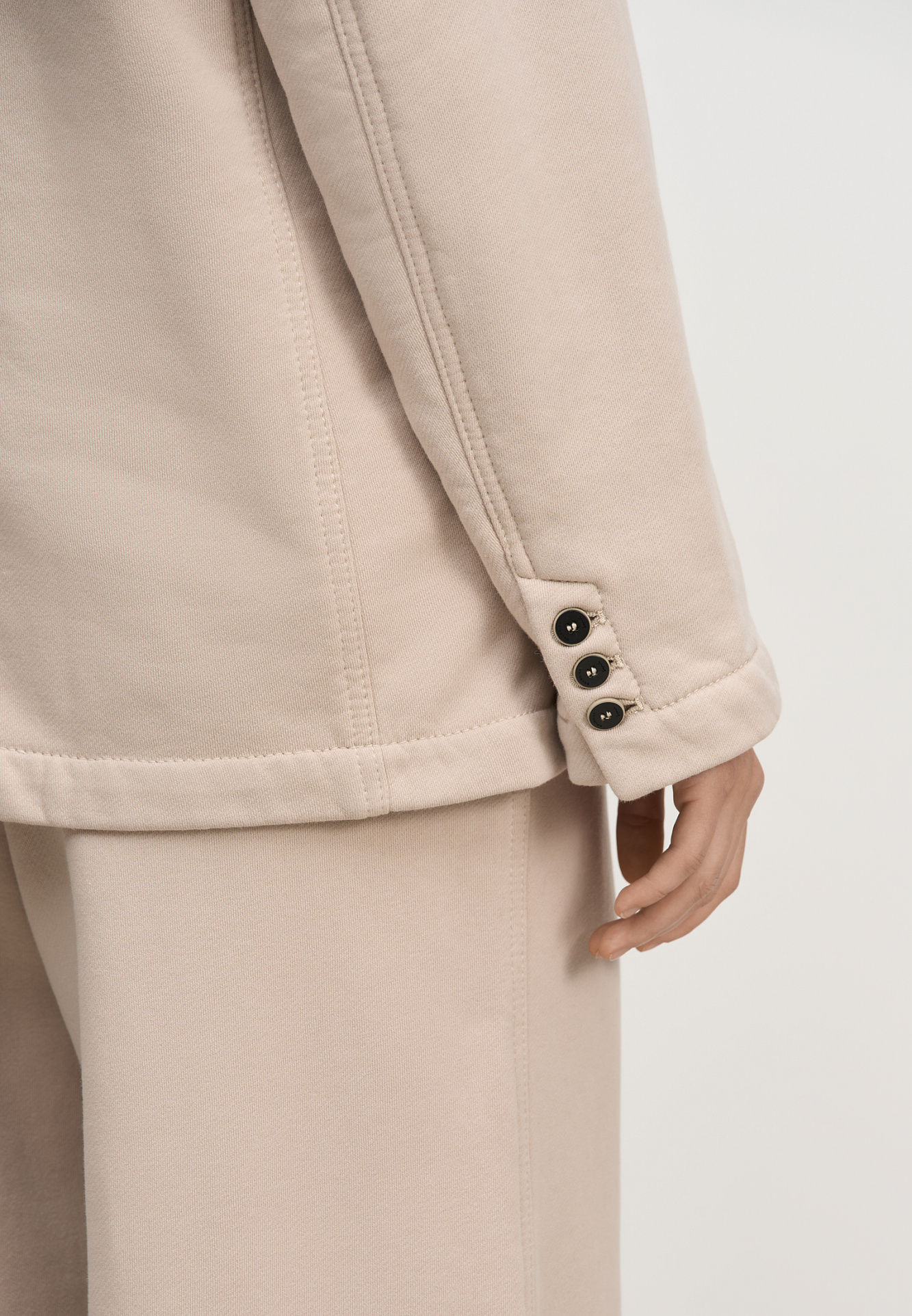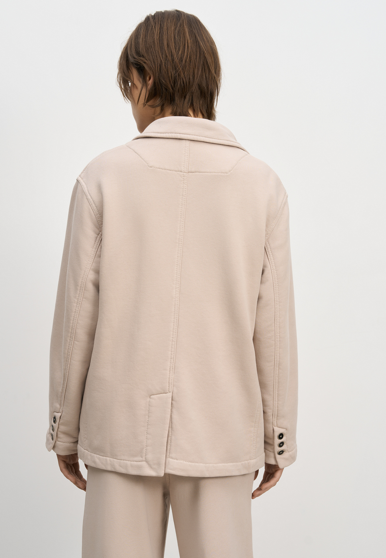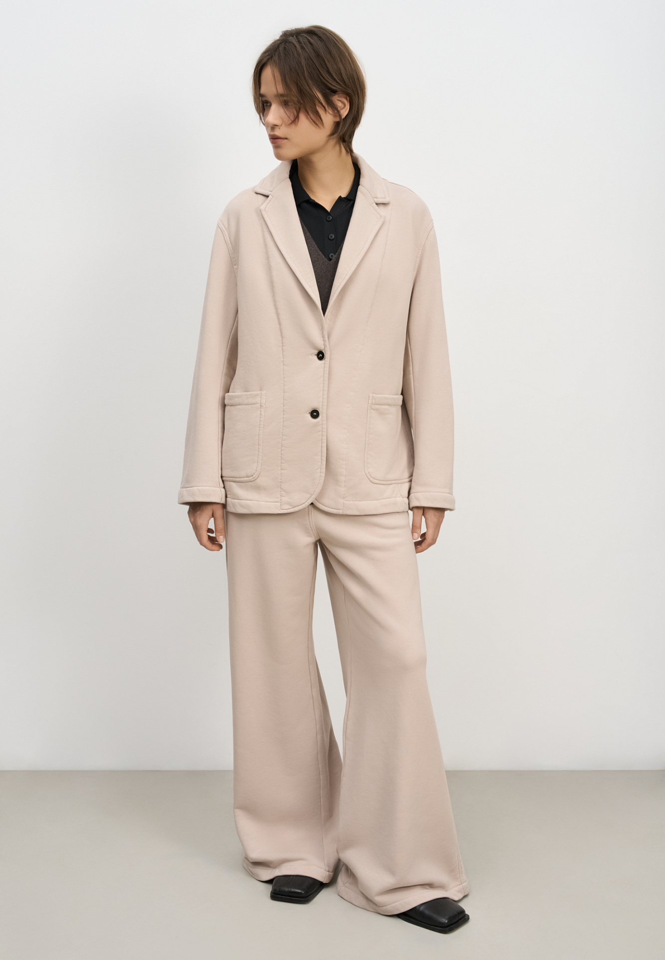 Однобортный жакет свободного силуэта. Модель с накладными карманами, спущенной линией плеча и контрастной отстрочкой. Дополнить образ можно брюками в таком же стиле.