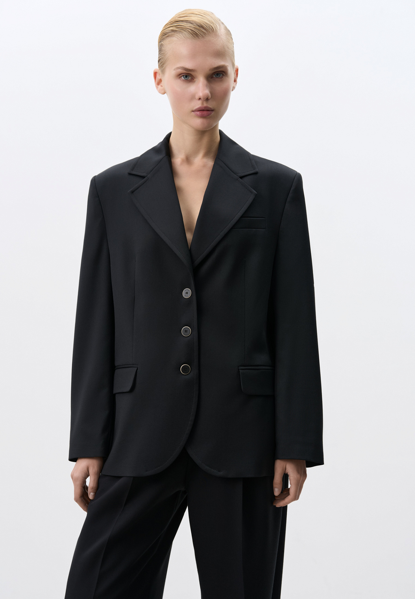 Однобортный жакет из шерсти. Модель свободного силуэта с лацканами, боковыми карманами с клапанами и карманом на груди. Застежка на три пуговицы. Изделие выполнено на подкладке. Дополнить образ можно брюками или юбкой.